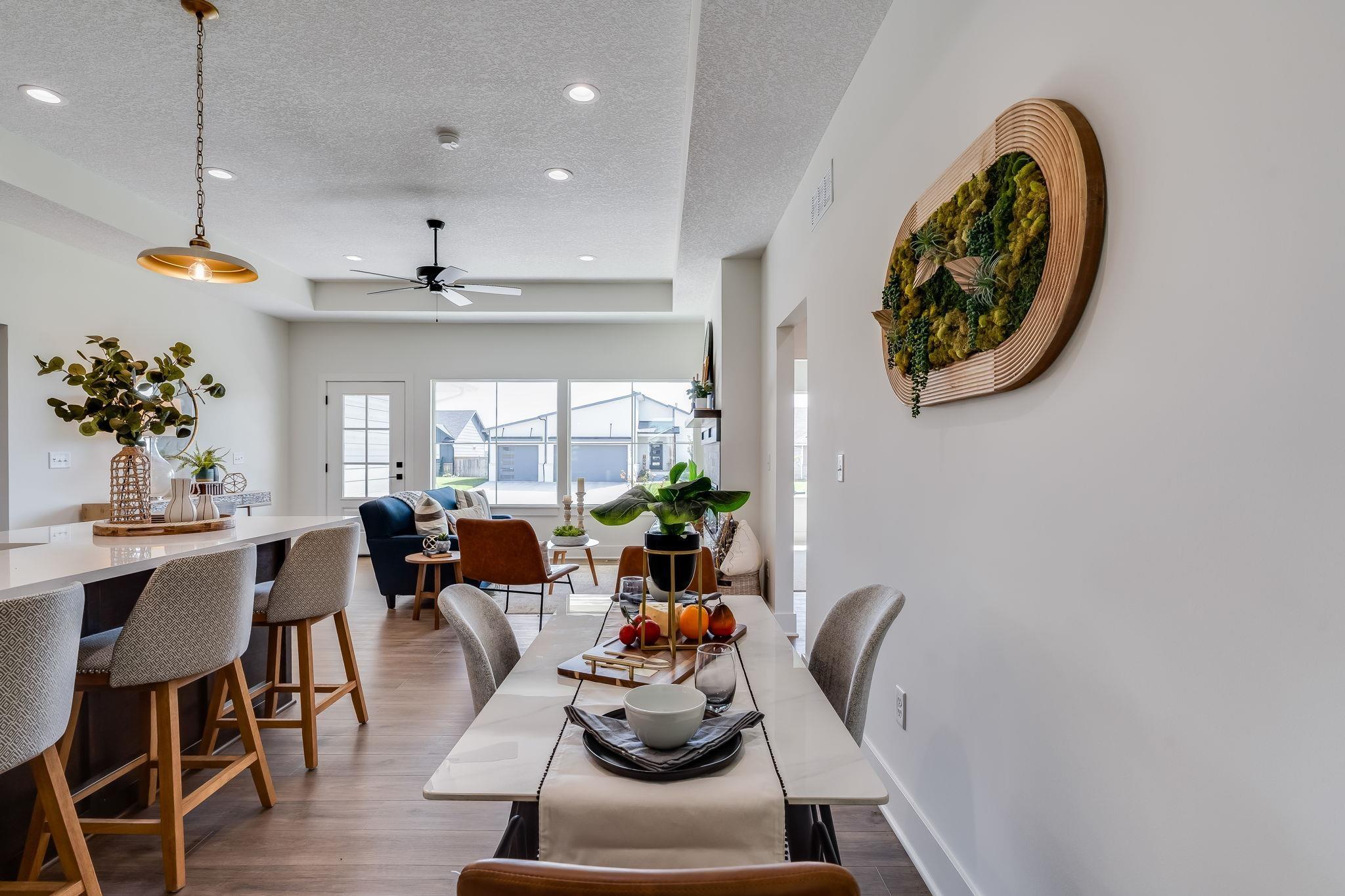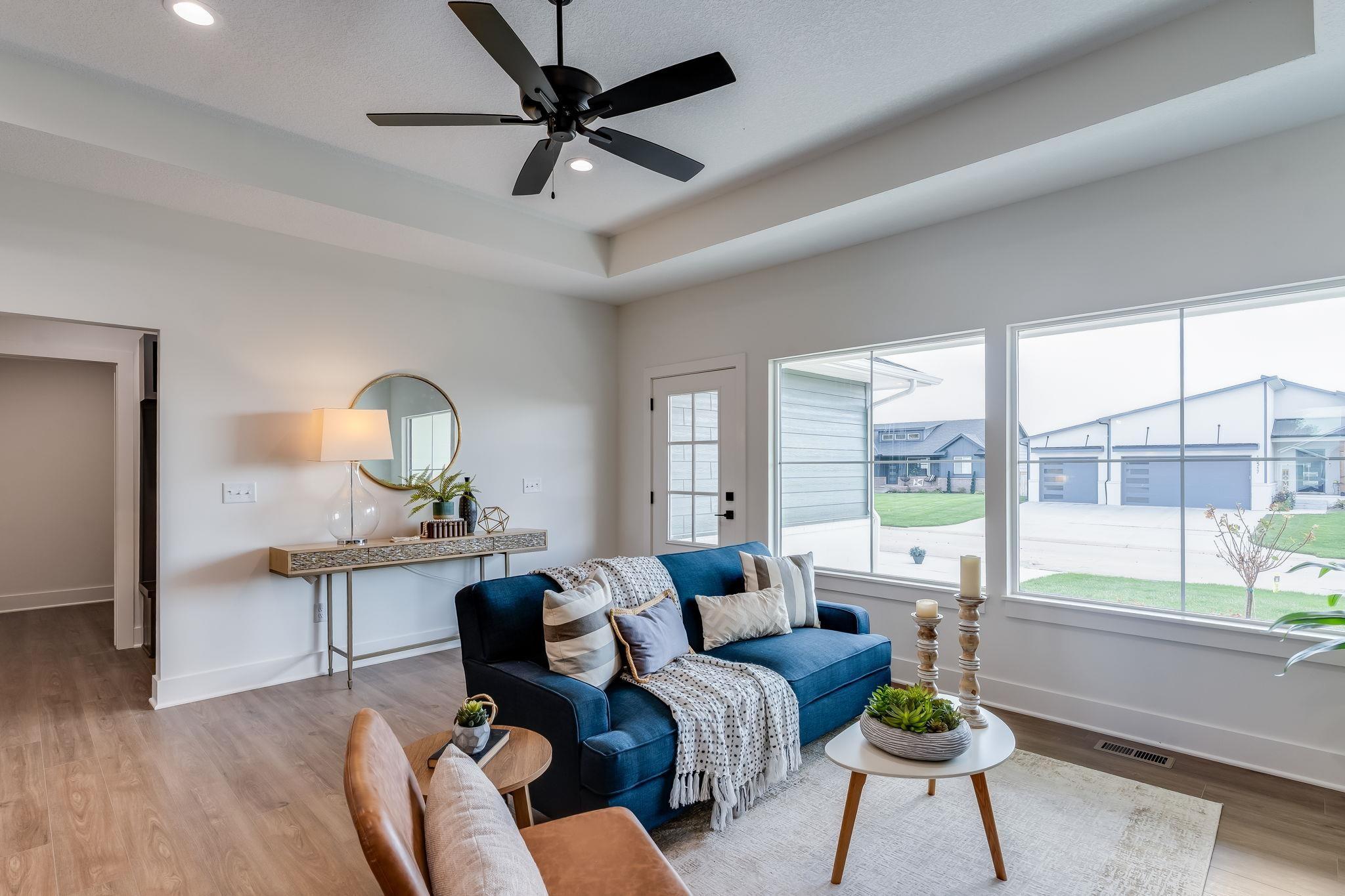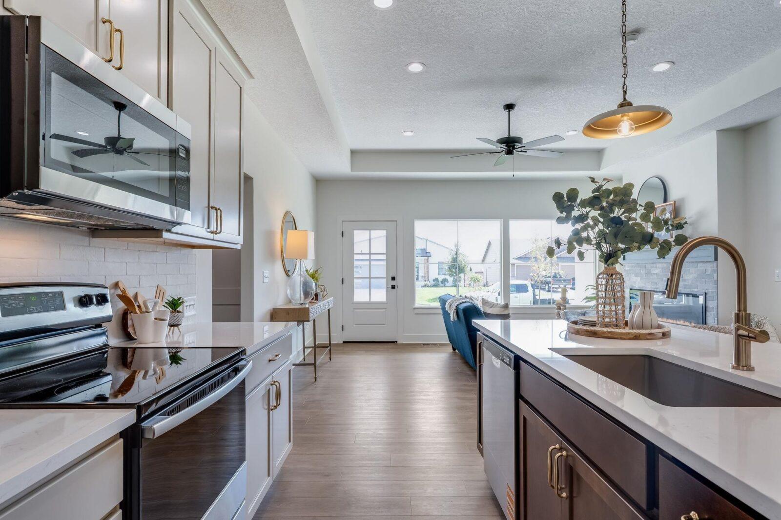 The Kinsley by TW Custom Homes offers 5 bedrooms and 3 bathrooms with a thoughtfully designed, open-concept layout. The heart of the home features a bright living area with a tray ceiling, seamlessly connected to the dining space and kitchen—perfect for everyday living and entertaining. The stunning primary suite is a true retreat, showcasing a tray ceiling, custom tile shower, and spacious walk-in closet. Conveniently located just outside the primary suite, the laundry room is tucked into its own space with a closable door to keep everything neat and organized. The fully finished basement expands your living space with a large family room, two additional bedrooms, one bathroom, and a generous storage area. Step outside to a massive covered concrete patio from the mid-level walkout—ideal for gatherings, grilling, or enjoying the outdoors in any season. An irrigation well, sod, and sprinkler system are included. Taxes and specials are estimated. This home backs to a tree row for additional privacy and is on a cul-de-sac street for added safety. All information is deemed reliable but not guaranteed and is subject to change without notice.
