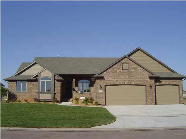 Tax est. Beautiful new three bedroom ranch with curved staircase. Large main floor family room with beamed ceiling, stone fireplace, granite counter on island and kitchen cabinets. Knotty alder woodworking, half bath off kitchen, mail floor utility, oversized garage. Covered deck with composition decking and wrought iron railing. Covered front porch with sitting area. Sprinkler, lawn and landscaping included. Exterior has brick and stone on the front and is kocated on clu de sac with beautiful fountain entry. Information deemed reliable but not guaranteed. Agents must call for appointment. Security System on!