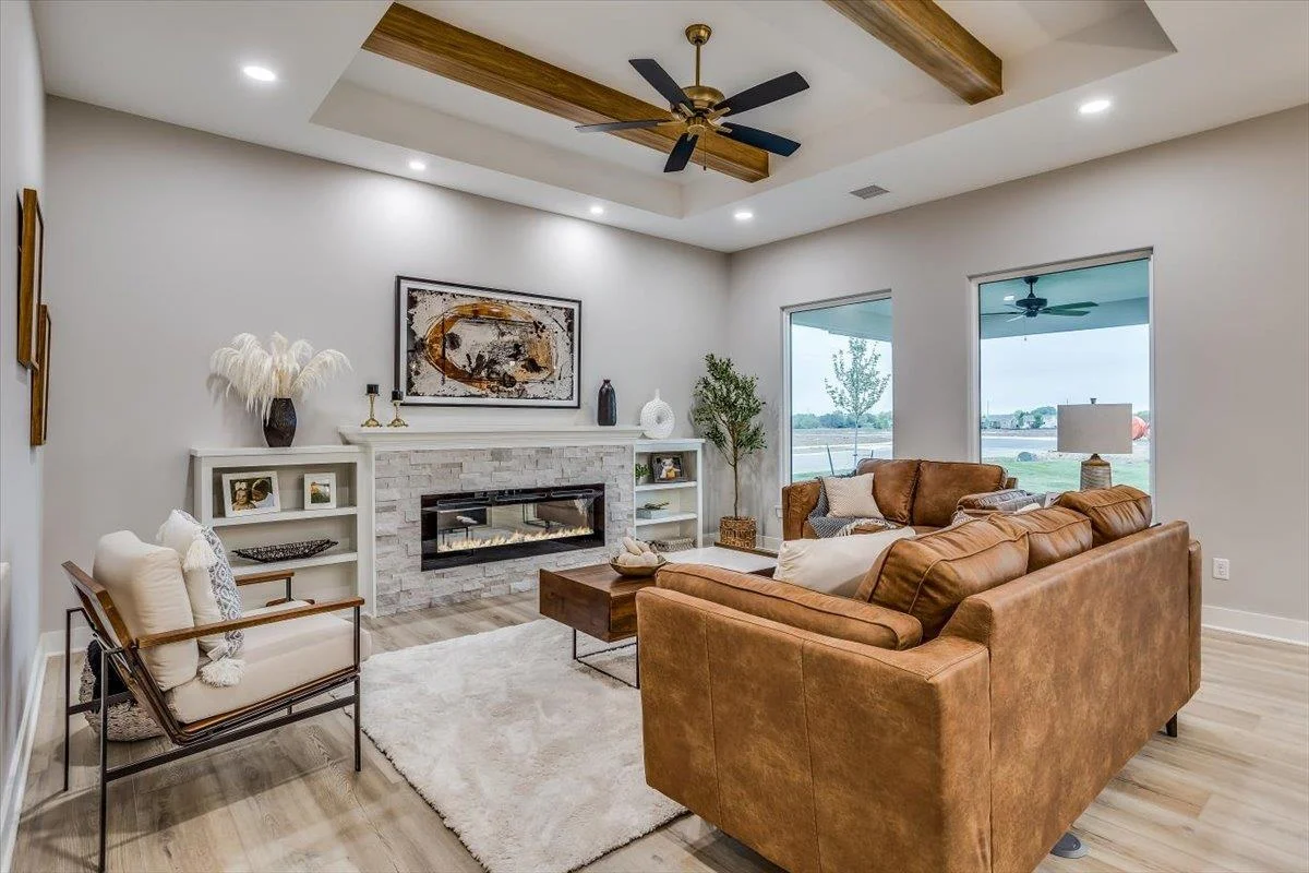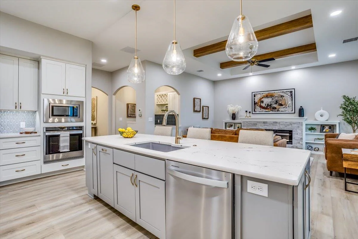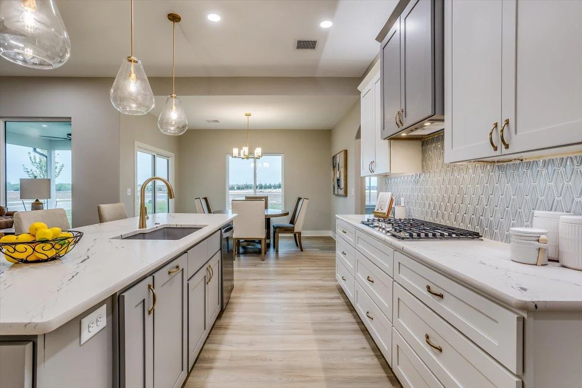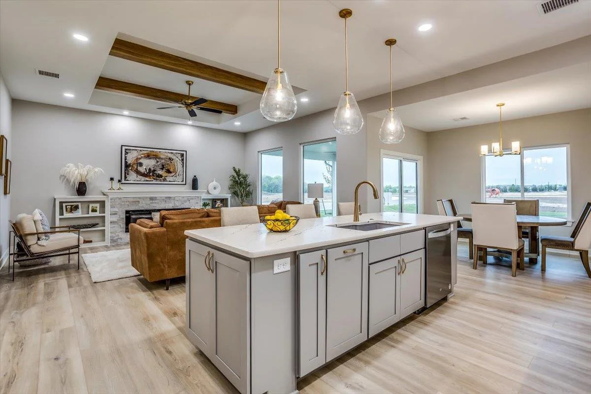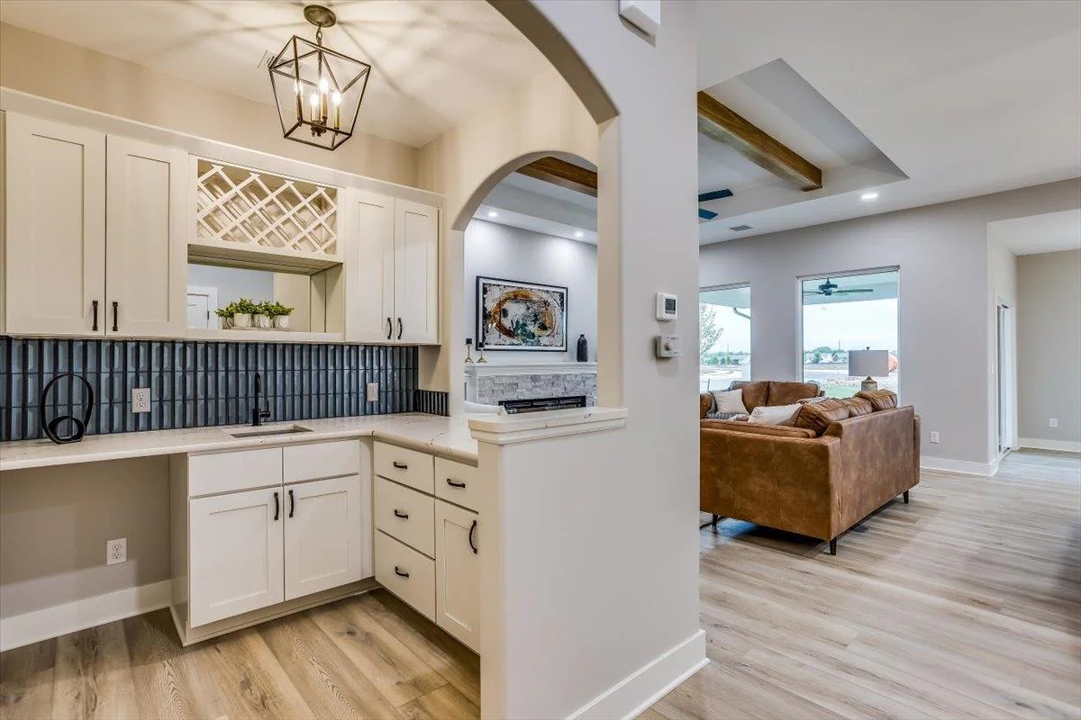 This new Kinsey design features a beautiful wetbar/coffee nook in place of pocket office option. Large living room w/ beamed ceiling, stone fireplace and custom shelving. Spacious kitchen with custom cabinetry, large quartz island and walk-in pantry. The master suite design with accent wall and custom tile shower gives you added convenience with walk through closet to laundry. Additional 3rd car garage gives you more storage. Bedroom closet doubles as a safe room. All information deemed reliable but not guaranteed. Estimated taxes and specials.