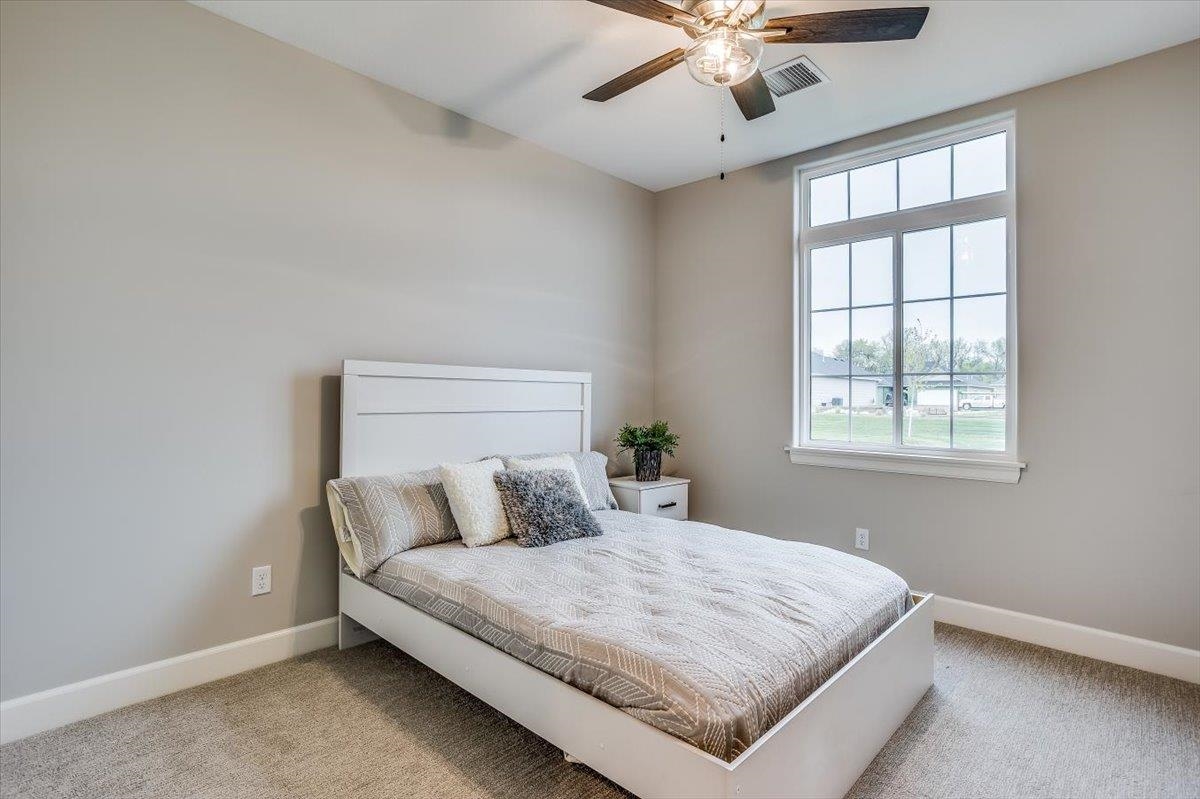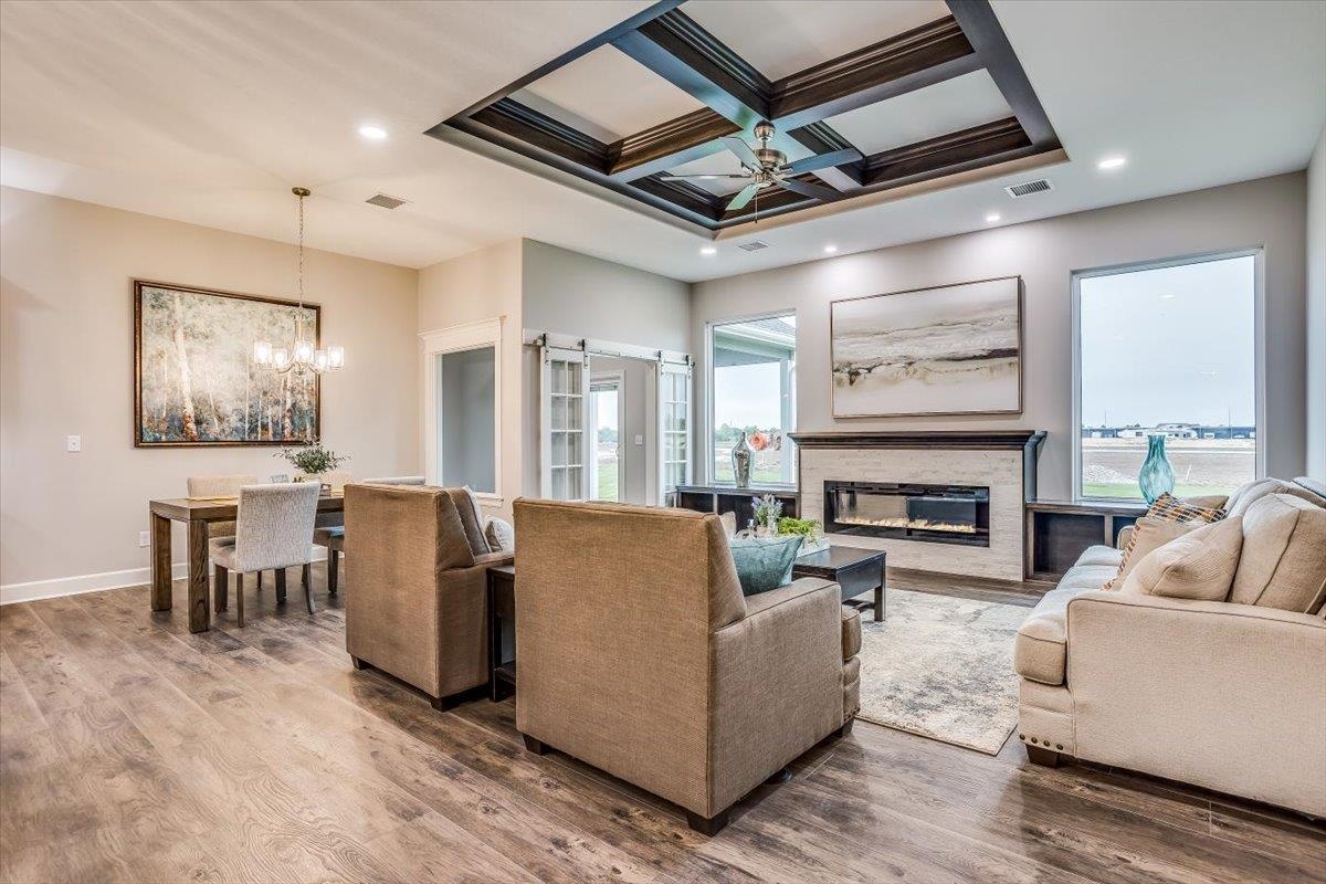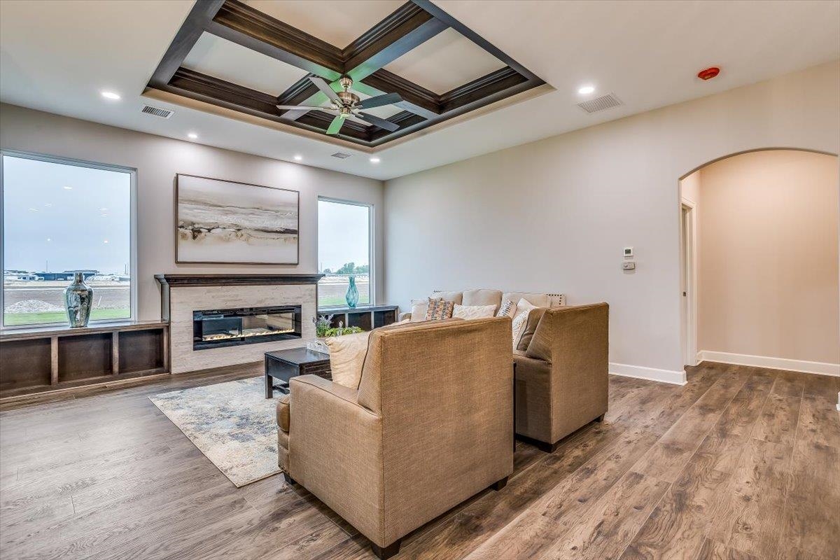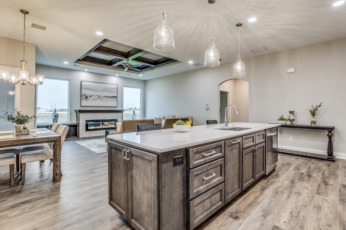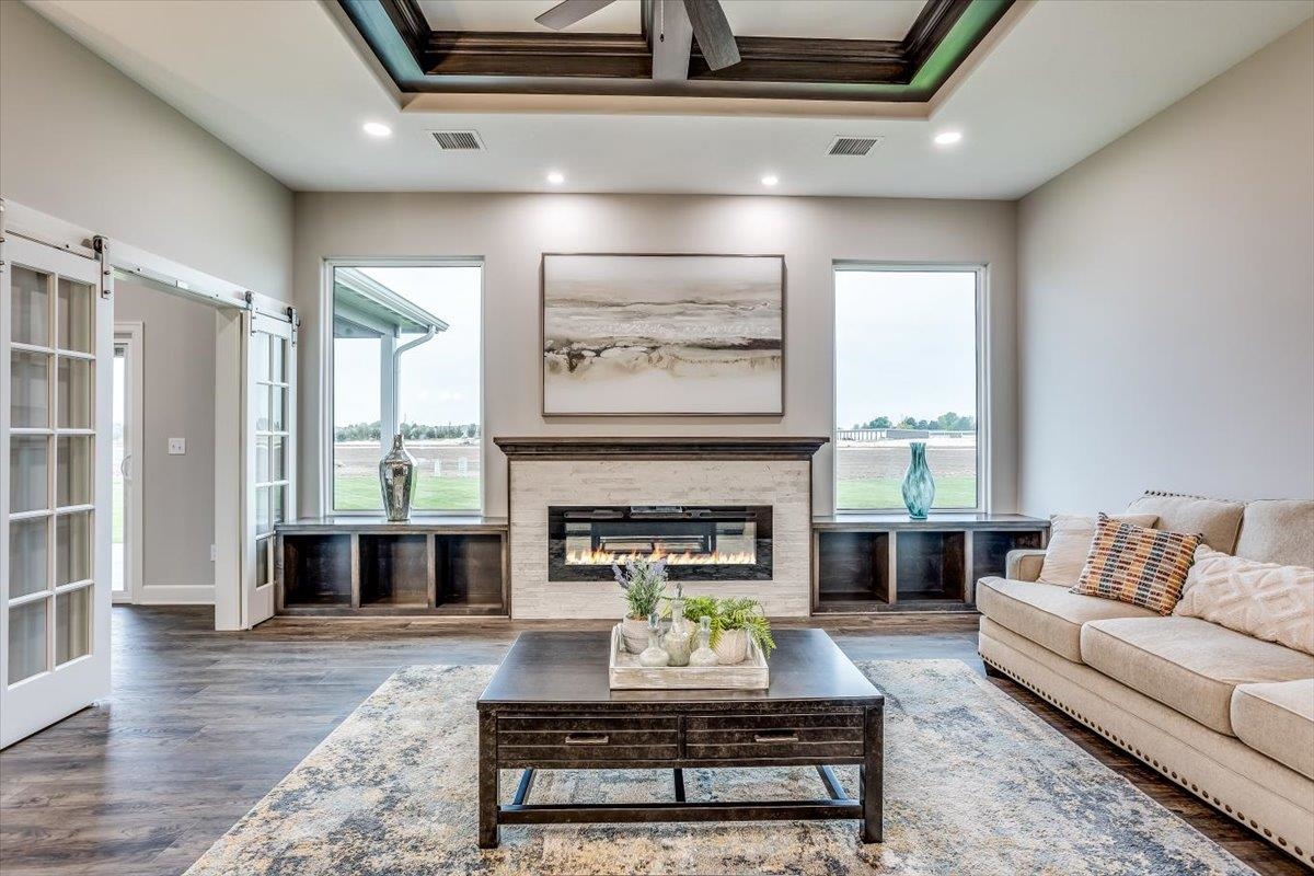 - Description: This model is now Available and Move-in Ready!!! Spacious open Bella floor plan with 3 bedrooms, 2 baths, a sunroom and covered patio looking out on to large lot. The kitchen is perfect for cooking and entertaining with gas cooktop, double ovens and large quartz island. Beautiful finishes throughout this home with rounded corners, luxury vinyl flooring, custom cabinetry and tile, wood beamed ceiling in living room and a linear fireplace with stone detail. Master suite with large tiled shower, double vanity and walk in closet. Large laundry with natural light and a sink. Lots of storage or work area in oversized 2 1/2 garage with safe room! Estimated taxes and specials. All information is deemed reliable but not guaranteed. Low HOA Dues of $150/month cover lawn care; mowing, fertilizing, sprinkler, irrigation and snow removal when required.