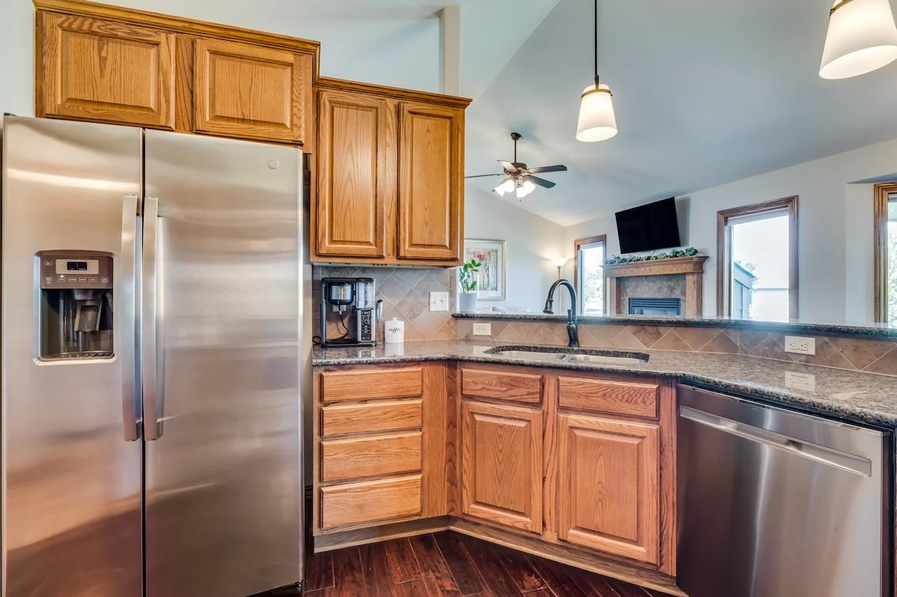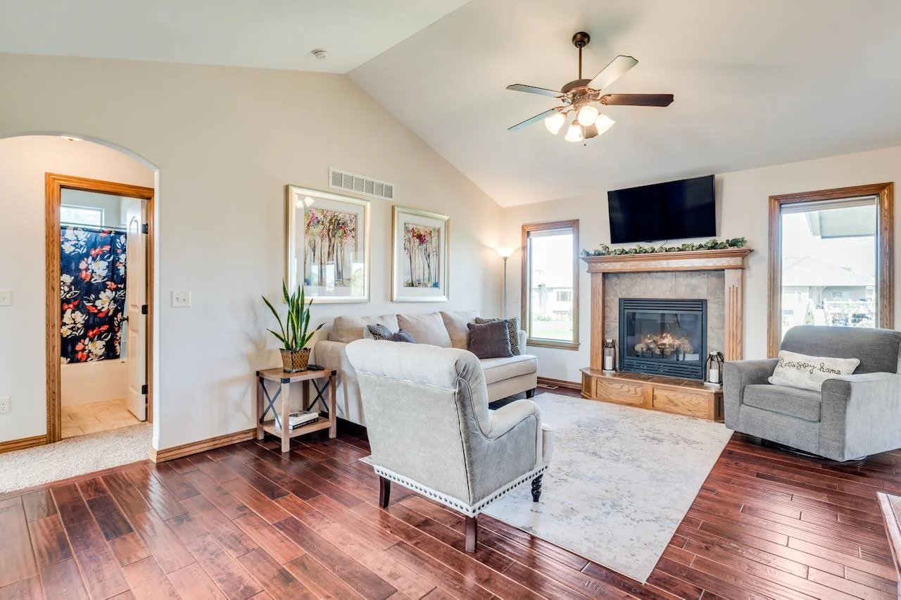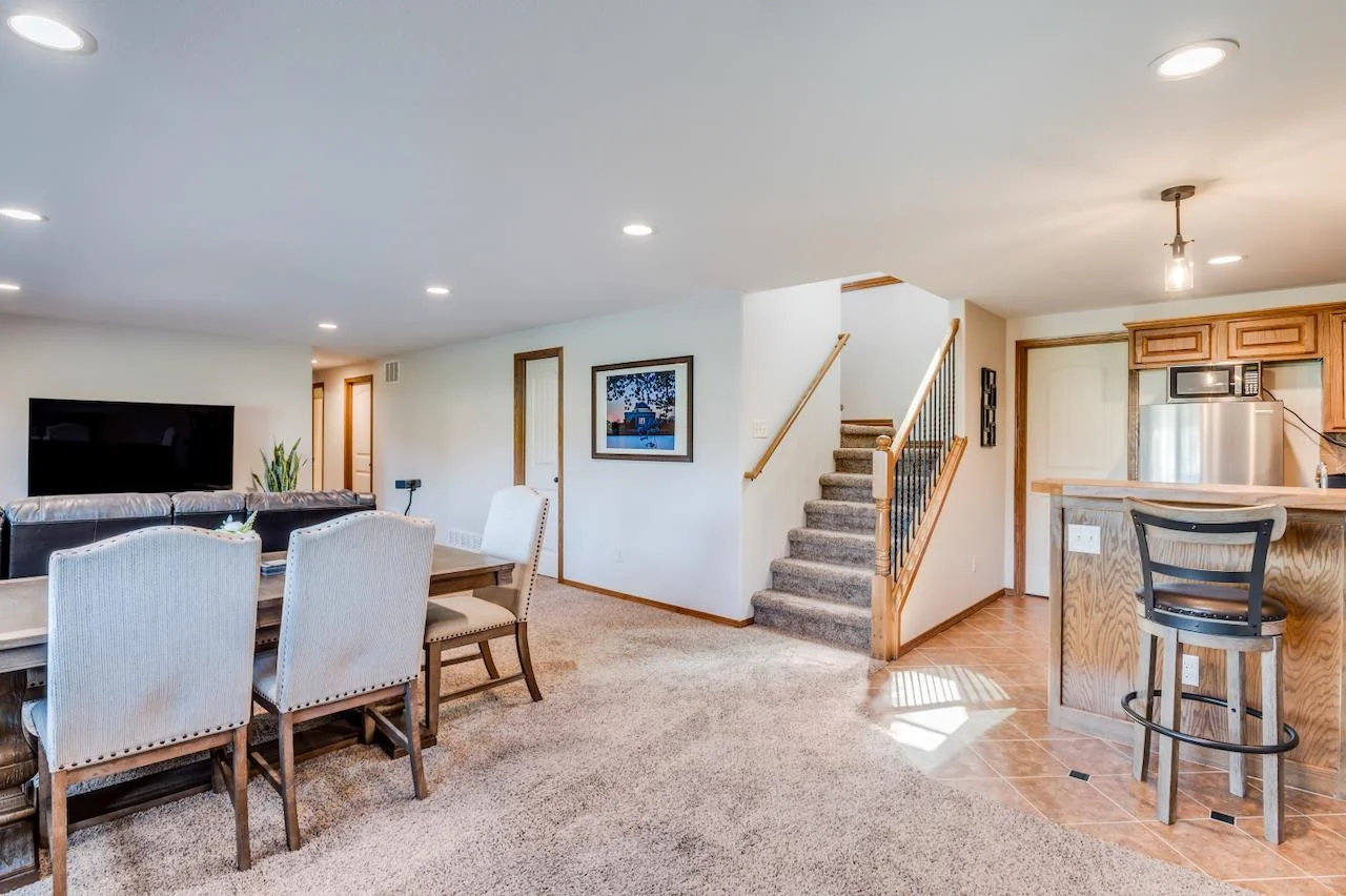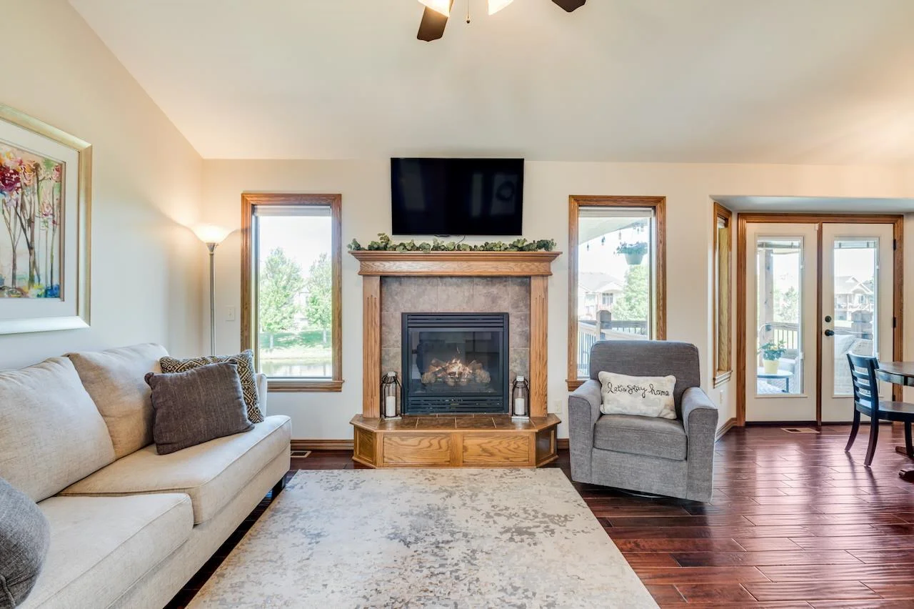 Lakefront living at its finest! This beautifully maintained home sits on a stunning, picturesque lot with breathtaking water views and a manicured yard framed by mature trees and lush landscaping. The arched foyer welcomes you into the spacious living room with wood floors, vaulted ceilings, a cozy gas fireplace, and large picture windows overlooking the lake. The kitchen is equally impressive—vaulted ceilings, granite countertops, an eating bar, walk-in pantry, and generous cabinetry make it perfect for both everyday living and entertaining. A spacious dining area flows seamlessly to a covered, composite deck with stairs leading to a large patio—multiple spaces to unwind or host guests with serene lake views as your backdrop. The luxurious Master Suite offers a private retreat with two closets, dual granite-topped vanity, a soaking tub, and separate shower. Smart design continues with a laundry room conveniently connected to the Master Closet and family entry from the garage. The fully finished basement expands your living space with a large family room, second fireplace, and a full kitchenette/wet bar complete with a full-size fridge, range/oven, and vent hood. Two more large bedrooms, a full bath, and ample storage complete the lower level. A true gem in a sought-after lakefront setting—this home has it all! Some information may be estimated and is not guaranteed. Please verify schools with USD 259.