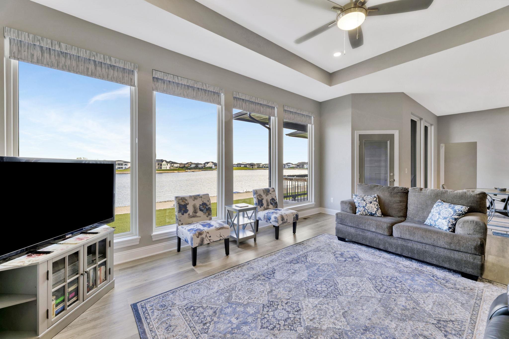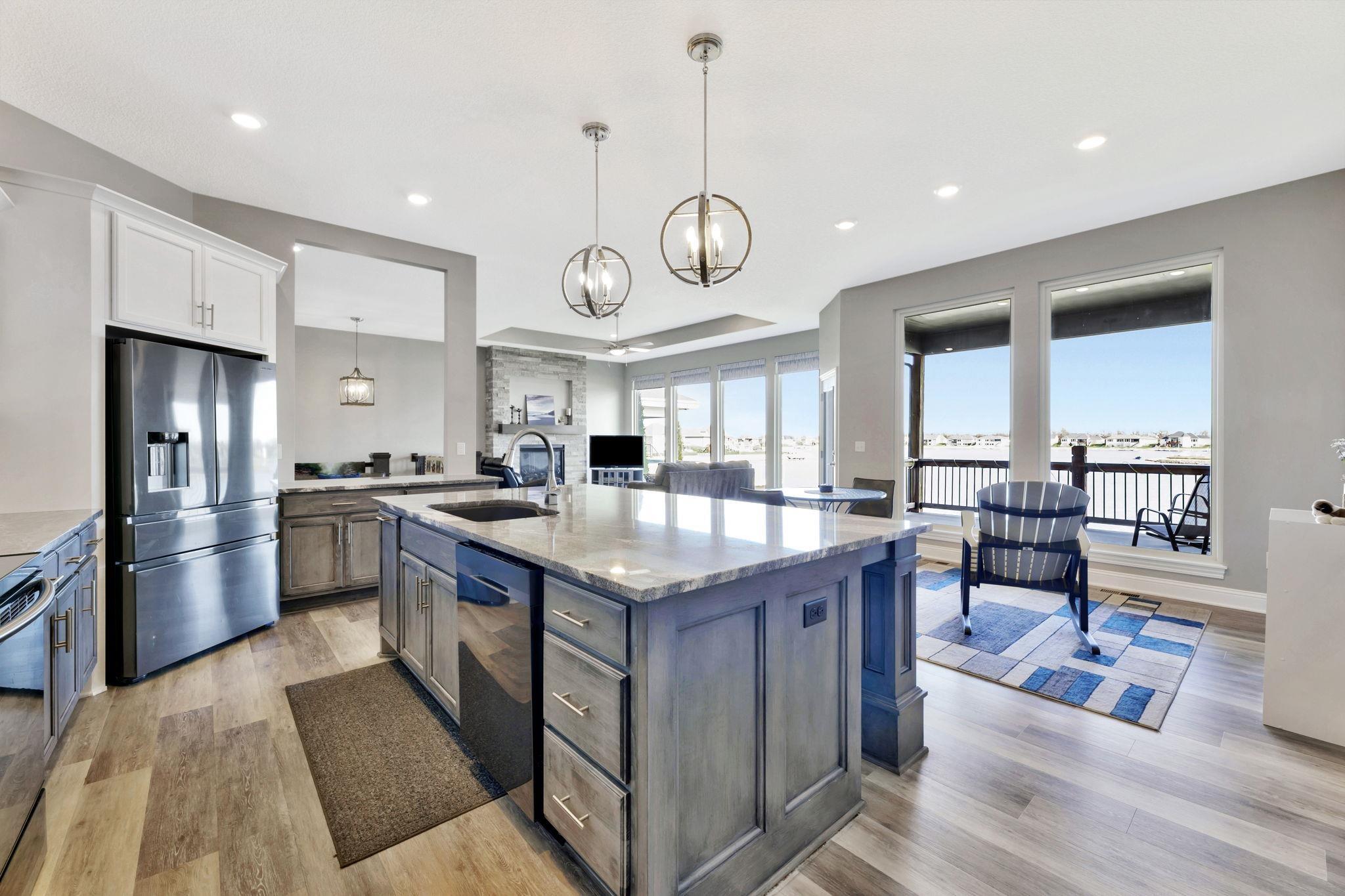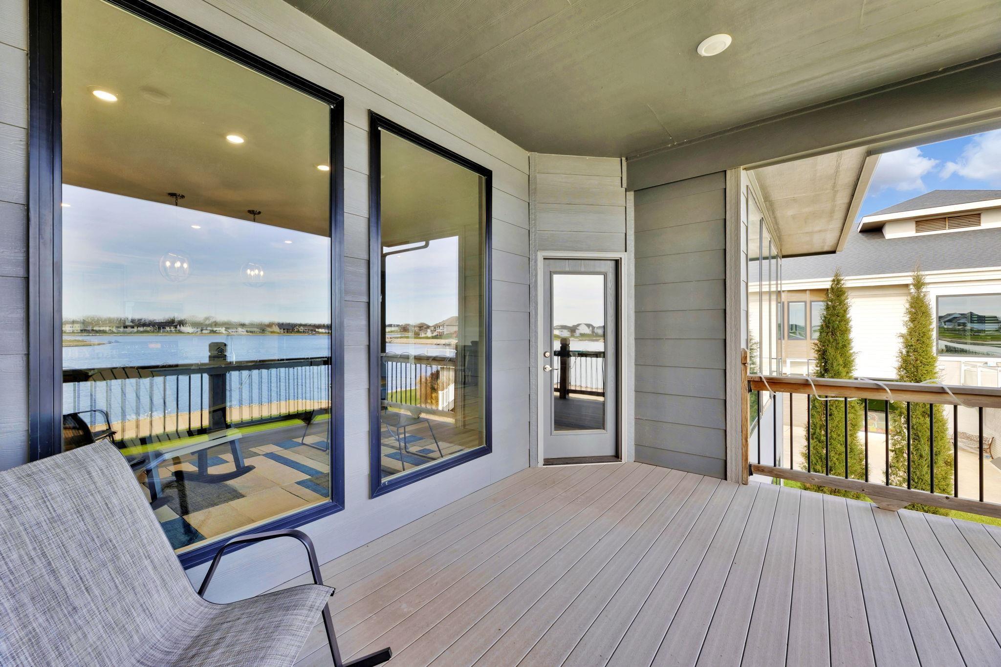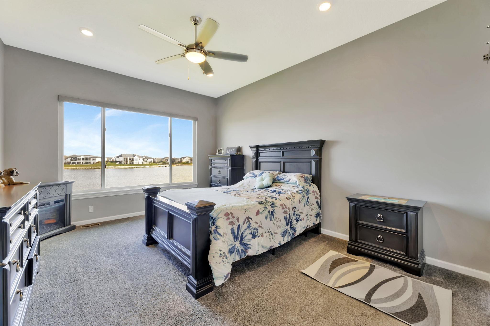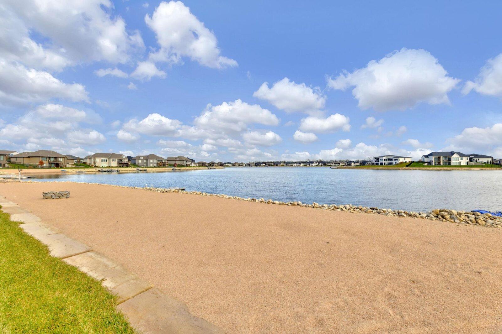 Experience luxury lakeside living at its finest in this meticulously maintained home on an extraordinary lake lot in Sandcrest. Perfectly positioned just a short walk from the lakefront clubhouse, resort-style pool, playground, soccer field, and pickleball court, this home blends incredible amenities with true modern elegance. A stunning mid-century modern elevation welcomes you inside, where the spacious living room features dramatic picture windows showcasing panoramic lake views and a gorgeous stone-surround gas fireplace. The rear-facing kitchen is a chef’s delight, offering granite countertops, abundant cabinetry, and a generous walk-in pantry. The adjoining dining room—also framed by expansive windows—opens directly to the covered deck, delivering some of the best vantage points in the neighborhood. Retreat to the luxurious master suite with a spacious bedroom, spa-inspired bath featuring dual granite-topped vanities and a full tile shower, and an impressive walk-in closet with direct access to the laundry room. A second main-floor bedroom, full hall bath, and a convenient front office complete the main level. The fully finished walk-out lower level continues to impress with a large family room highlighted by LVP flooring, a walk-out to the covered patio, and a stylish pub-style wet bar—ideal for entertaining. Three additional bedrooms and a full bath offer plenty of space for family and guests. Outside, the expansive backyard is your own private lakeside sanctuary. Enjoy a large beach area, included jet-ski dock, and ample room for a future pool. You can even add your own private boat dock along your beach frontage. Don’t miss this rare opportunity to own one of the prime lots in Sandcrest—one of Wichita’s premier lakeside communities and located within the Maize South school district. This home is the perfect blend of luxury, lifestyle, and breathtaking views. Come see it today! Some information may be estimated and is not guarnteed. Please verify schools with USD 266.