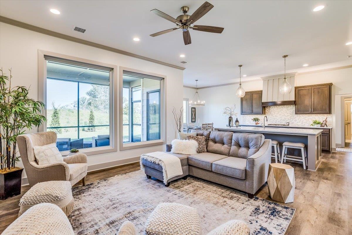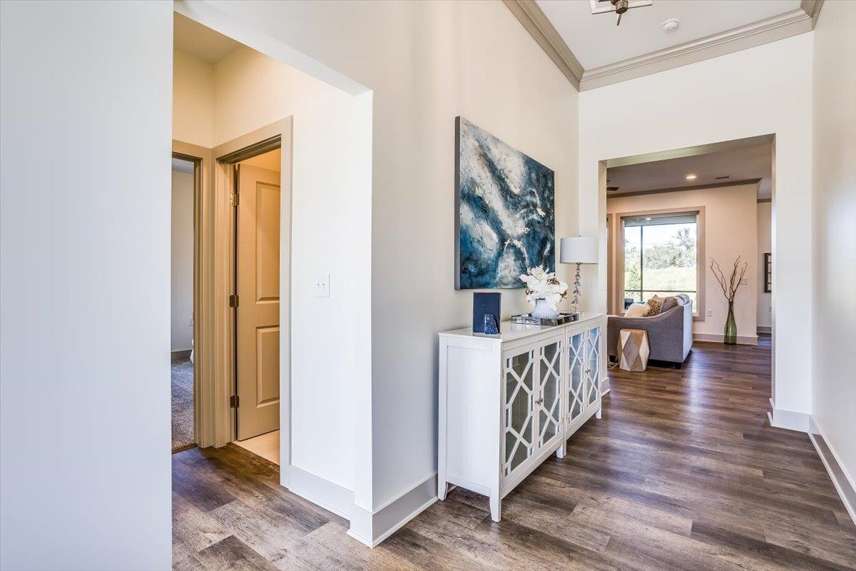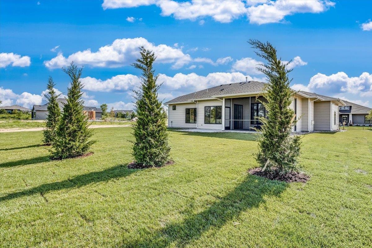 - Description: New zero entry home by H & H Homebuilders. This three bedroom two bath home features a large entry foyer, leading to the great room with crown molding and fireplace, open to the kitchen and dining area overlooking the large covered patio. The kitchen features a large island, walk-in pantry which is also the safe room, crown molding, gas cook top, built-in oven and microwave, pull out shelving in the lower cabinets and luxury vinyl flooring. Owner's suite has crown molding, wood paneled accent wall, large walk-in closet, tile shower, double vanities and is connected to the laundry room. This home also has a large covered front porch, three car garage, well, sprinkler system, lawn and landscaping. Sandcrest amenities include the clubhouse with firepit, boating lake, two pools, pickleball court, and playground. MOVE IN READY! Taxes are estimated and the information is deemed reliable but not guaranteed and may be changed without prior notice.