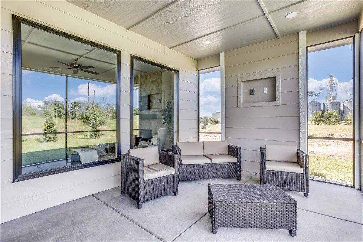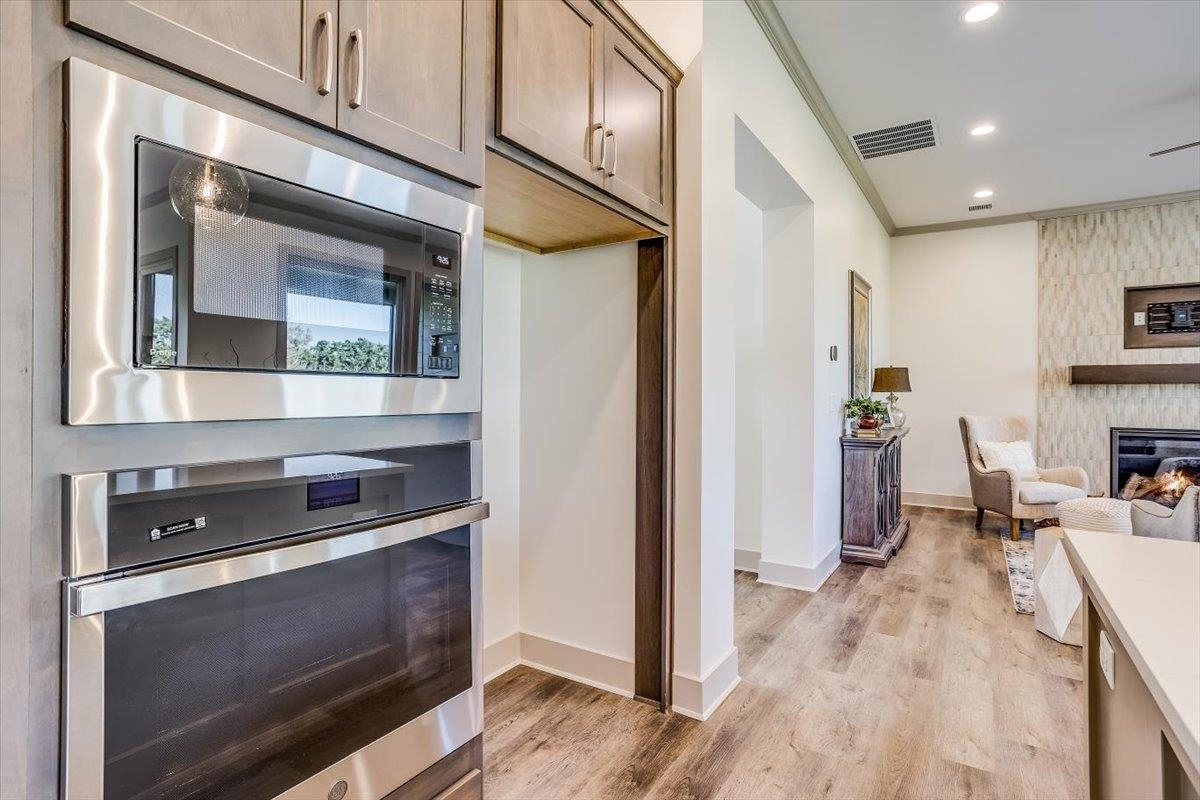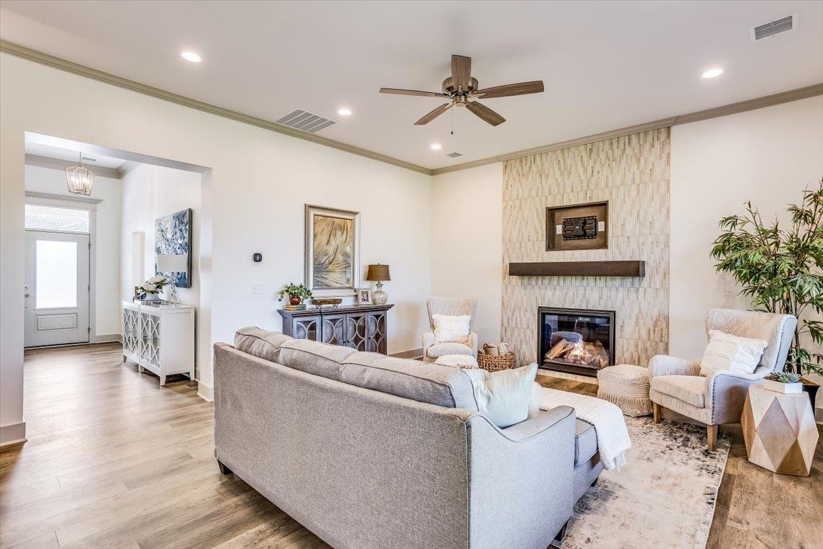 - Features: Ceiling Fan(s)DecorativeDecorative FireplaceFireplace Doors/ScreensGasGlass DoorsHumidifierLaminateLiving RoomOneWalk-In Closet(s)