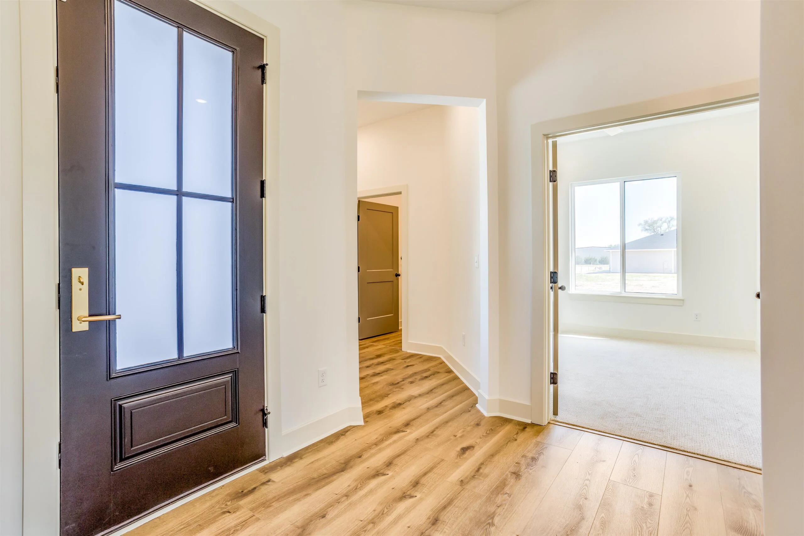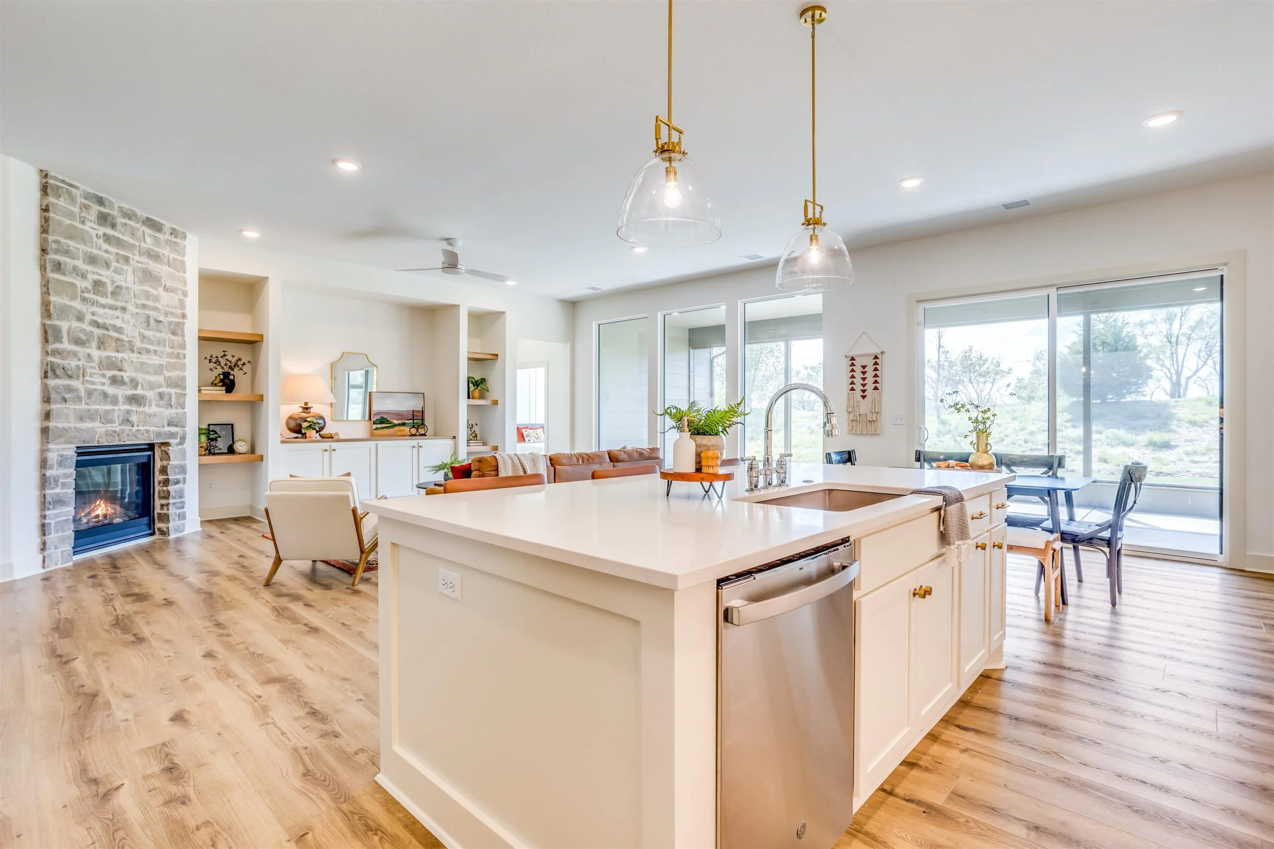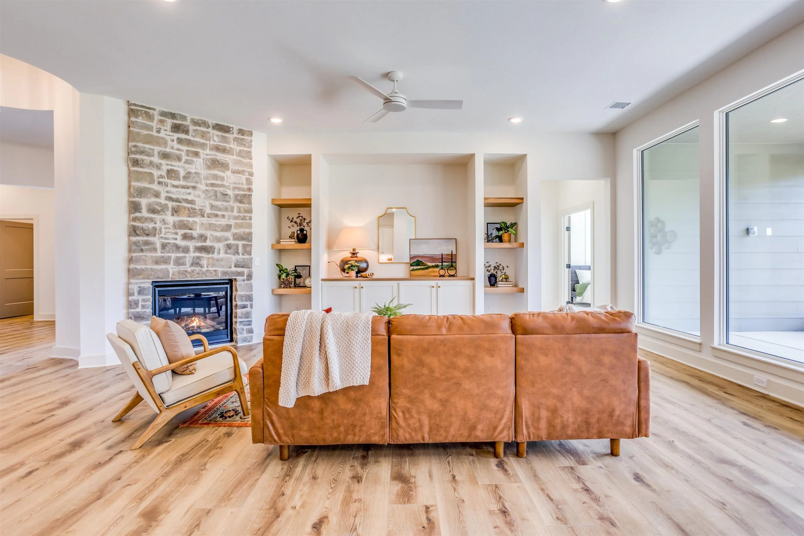 New zero entry home by Robl Building Co. You enter this home with a large covered porch, entry foyer with curved walls to the great room. The great room features a stone fireplace, built-in cabinets, luxury vinyl flooring and large windows overlooking the screened porch. This plan is open to the kitchen and dining. The kitchen features a center island, walk-in pantry, abundant counter space and cabinets. The primary bedroom has a decorative wood paneled wall, and the bath has a custom tile shower, water closet, large walk-in closet, and double vanities. The primary bedroom connects to the laundry room as does the other bedroom and office. Price includes a concrete safe room, large oversized three car garage, water well, sprinkler, lawn and landscaping. Don't miss out on this beautiful home. MOVE IN READY! Information deemed reliable but not guaranteed and may be changed without prior notice. Taxes estimated.