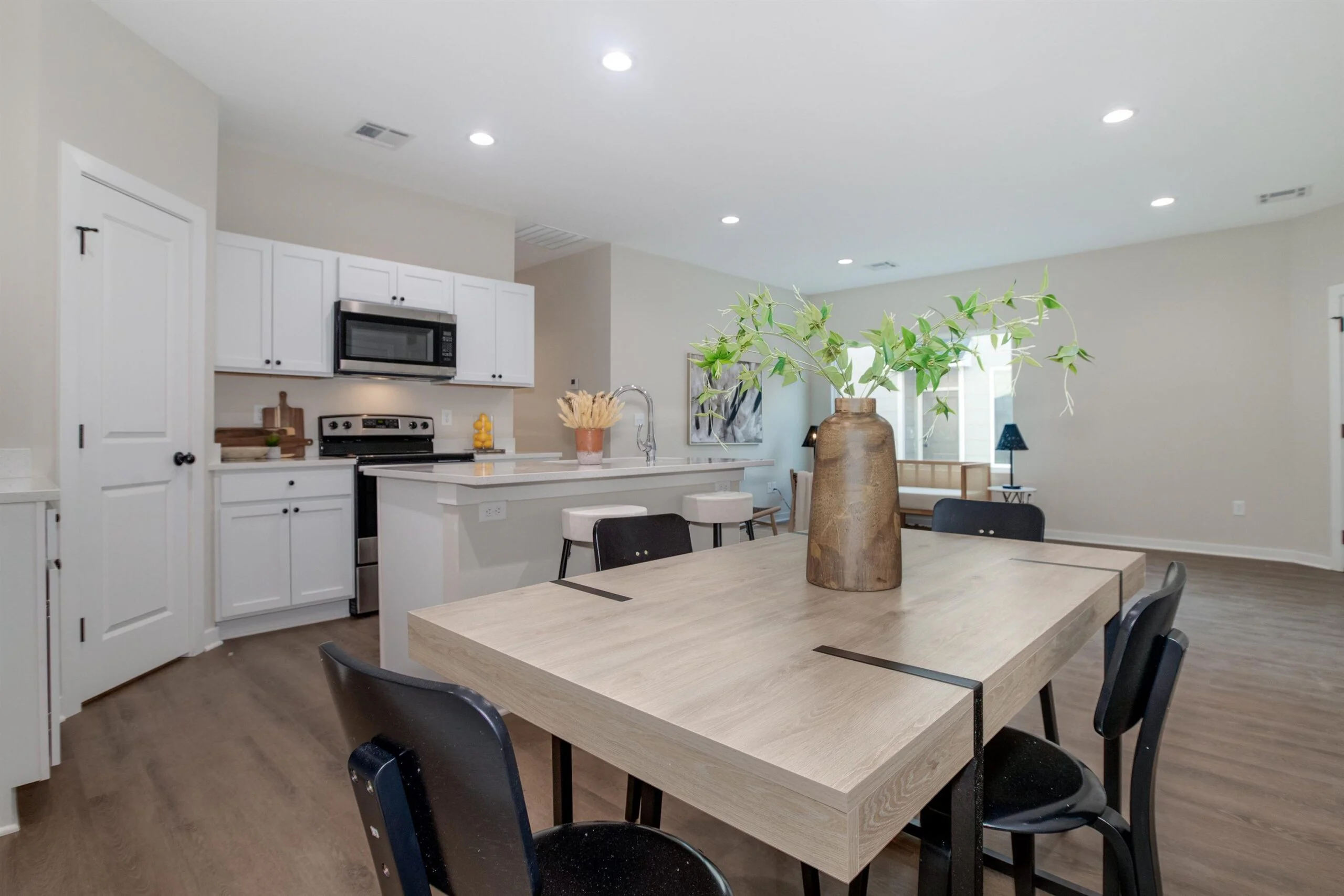 This charming single-story townhome features three spacious bedrooms and two modern bathrooms, perfect and comfortable for family living. This floor plan offers a seamlessly connected open-concept layout, connecting the living, dining, and kitchen areas, creating a welcoming space for entertaining and daily life. The kitchen boasts sleek quartz countertops and ample cabinetry, ideal for culinary enthusiasts. Enjoy the convenience of a two-car garage, providing both storage and protection for your vehicles. HOA handles lawn maintenance including mowing, sprinklers, wells. The backyard includes a spacious area with plenty of room to stretch your legs, with a wrought iron fence. With this thoughtful design this townhome offers style and functionality in a beautiful area.