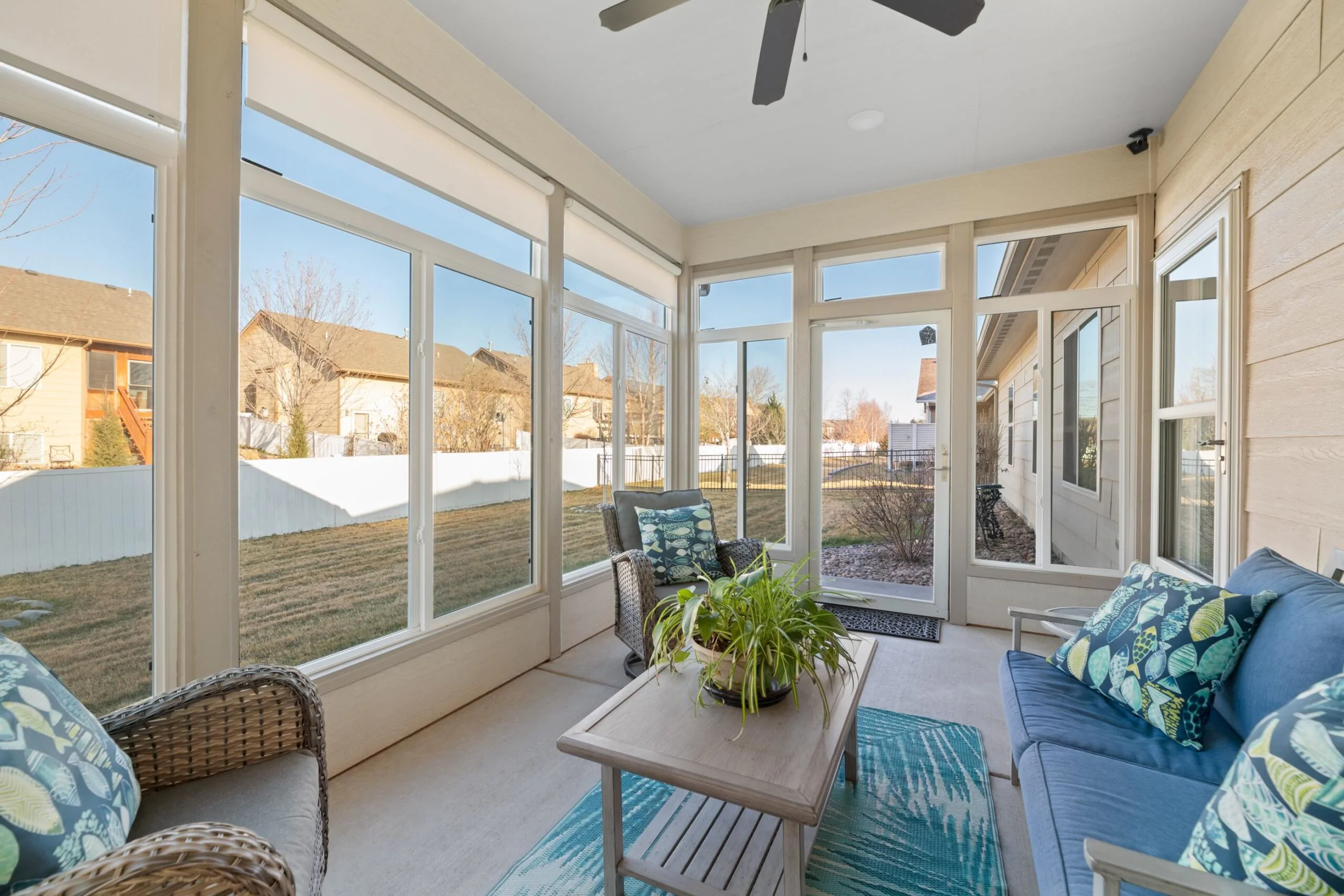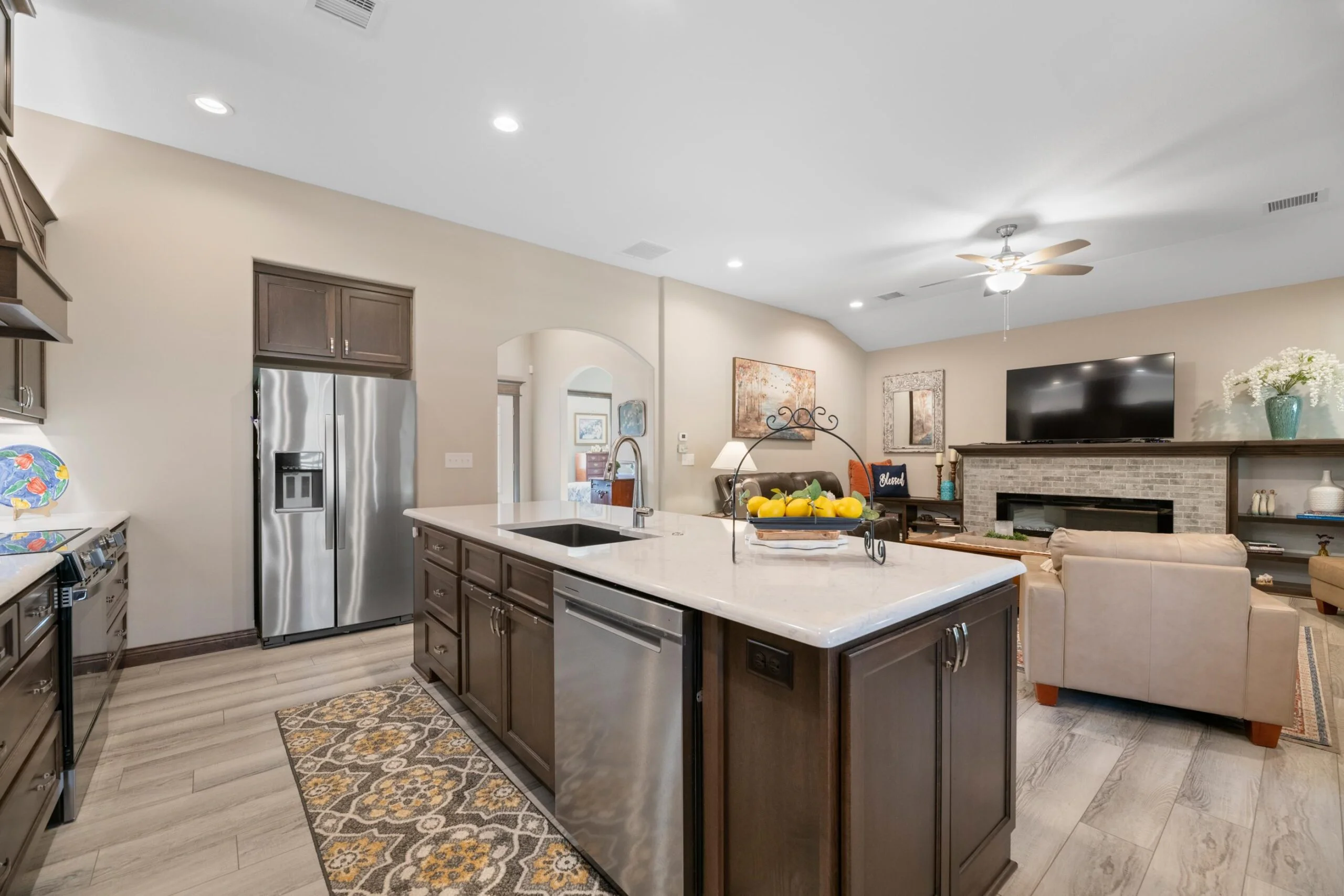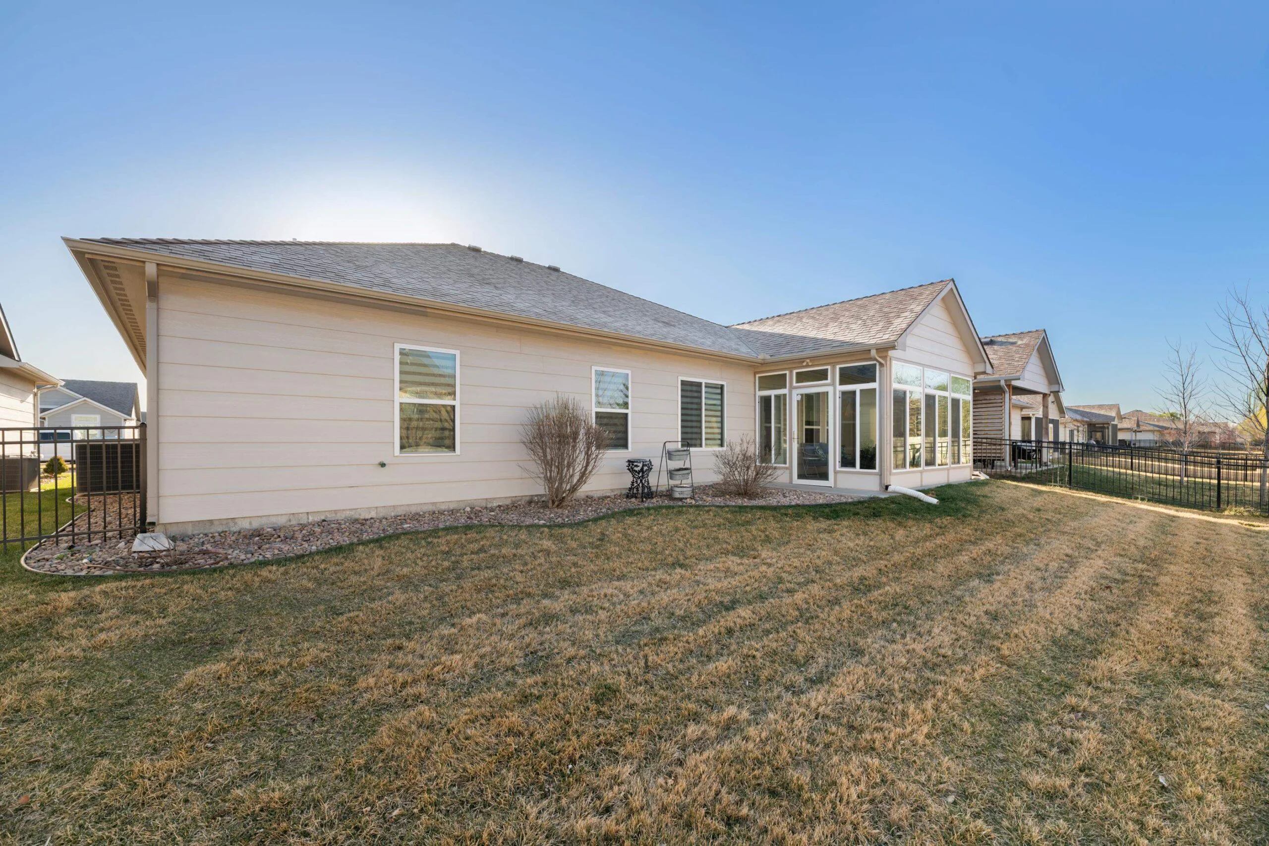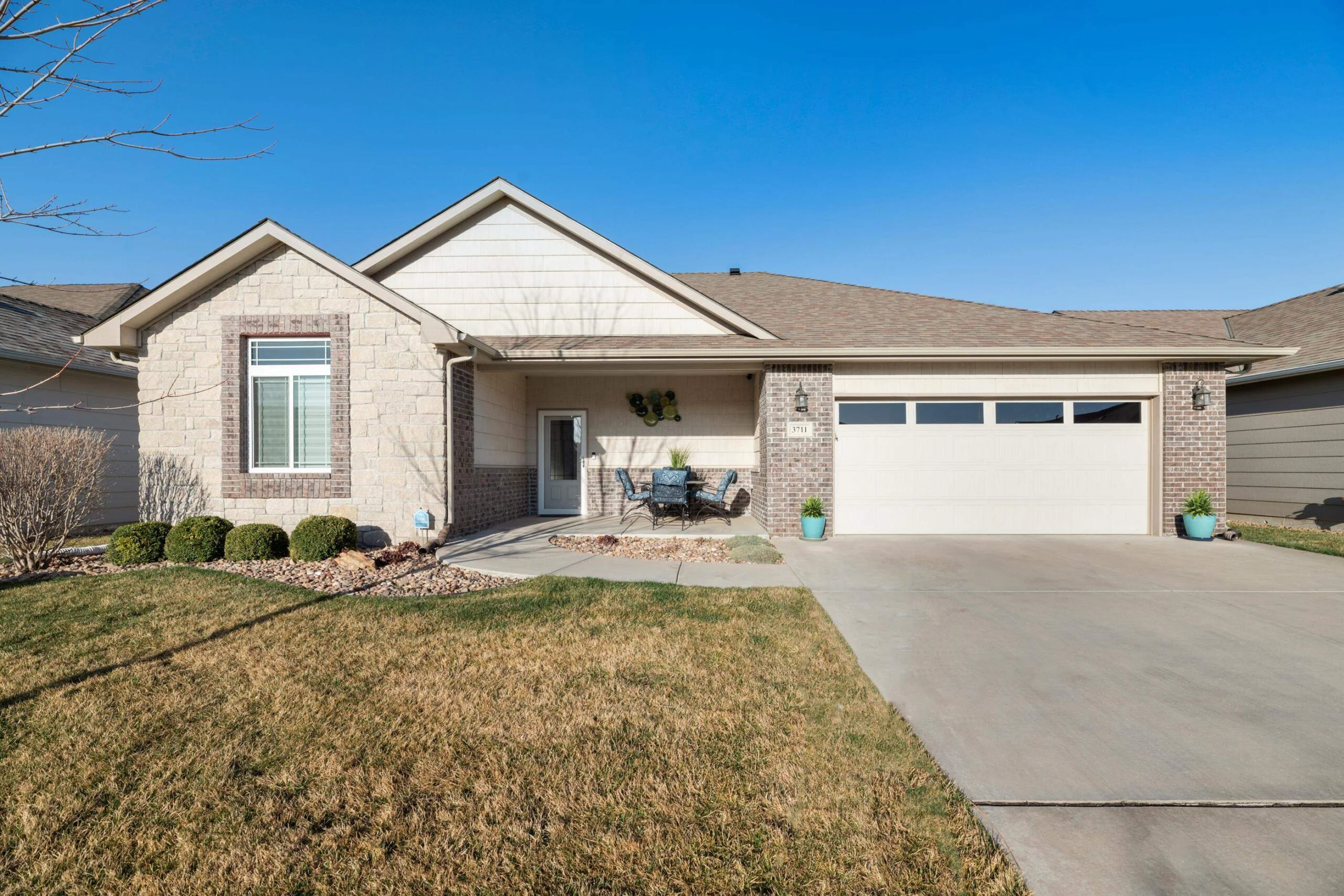 Available Now! This beautiful zero entry Siena by Mullin Inc is ready to call home. Open kitchen, living and dining room. Kitchen with quartz counter tops, huge island for sitting/serving and lots of storage in 7' walk-in pantry. New upgraded stainless steel dishwasher, and range. Living room includes a linear fireplace and built-in bookcases. Primary suite with vaulted ceiling, custom tile shower, double vanities and spacious master closet that doubles as a safe room. Spacious bedrooms will accommodate king sized beds and additional furniture or desk. The added sunroom gives you a bonus space for additional tv/sitting area, office, exercise or hobby room. Relax on your large glass/screened 3 season patio that includes solar shades. Custom light filtering dual window shades stay. Low HOA dues include lawn care and sprinkler maintenance, snow removal, trash service and irrigation (community wells) for yard. Siena Lakes community has walking paths around the lakes and fishing. All information deemed reliable but not guaranteed.