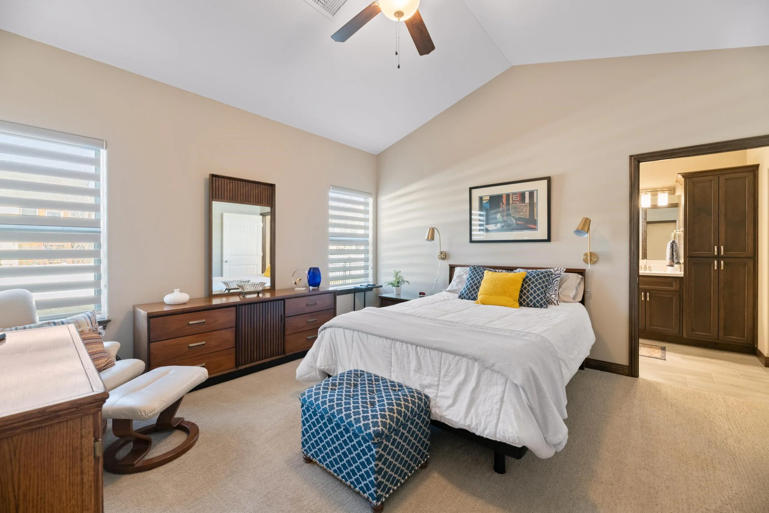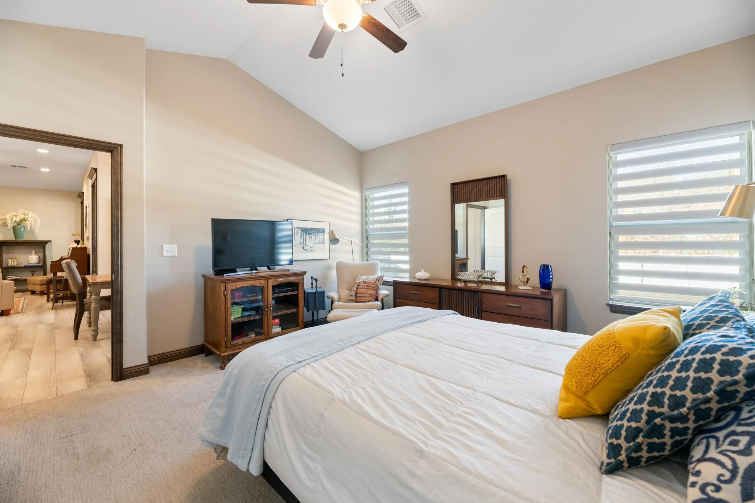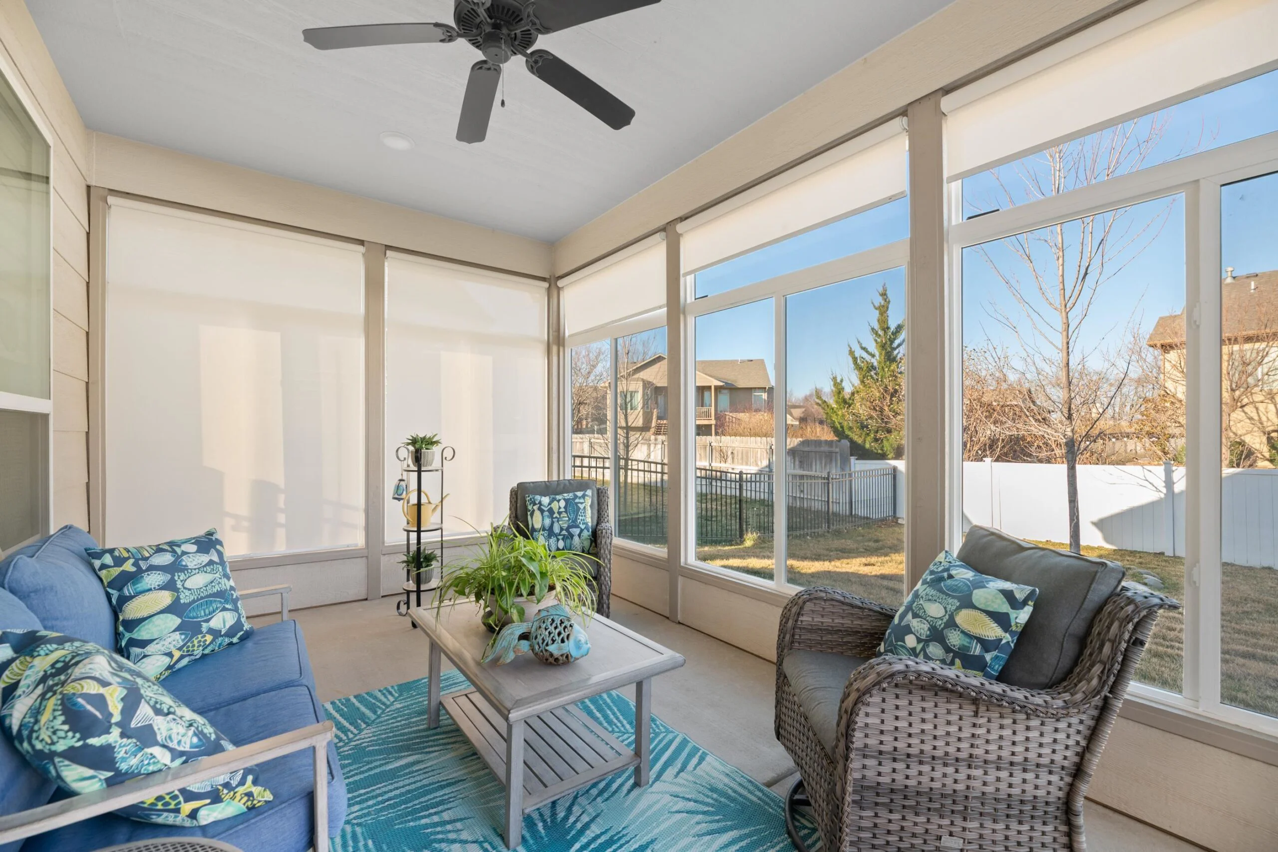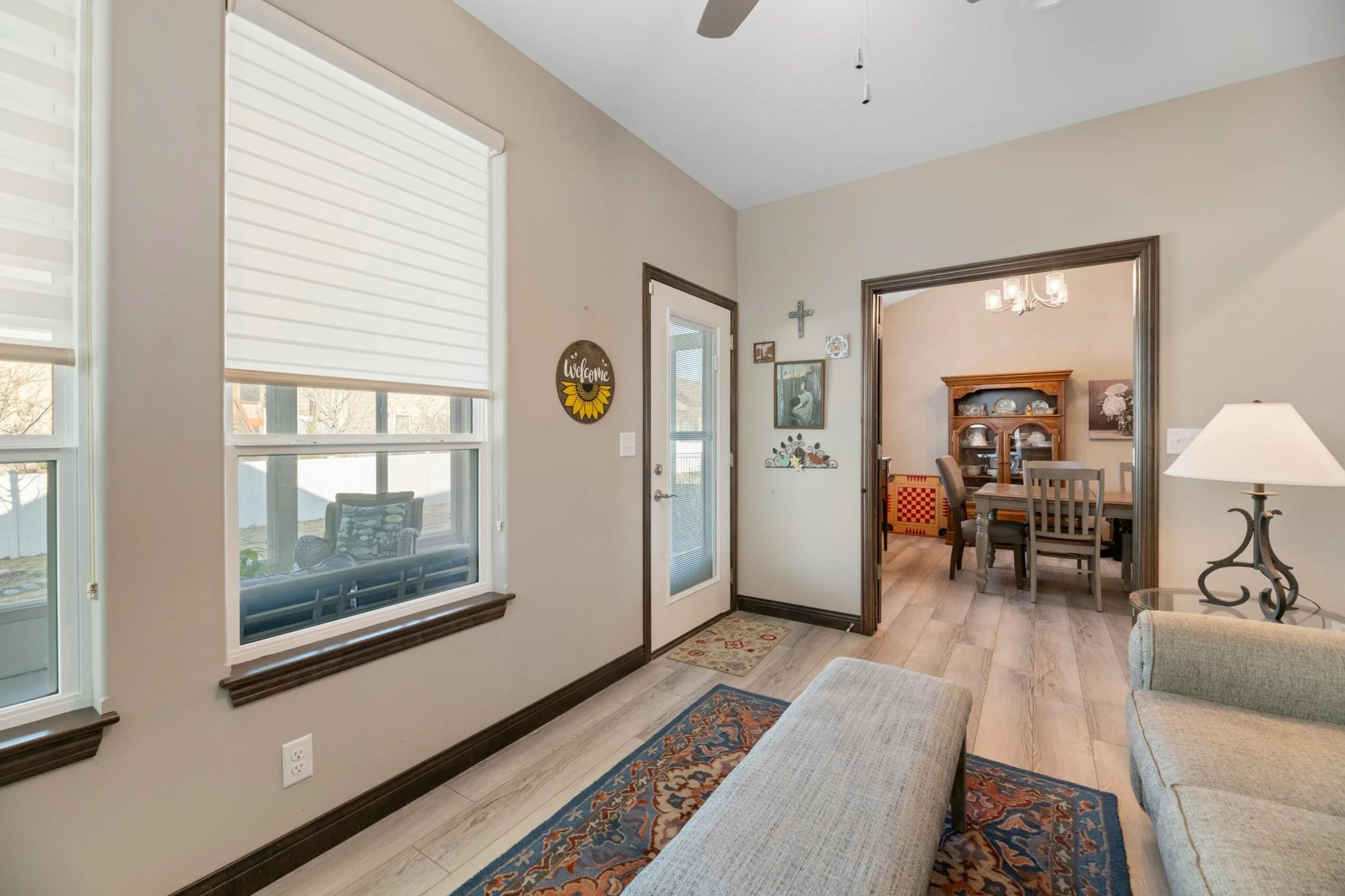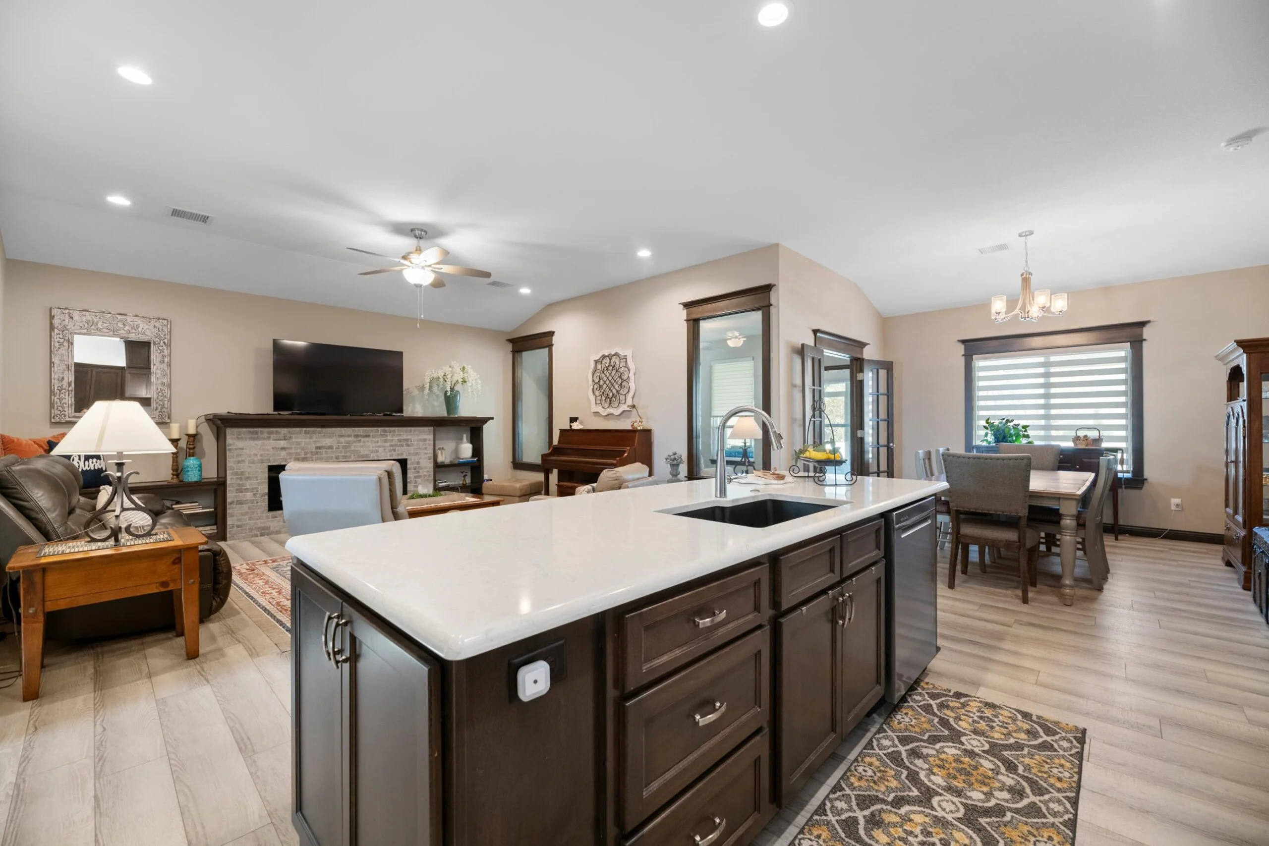 Available Now! This beautiful zero entry Siena by Mullin Inc is ready to call home. Open kitchen, living and dining room. Kitchen with quartz counter tops, huge island for sitting/serving and lots of storage in 7' walk-in pantry. New upgraded stainless steel dishwasher, and range. Living room includes a linear fireplace and built-in bookcases. Primary suite with vaulted ceiling, custom tile shower, double vanities and spacious master closet that doubles as a safe room. Spacious bedrooms will accommodate king sized beds and additional furniture or desk. The added sunroom gives you a bonus space for additional tv/sitting area, office, exercise or hobby room. Relax on your large glass/screened 3 season patio that includes solar shades. Custom light filtering dual window shades stay. Low HOA dues include lawn care and sprinkler maintenance, snow removal, trash service and irrigation (community wells) for yard. Siena Lakes community has walking paths around the lakes and fishing. All information deemed reliable but not guaranteed.