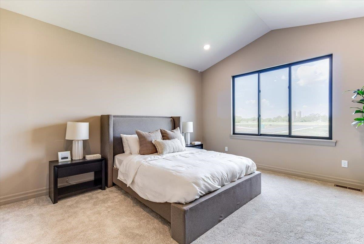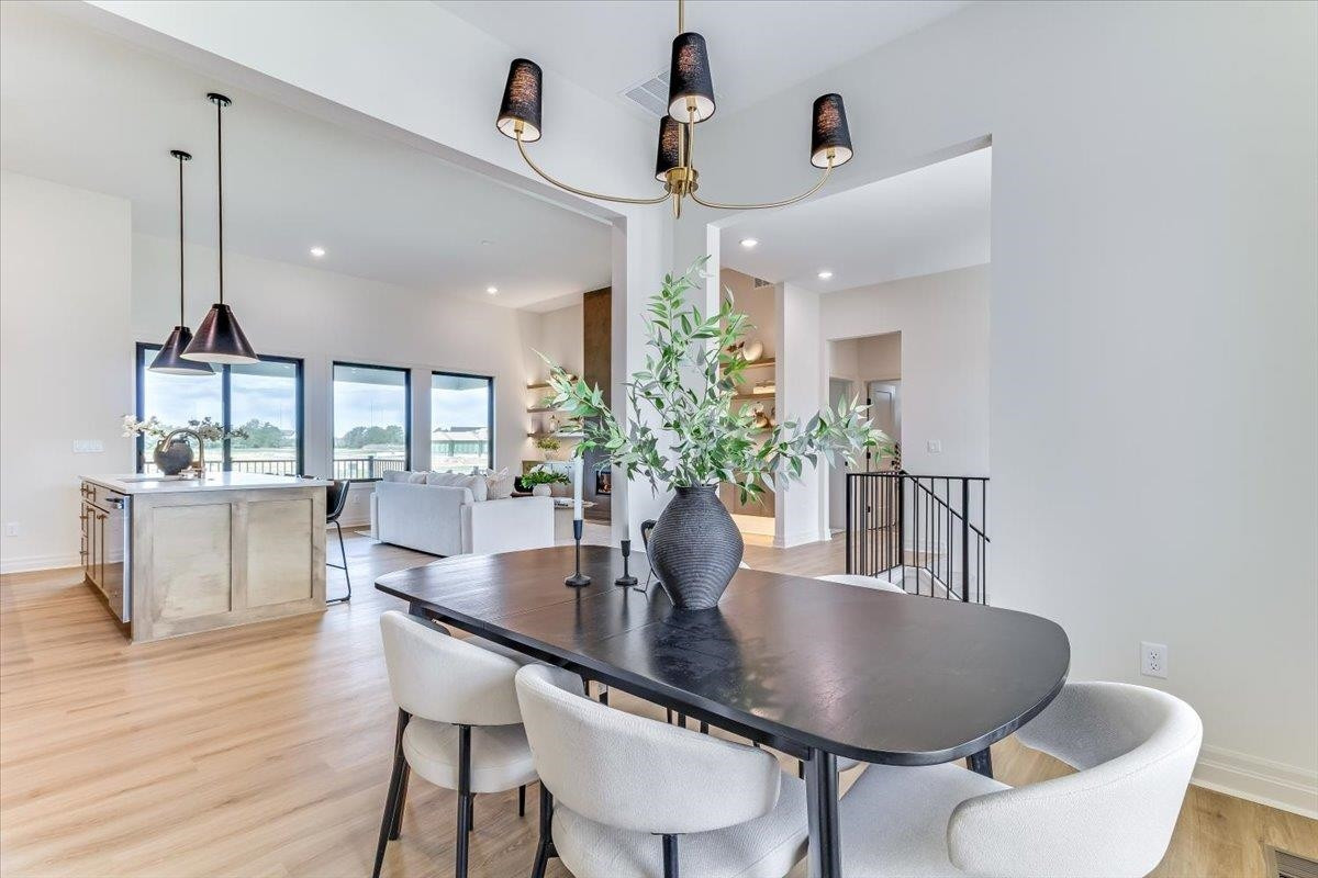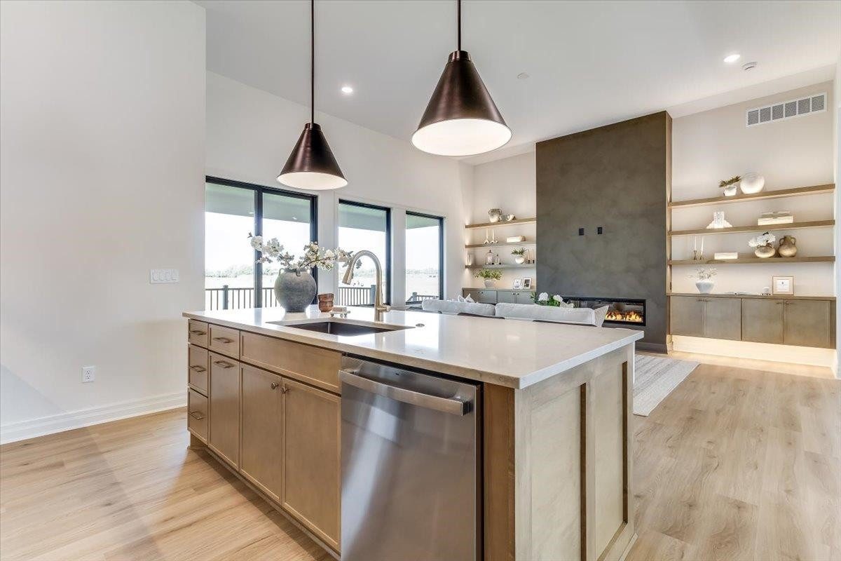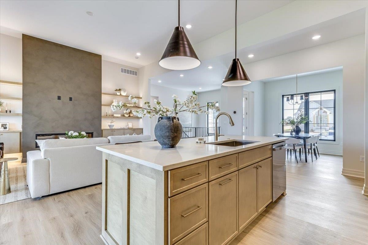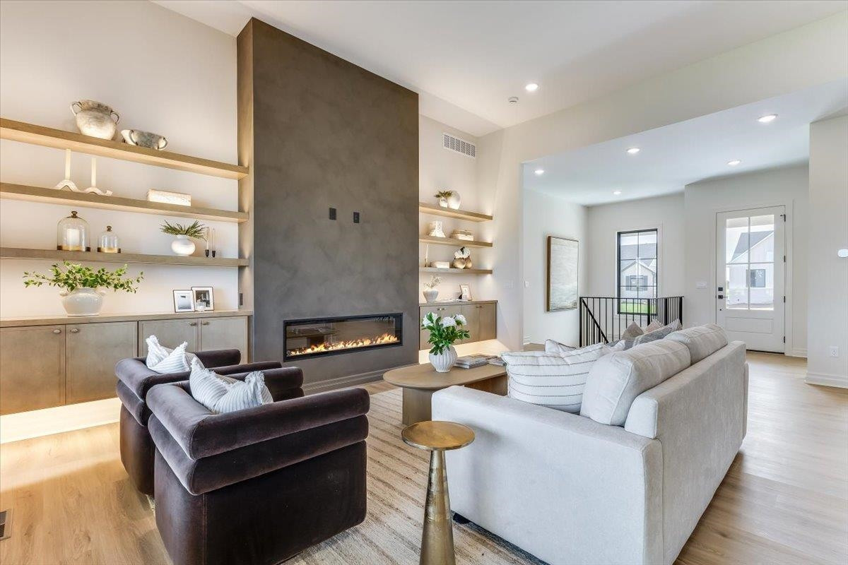 Welcome home to this stunning new floor plan designed for both comfort and style. The inviting dining area is perfectly positioned at the front of the home, creating a warm and welcoming first impression. Exceptional curb appeal is highlighted by a side-load 3-car garage, offering both function and elegance. The heart of the home features a beautiful kitchen that seamlessly overlooks the spacious living room, complete with a large sliding door that opens to a covered deck with breathtaking lake views—perfect for indoor-outdoor living and entertaining. The living room is anchored by a striking electric fireplace, surrounded by custom-built cabinetry and illuminated shelving for a modern, upscale feel. Retreat to the luxurious primary suite, a true oasis with serene lake views. The spa-like bathroom showcases a gorgeous tile shower, floating double vanities, and a spacious walk-in closet conveniently located just across from the dedicated laundry room with folding shelf. The finished basement offers exceptional additional living space, including a large family room with a wet bar and front island seating—ideal for gatherings. Two split bedrooms, each with generous walk-in closets, provide privacy and comfort. Ample storage space throughout the basement adds to the home's functionality. This thoughtfully designed home offers 5 bedrooms, 3 bathrooms, and the perfect blend of style, space, and scenic views. Information deemed reliable but not guaranteed and may change without notice. Specials and generals may not be entirely spread yet on this lot. There is a $250 mailbox fee collected at closing. This is a model home and not for sale at this time
