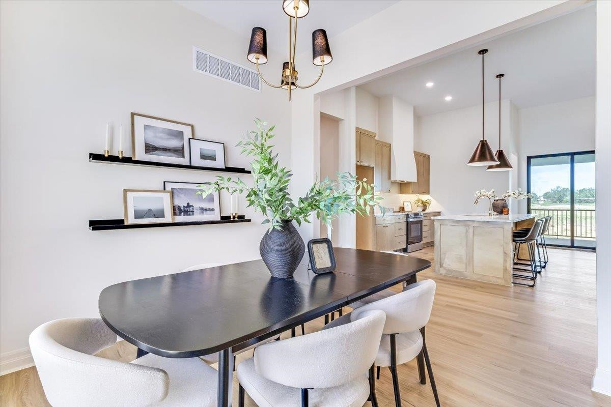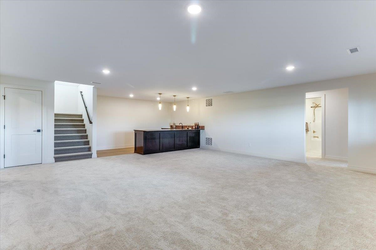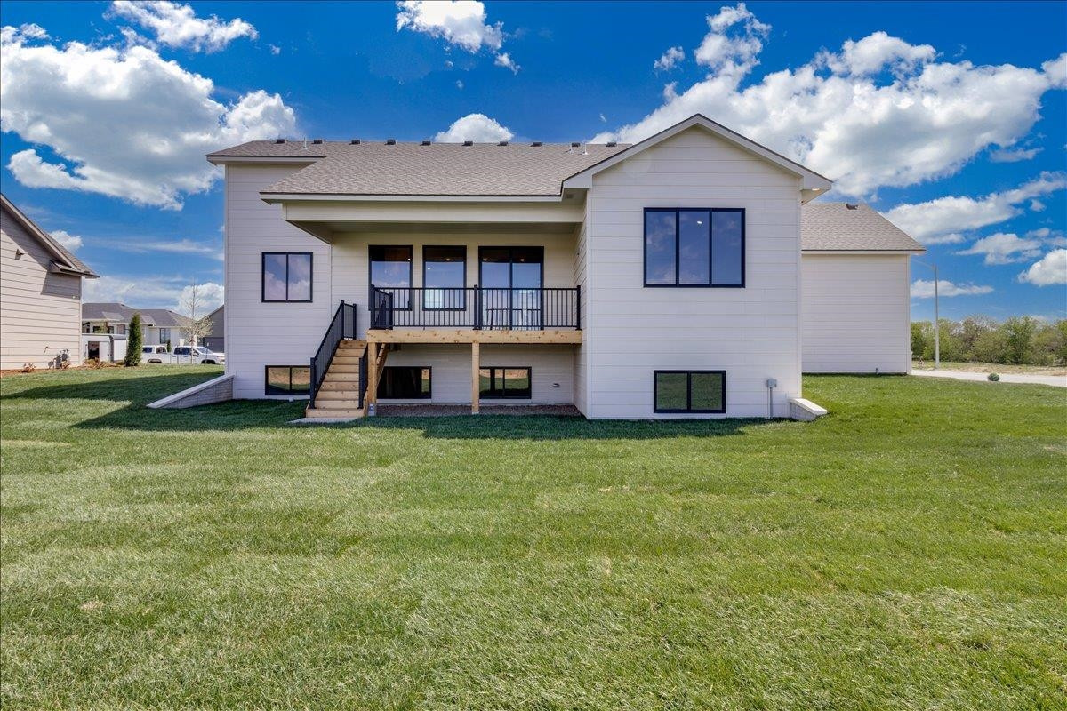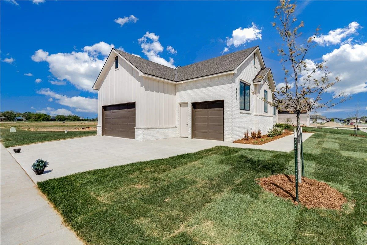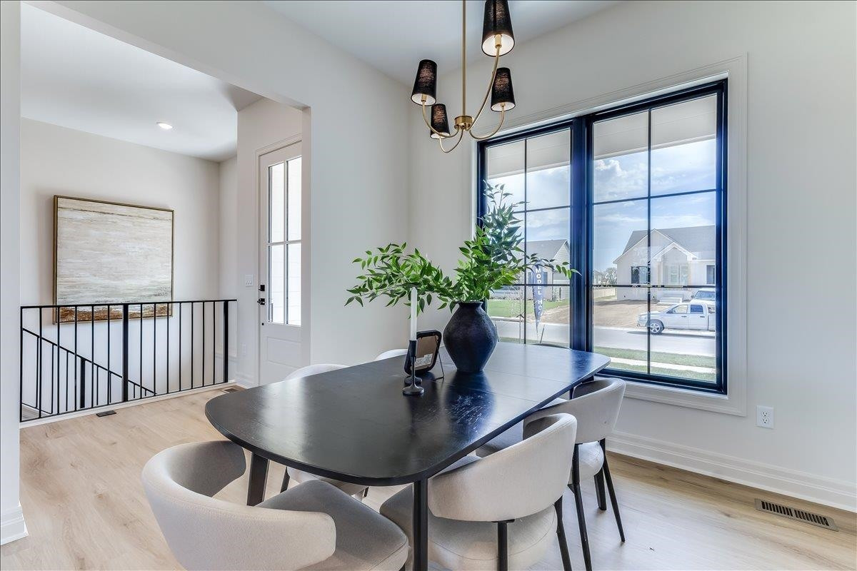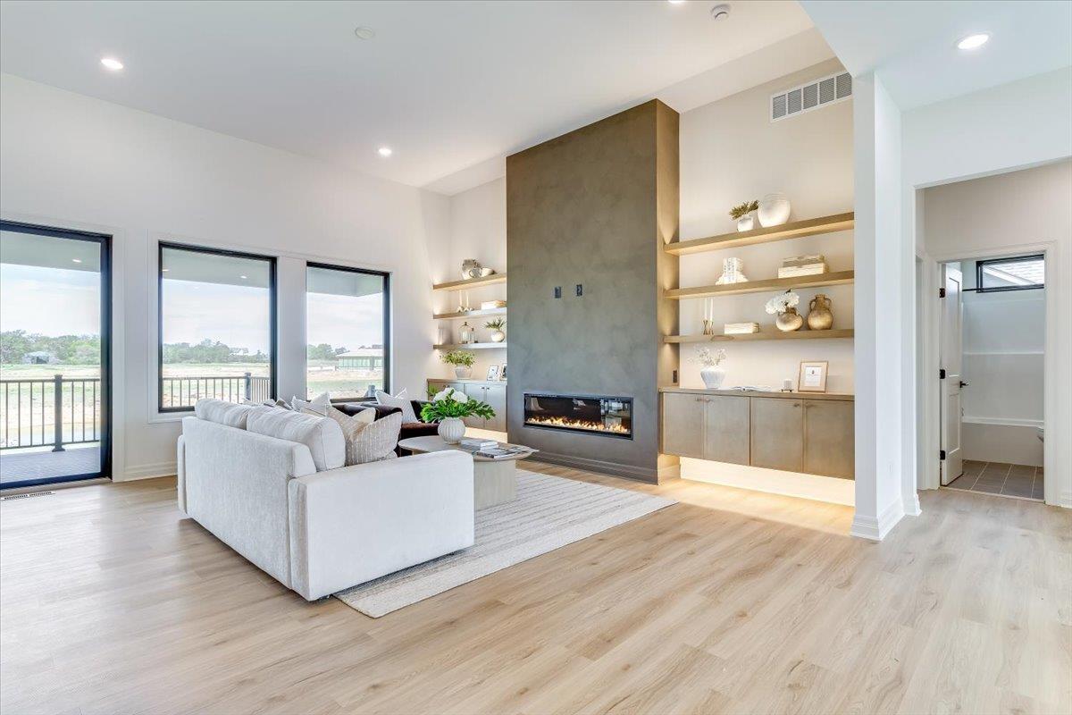 Welcome home to this stunning new floor plan designed for both comfort and style. The inviting dining area is perfectly positioned at the front of the home, creating a warm and welcoming first impression. Exceptional curb appeal is highlighted by a side-load 3-car garage, offering both function and elegance. The heart of the home features a beautiful kitchen that seamlessly overlooks the spacious living room, complete with a large sliding door that opens to a covered deck with breathtaking lake views—perfect for indoor-outdoor living and entertaining. The living room is anchored by a striking electric fireplace, surrounded by custom-built cabinetry and illuminated shelving for a modern, upscale feel. Retreat to the luxurious primary suite, a true oasis with serene lake views. The spa-like bathroom showcases a gorgeous tile shower, floating double vanities, and a spacious walk-in closet conveniently located just across from the dedicated laundry room with folding shelf. The finished basement offers exceptional additional living space, including a large family room with a wet bar and front island seating—ideal for gatherings. Two split bedrooms, each with generous walk-in closets, provide privacy and comfort. Ample storage space throughout the basement adds to the home's functionality. This thoughtfully designed home offers 5 bedrooms, 3 bathrooms, and the perfect blend of style, space, and scenic views. Information deemed reliable but not guaranteed and may change without notice. Specials and generals may not be entirely spread yet on this lot. There is a $250 mailbox fee collected at closing. This is a model home and not for sale at this time
