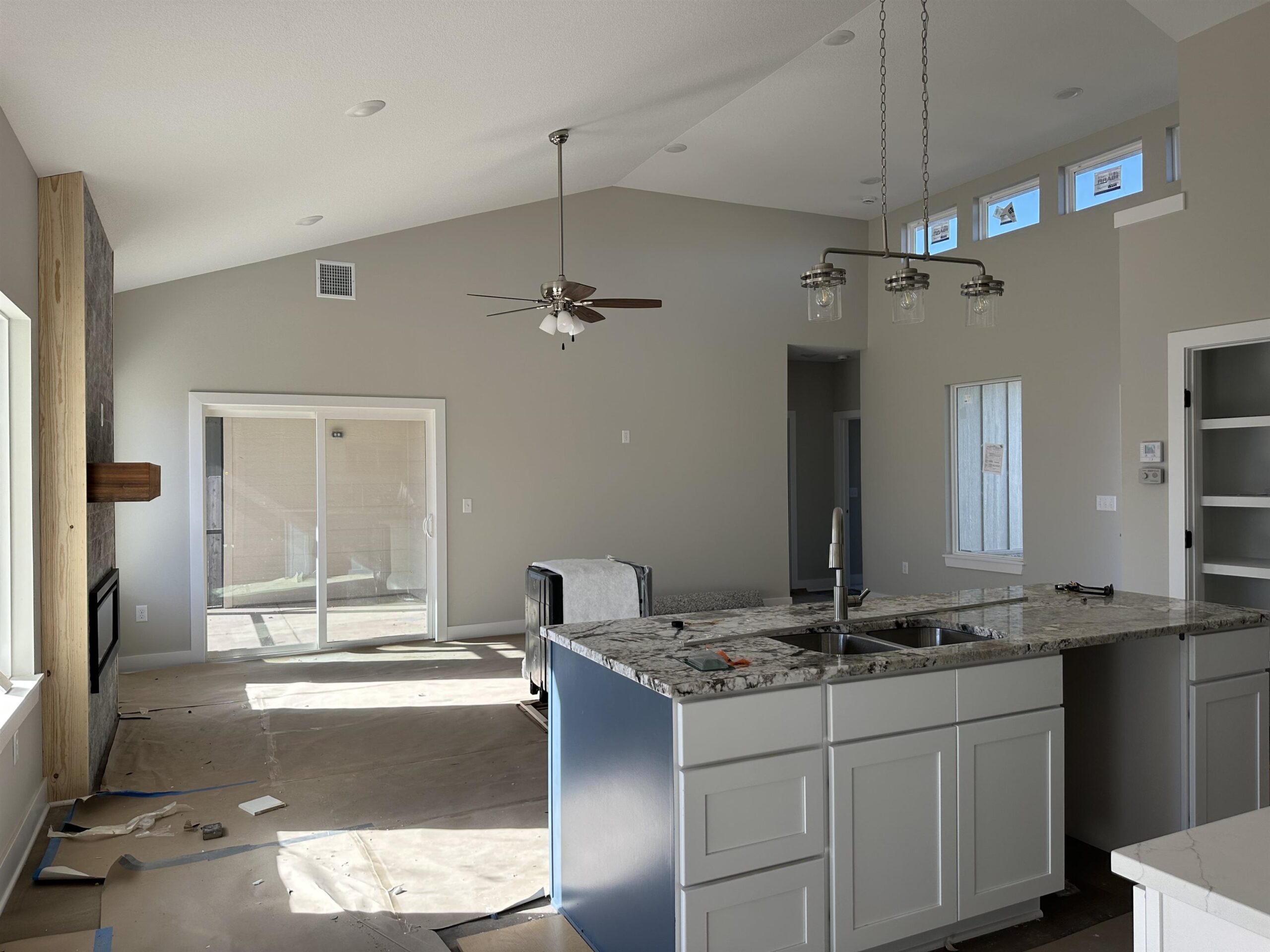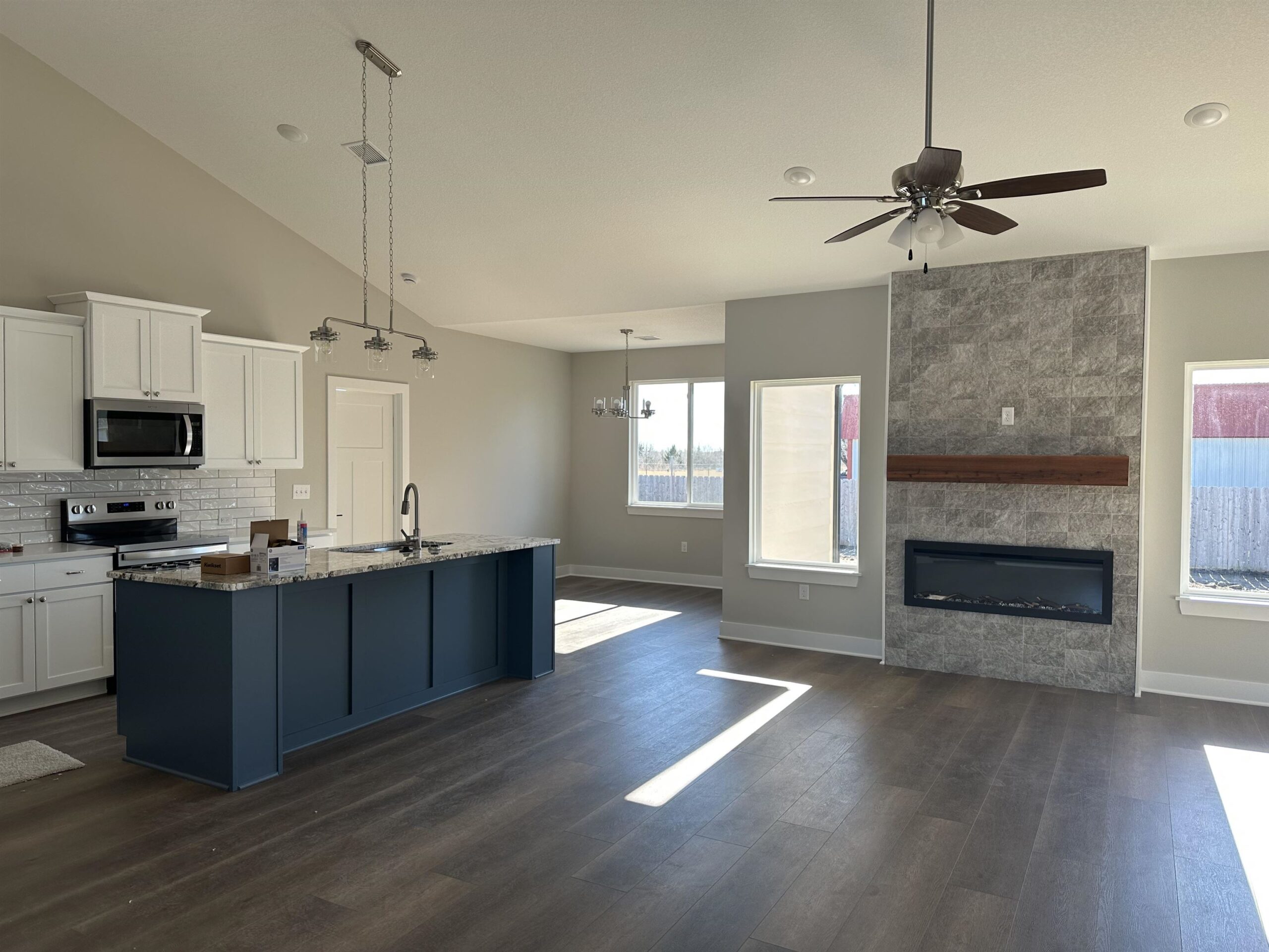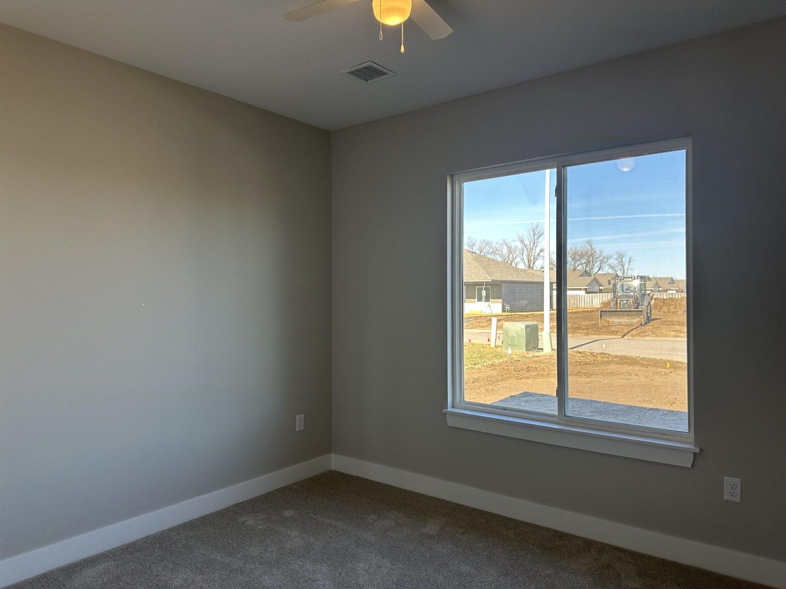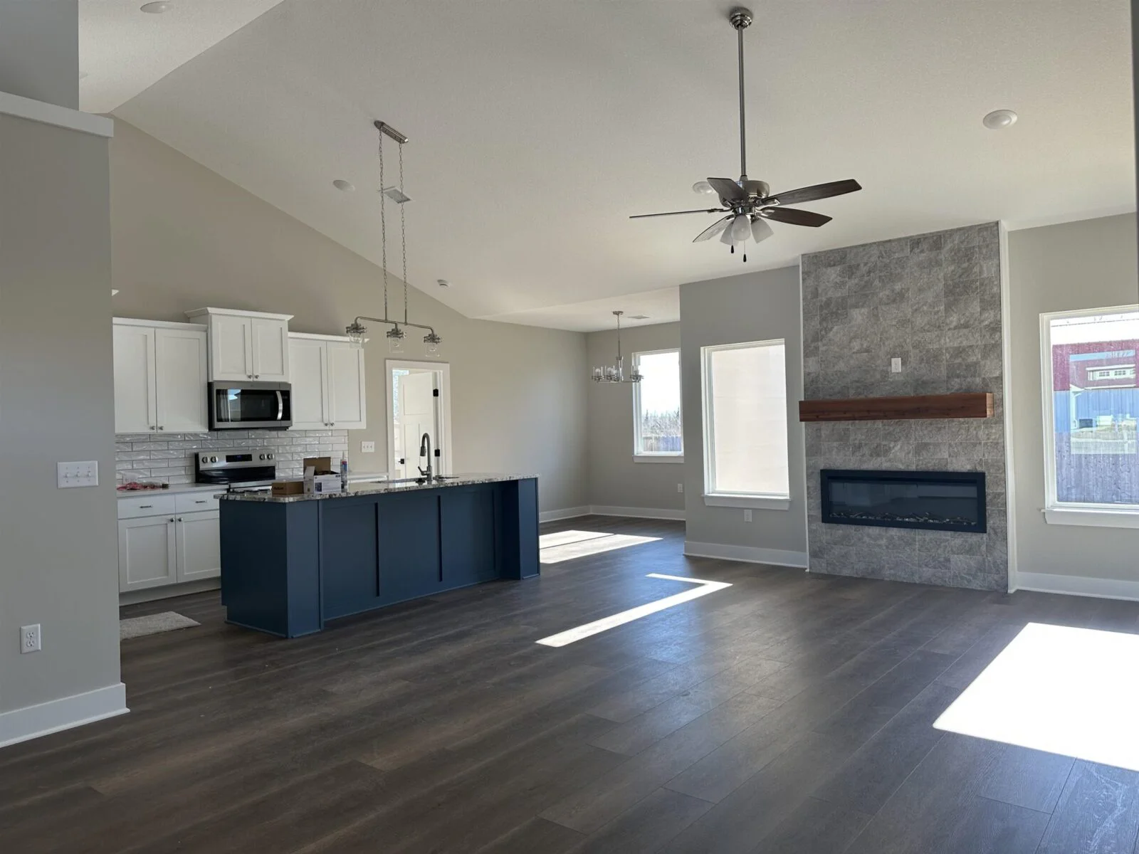 The "Piccolo" plan made larger with 3 bedrooms, 2 baths, and 3 car garage! Lovely kitchen in the very open plan with a nice island with seating overlooking the living room with electric fireplace. You'll love the pretty stone on surrounding the fireplace! Primary suite is spacious with an extra large closet. Off to the side you’ll enjoy the covered and screened in back patio. Spacious 3 car garage includes storm shelter. Curbless shower in primary bath. Fence is included in addition to an extra large concrete patio out back! Includes well, sprinkler, sod, and landscaping. In Edgewater Patios, the homeowners have control over their own well and sprinkler systems, so you determine when and how much you water. Information deemed reliable but not guaranteed and may change without notice. Room sizes estimated. Taxes estimated and shown on vacant lot. Specials may not be entirely spread yet on this lot. There is a $250 mailbox fee collected at closing. One member of Wells Construction LLC is licensed realtor in state of Kansas.
