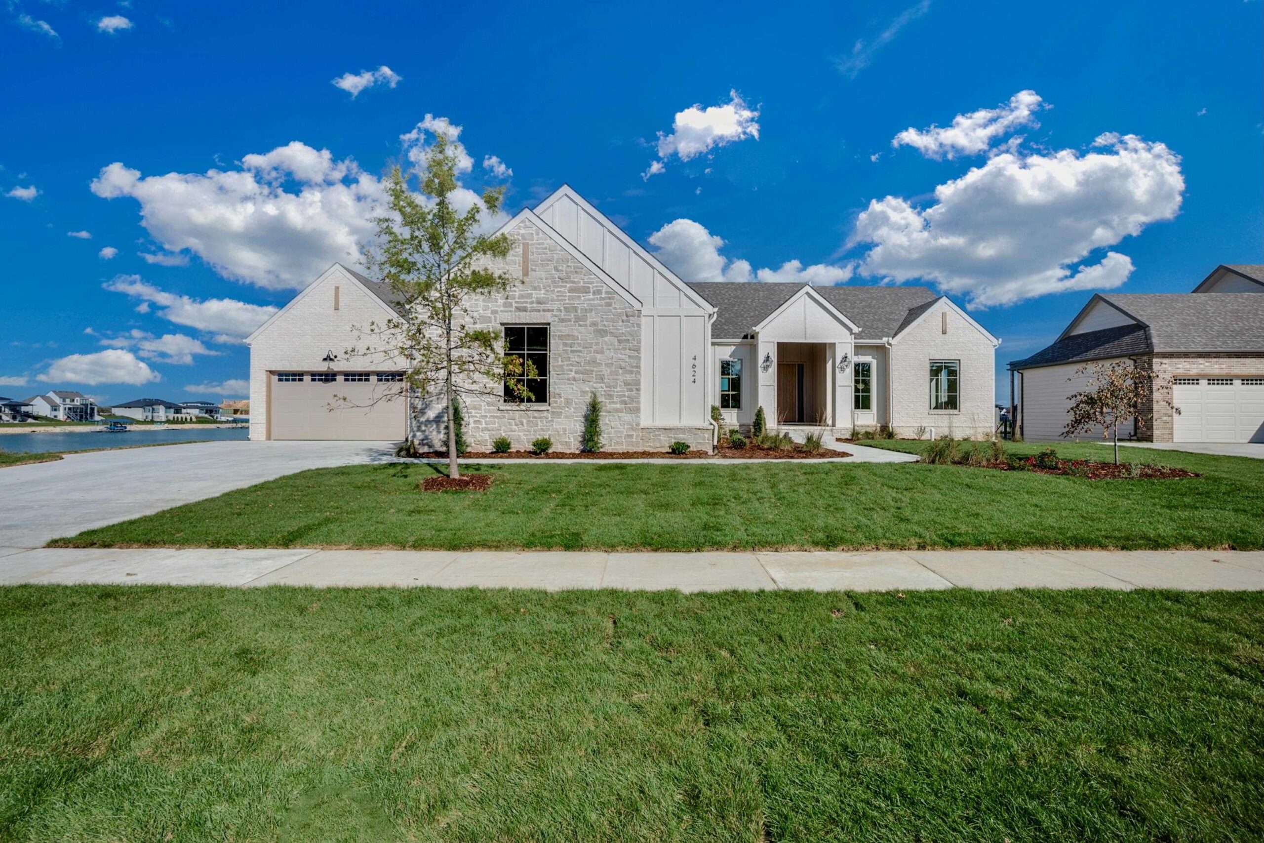 - Description: Welcome to lakeside luxury at its finest. Situated on a breathtaking lakefront lot in the highly coveted Castaway community, The Modesto Plan by Sharp Homes combines timeless elegance from the homes of yesterday, with the modern luxury features and finishes you expect in a home today. From the moment you arrive, the classic elevation accented with natural stone makes a stunning first impression. Step through the arched entryway and into a warm and inviting living room where vaulted beamed ceilings, a gas fireplace, and floor-to-ceiling windows frame show-stopping views of the sparkling lake. Thoughtfully designed arched niches with custom cabinets and floating shelves add a touch of elegance and character. The seamless indoor-outdoor living design includes a large covered deck and an expansive lanai with a second gas fireplace and overhead garage door—perfect for unforgettable gatherings and legendary garage parties. In the kitchen, no detail has been overlooked. Enjoy a spacious island, gas range, granite countertops, custom wine bar, butler’s pantry with bonus workspace, and a dedicated Costco closet for optimal storage. The primary suite is a private sanctuary featuring vaulted, beamed ceilings, dual vanities, a freestanding soaker tub nestled in a graceful arched niche, a fully tiled shower, and a massive walk-in closet complete with a granite-topped dresser and direct access to the laundry room. A discrete pocket office with built-in desk is tucked away just off the main living space—ideal for working from home. Additional main floor bedrooms each include walk-in closets; one offers a private ensuite, while the other enjoys access to a full hall bath. The fully finished lower-level walks out at grade to your private beach area and boasts a sprawling family room with panoramic lake views, an elegant wet bar, and direct access to a full bath from the back of the home—perfect for a day spent on the beach or out on the boat. Two additional bedrooms downstairs each offer cavernous walk-in closets and private bath access. The basement also includes two large storage areas, with one ideal for a future home gym. All of this, located in Castaway, Wichita’s premier lakeside community featuring a 135-acre spring-fed surf lake, lakefront clubhouse and pool with neighborhood beach area, playground, basketball court, and some of the most incredible views in the city! Start calling Castaway home in the incredible Modesto Plan by Sharp Homes. Some information may be estimated and is not guaranteed. Pricing is subject to change without notice. Please verify schools with USD 266.