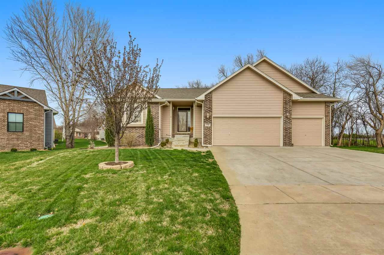 This immaculately maintained home has vaulted ceilings, a cozy gas fireplace, full finished lower level with rec room, 4th bedroom, 3rd bath and office plus a 3 car garage. There is also ample storage for a growing family and this beautiful home is located at the end of a cul de sac on a treed lot with a deck that overlooks the open farm fields for an impressive view. There are many additional upgrades inside and out, new paint, 97% high efficiency gas furnace, 20 Seer H/P, duel fuel system, ADT alarm system, new water softener, radon gas detection system, new sink and full glass front storm door. Located in Wyndham Creek subdivision with easy access to major highways for Wichita and surrounding areas.