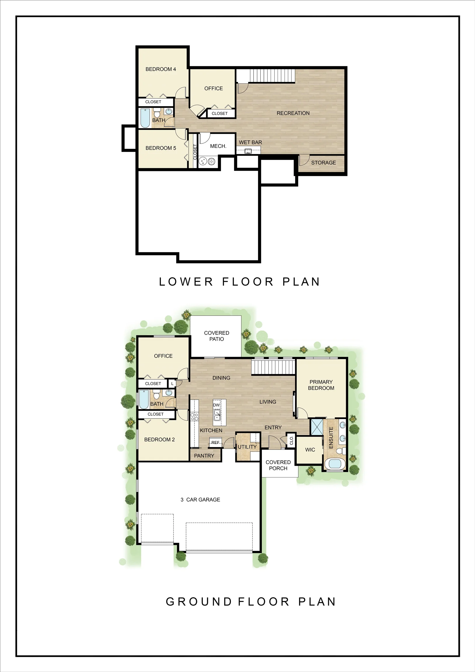This 5 bedroom 3 bath home offers great room with electric fireplace, lvp kitchen, dining and great room, walk in pantry covered composite deck with east backyard on a tree lined lot. The master suite has free standing bath tub, sep shower, double vanity and walk in closet. The lower level completes the home with an additional 3 bedroom, office that could be used as a 6th bedroom, bath, rec room with wet bar. There is a 3 car garage