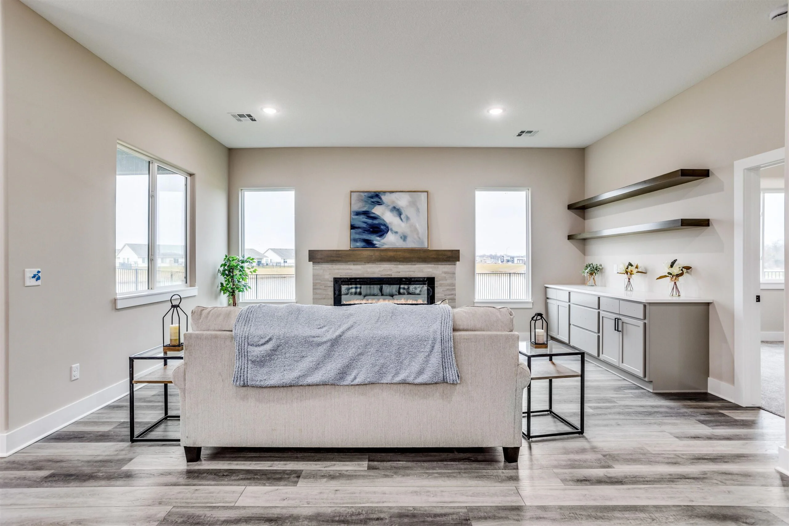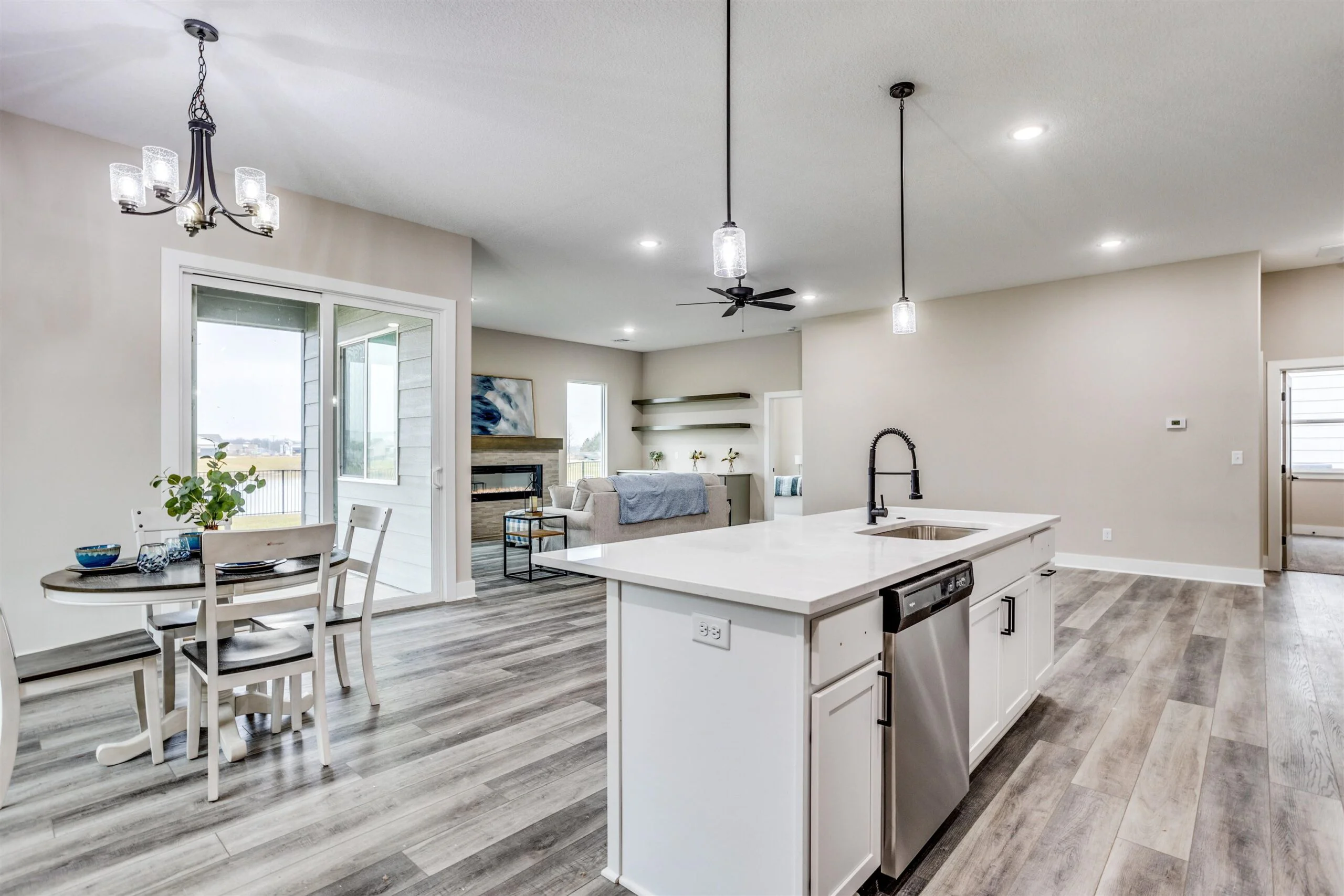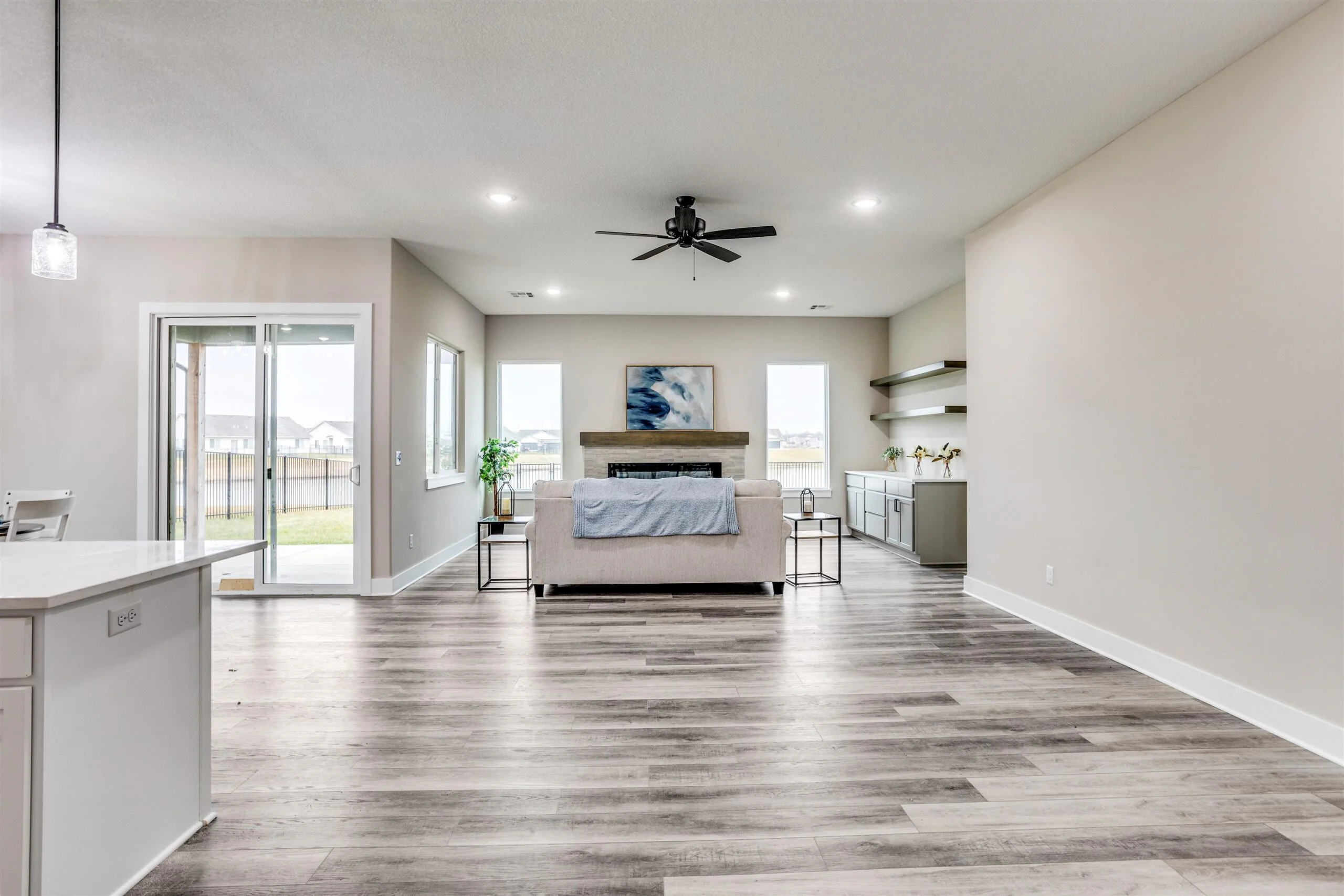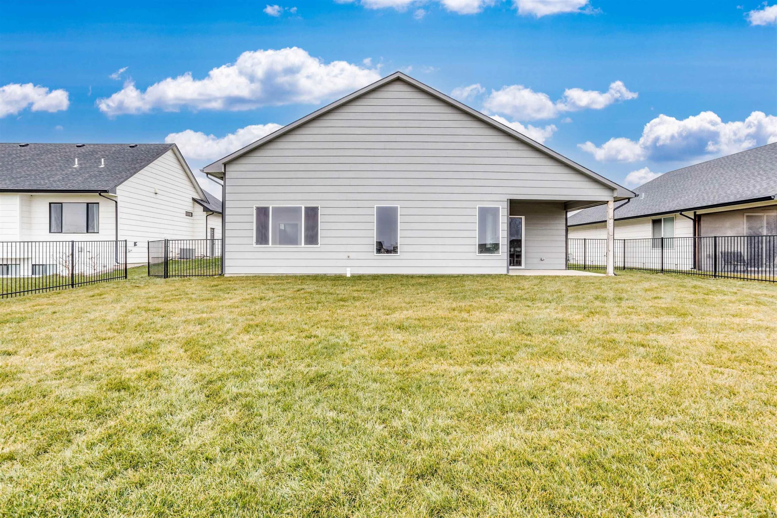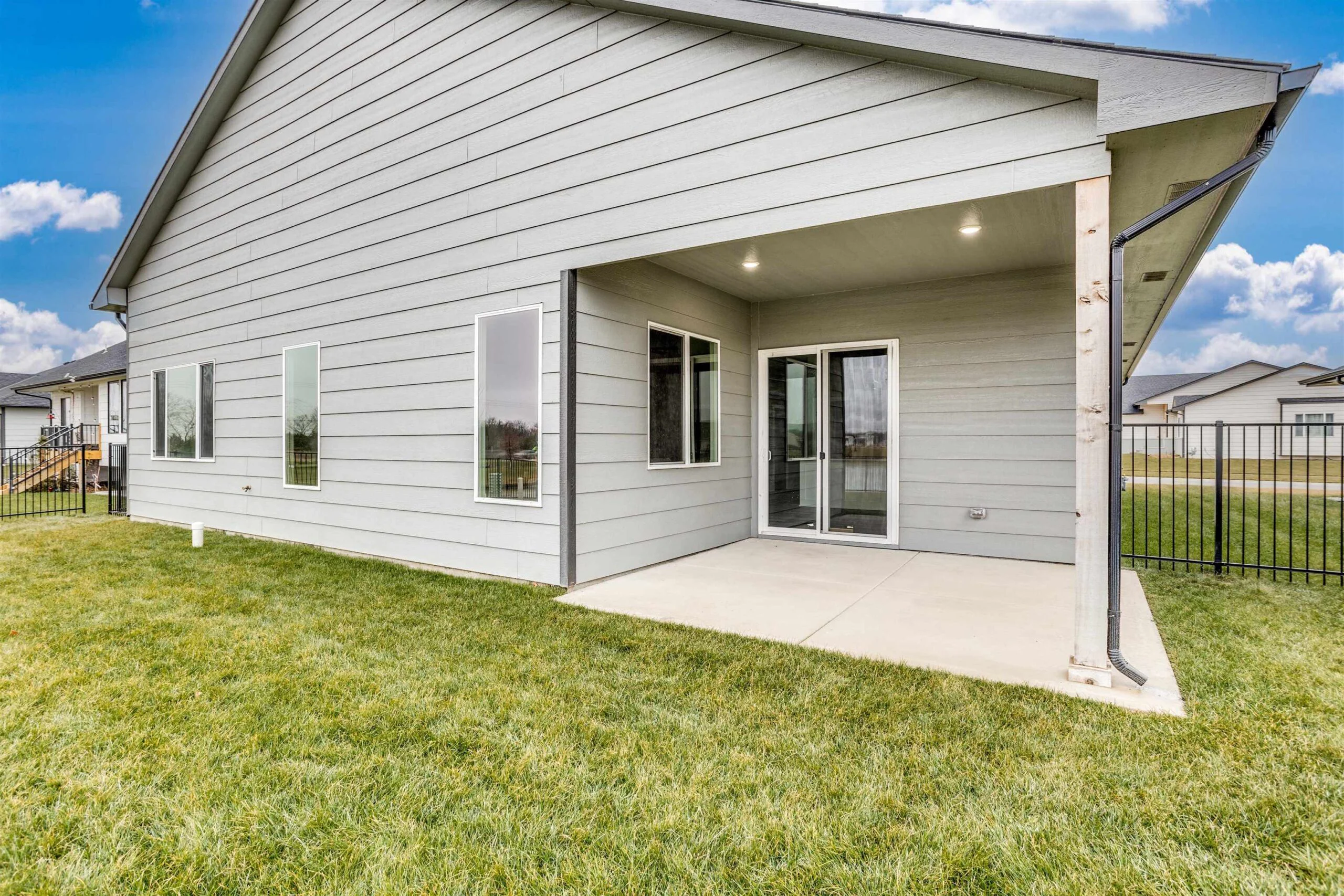 Introducing the Montana Plan by Relph Construction—where luxury meets convenience in a stunning lakefront setting. This thoughtfully designed zero-step home features 3 spacious bedrooms and 2 well-appointed bathrooms, perfect for comfortable living. The large kitchen is a chef’s dream, boasting quartz countertops, an abundance of cabinetry, a walk-in pantry, and a separate dining area for effortless entertaining. Step outside to the covered patio and enjoy serene lake views and a fenced backyard, creating an ideal space to relax or entertain guests. Inside, the open-concept living area is highlighted by an elegant electric fireplace and ample space for hosting family and friends. The luxurious Master Suite is a true retreat, offering a spacious bedroom, a private bath with a low-curb, tile-walled shower, and an expansive walk-in closet. Two additional bedrooms provide generous space and feature two closets each, ensuring plenty of storage for all your needs. For added peace of mind, a concrete storm shelter is conveniently located within the garage, enhancing safety and security. This remarkable home combines modern design, comfort, and functionality, offering a perfect blend of everyday luxury and lakeside living! Some information may be estimated and is not guaranteed. Please verify schools with USD 262.
