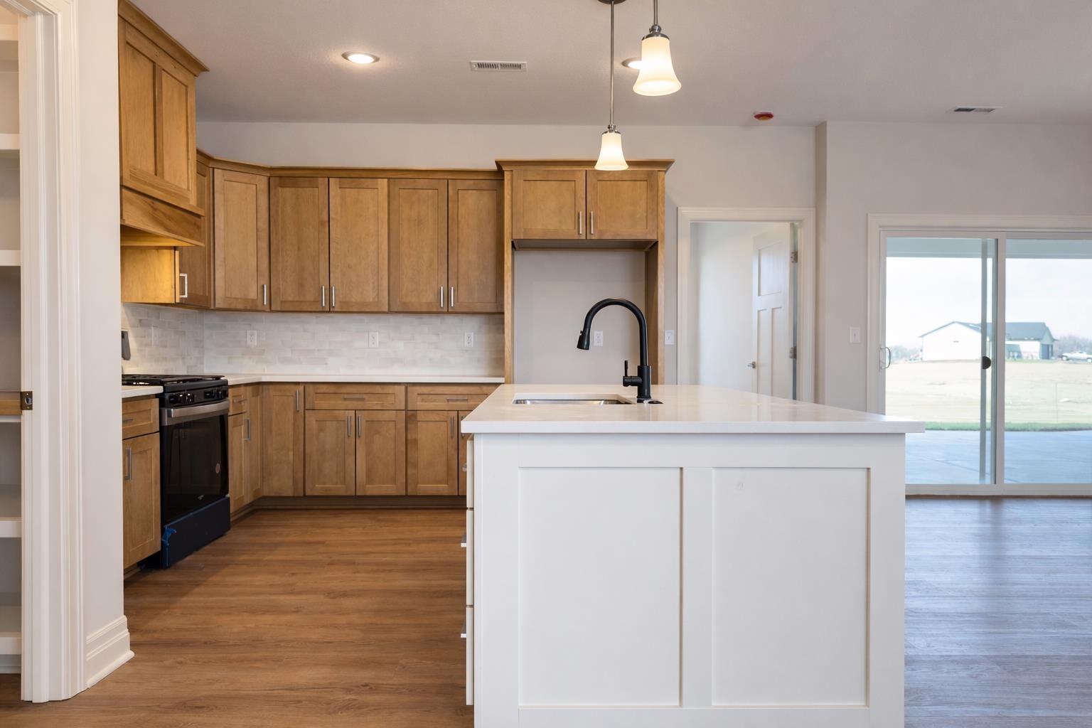 The Willow Plan by RJ Castle Custom Homes is a newly finished zero-entry home designed with comfort, accessibility, and everyday living in mind. Situated on a spacious half-acre lot with no rear neighbors, this home offers privacy, functionality, and room to breathe—all in the desirable Watermarke community. Inside, you’ll find a spacious living room featuring a cozy fireplace, built-in cabinets, and floating shelves, seamlessly flowing into a well-equipped kitchen with quartz countertops, gas range, large center island, walk-in pantry, and abundant cabinet space. The generous dining area provides plenty of room to expand your table, making it ideal for hosting family gatherings and entertaining friends. The luxurious primary suite includes a large bedroom with a beamed ceiling, private bath, and walk-in closet. Two additional spacious bedrooms—each with its own walk-in closet—share a full hall bath with quartz countertops. A separate laundry room offers built-in storage shelves and a folding table for added convenience. Enjoy outdoor living on the large, fully covered patio, which could easily be screened in the future. The massive 3-car tandem garage is a standout feature, complete with a separate walk-out door providing direct access to the patio—perfect for a workshop, extra storage, gardening gear, or even hosting legendary garage parties. Available now in Watermarke—don’t miss your opportunity to own this thoughtfully designed, move-in-ready home! Some information may be estimated and is not guaranteed. Please verify schools with USD 262.
