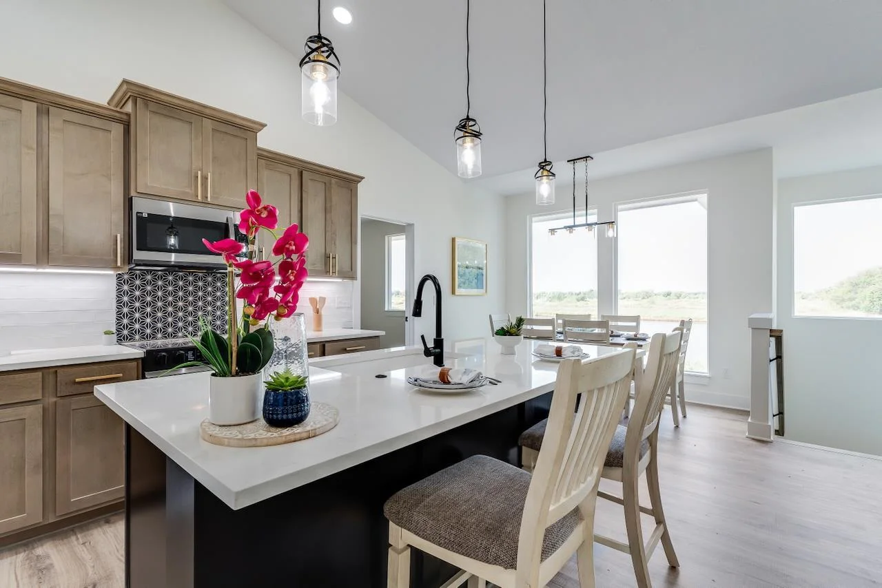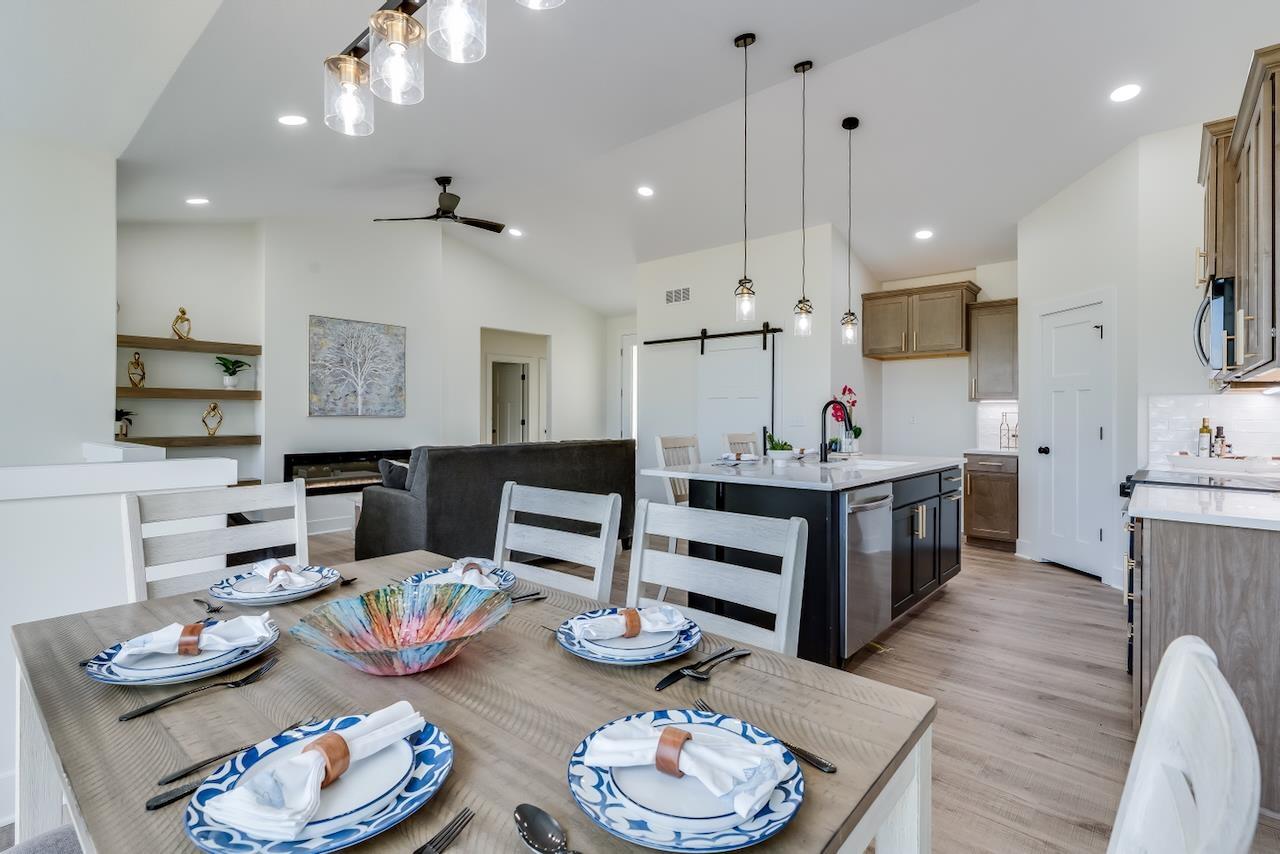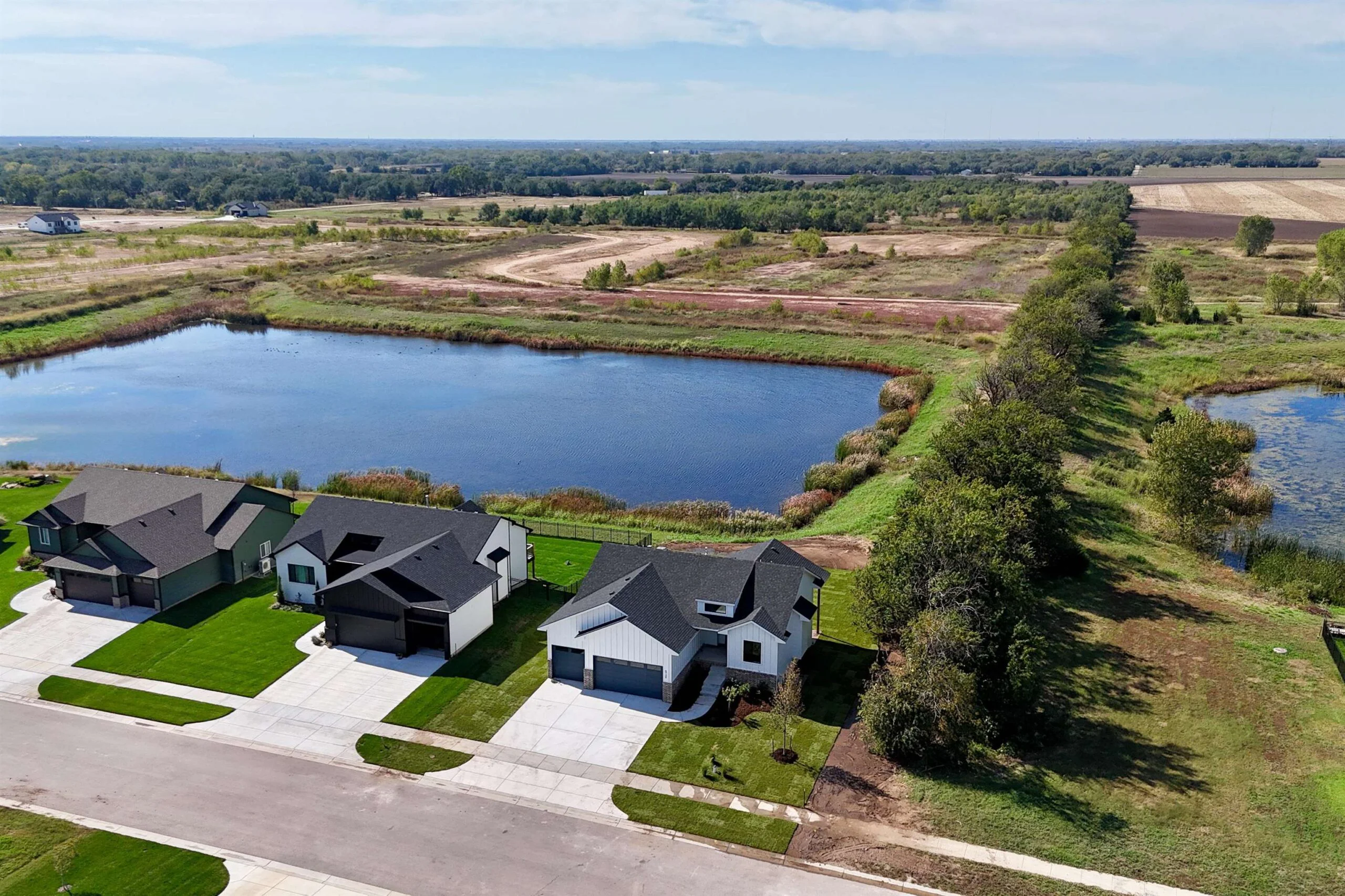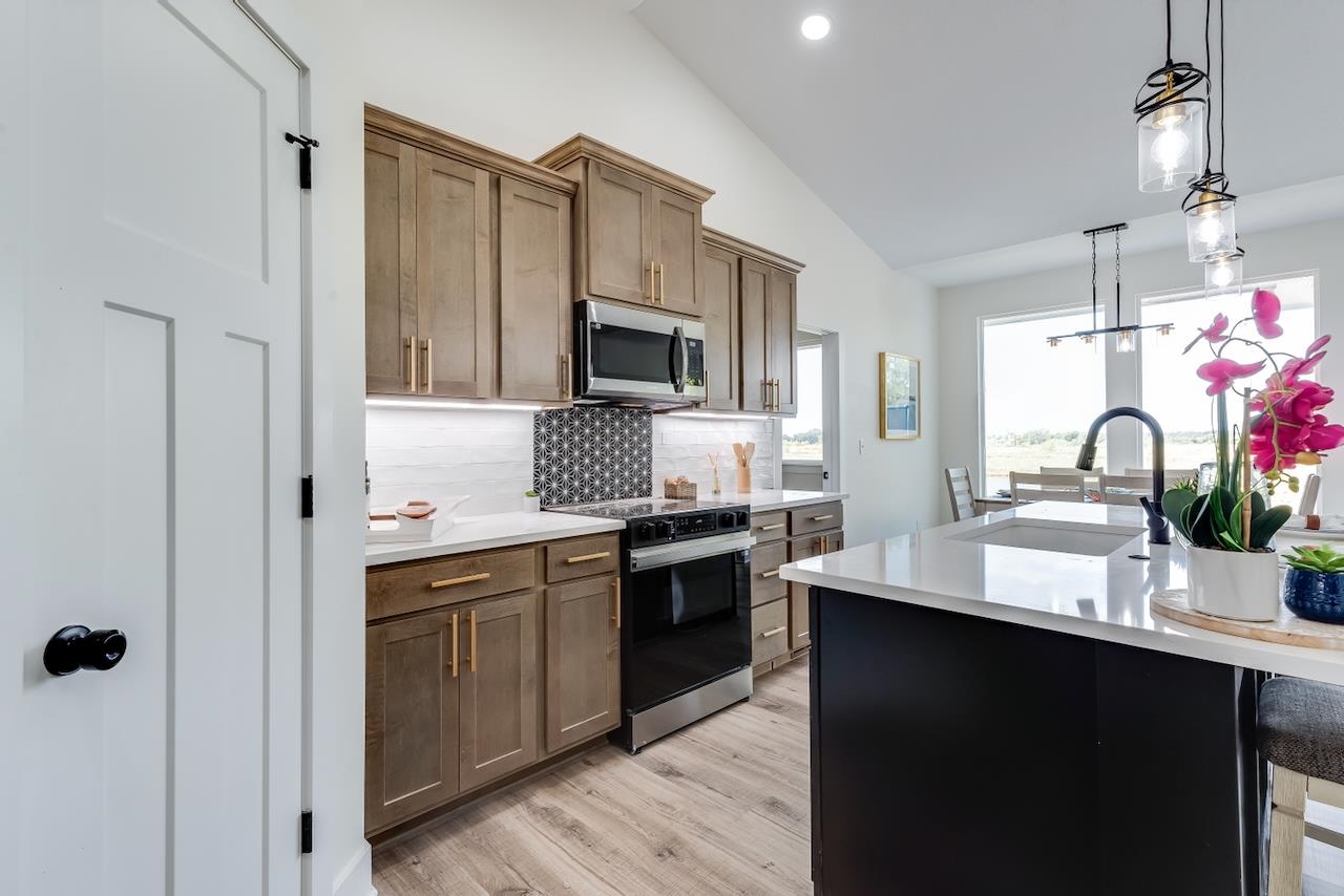 Welcome to the Anne-Marie Plan by Homes-R-Us—now available in the sought-after Watermarke community! Perfectly positioned on a rare lake lot with HOA green space and mature trees along one side, this home offers exceptional privacy while being just a short walk from the neighborhood pool and playground. The timeless front elevation and beautifully manicured landscaping create an inviting first impression. Inside, a spacious living room greets you with soaring vaulted ceilings, expansive picture windows framing the lake, and a stylish fireplace flanked by built-in shelving. The well-appointed kitchen features a large island, quartz countertops, abundant cabinetry, and a generous walk-in pantry with custom storage—an ideal setup for everyday living and entertaining. The adjoining dining area is framed with a large picture window, offering serene lake views at every meal. Retreat to the luxurious primary suite, complete with LVP flooring, a tray ceiling, dual-vanity bath with a tile shower, and a walk-in closet complete with seasonal hanging for maximum storage. The main level also includes a convenient mud/laundry room off the garage entrance with a built-in bench and cubbies, plus two additional bedrooms served by a full hall bath. Thoughtfully placed stairs at the back of the home lead to a spacious mid-level walkout and a large covered patio—perfectly positioned to enjoy the peaceful backdrop of mature trees and stocked fishing lake. The fully finished lower level adds exceptional living space, featuring a huge family room with a walk-up wet bar, two sizable bedrooms each with walk-in closets, a full bath, and ample storage. This incredible lake-lot home blends luxury, privacy, and convenience—available now in Watermarke! Some information may be estimated and is not guaranteed. Please verify schools with USD 262.