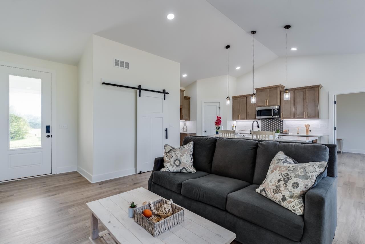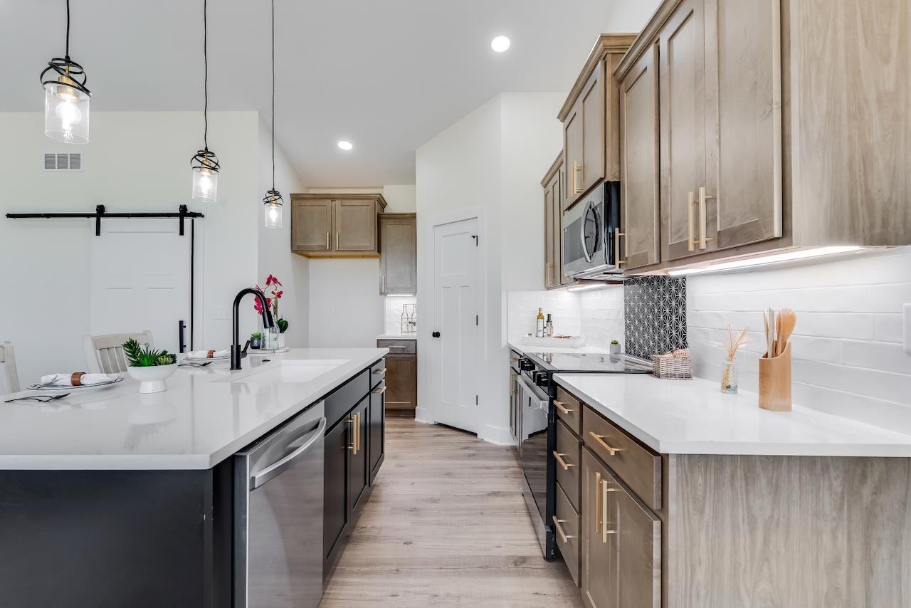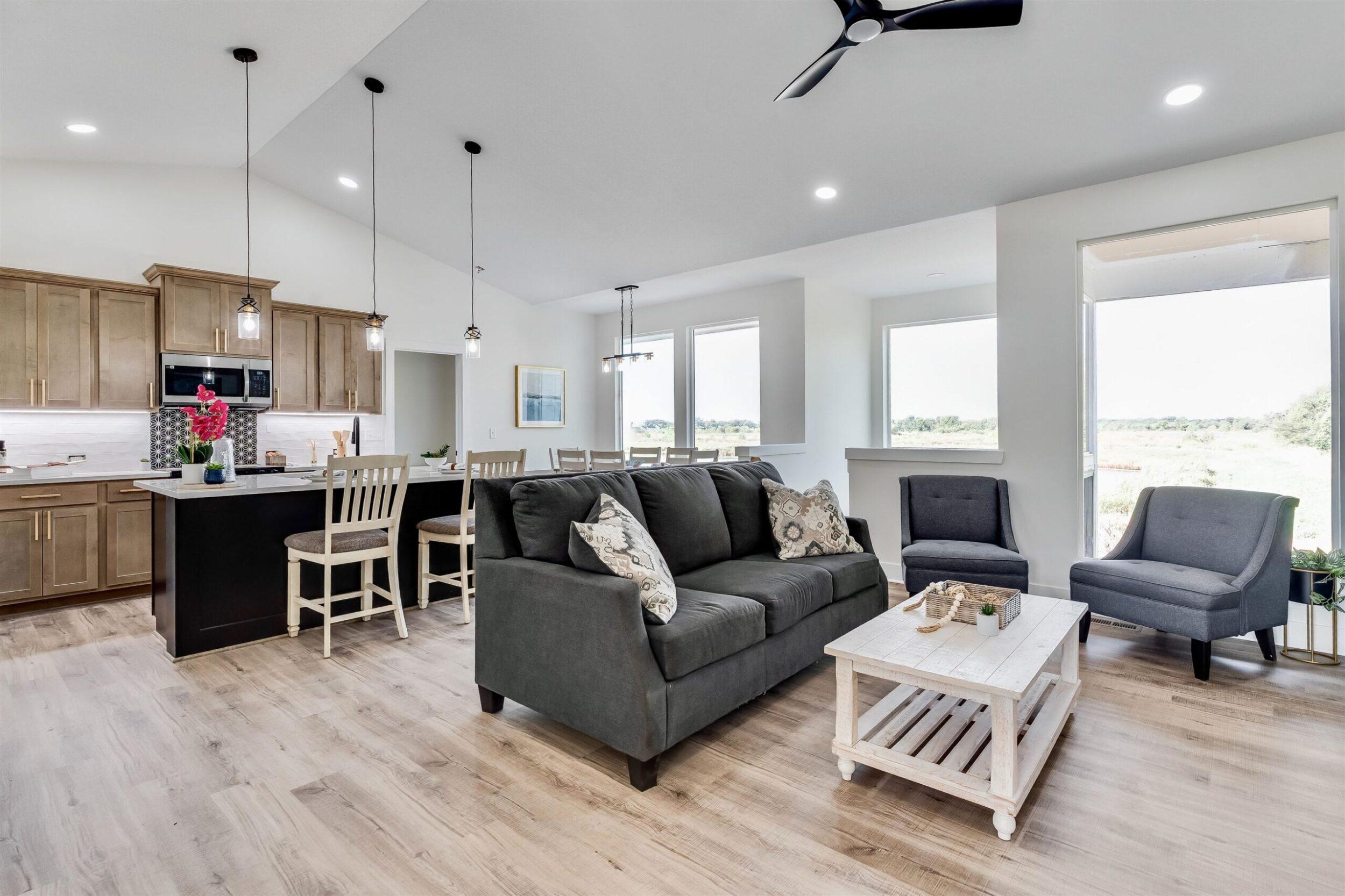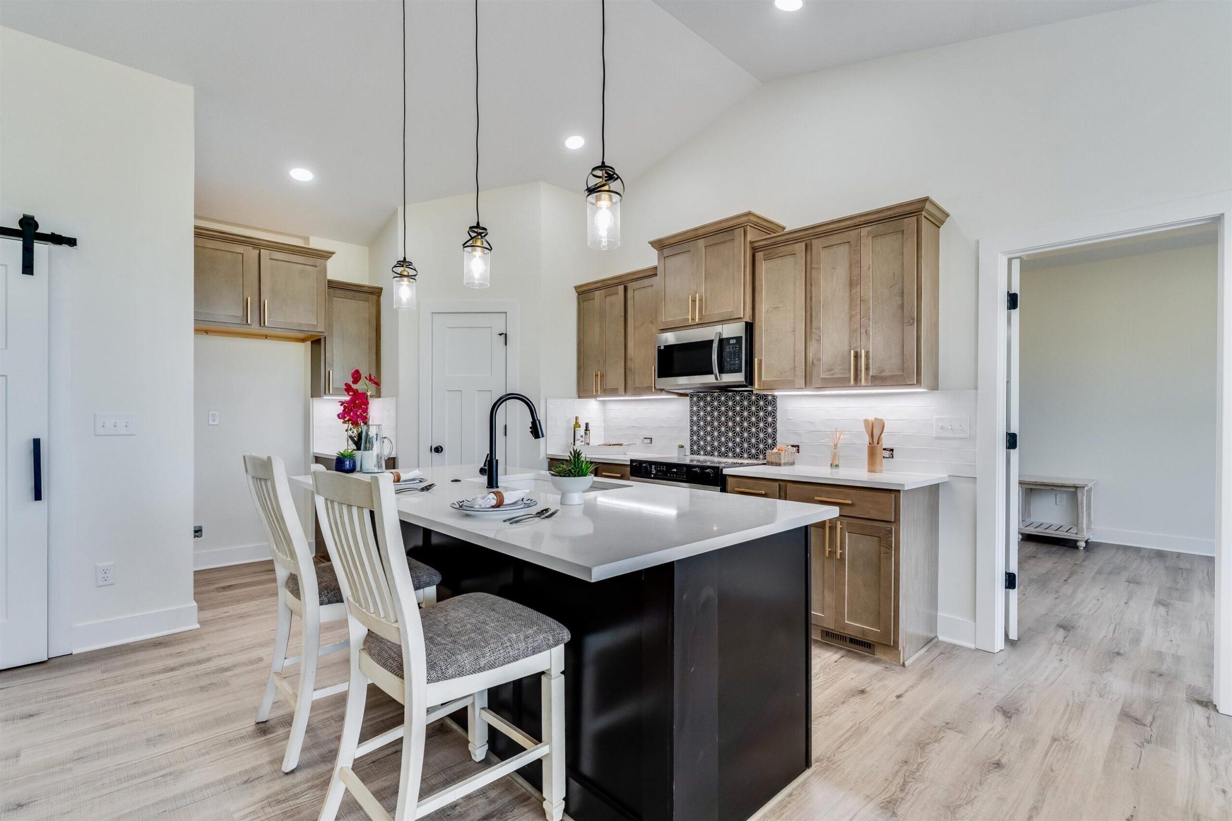 Welcome to the Anne-Marie Plan by Homes-R-Us—now available in the sought-after Watermarke community! Perfectly positioned on a rare lake lot with HOA green space and mature trees along one side, this home offers exceptional privacy while being just a short walk from the neighborhood pool and playground. The timeless front elevation and beautifully manicured landscaping create an inviting first impression. Inside, a spacious living room greets you with soaring vaulted ceilings, expansive picture windows framing the lake, and a stylish fireplace flanked by built-in shelving. The well-appointed kitchen features a large island, quartz countertops, abundant cabinetry, and a generous walk-in pantry with custom storage—an ideal setup for everyday living and entertaining. The adjoining dining area is framed with a large picture window, offering serene lake views at every meal. Retreat to the luxurious primary suite, complete with LVP flooring, a tray ceiling, dual-vanity bath with a tile shower, and a walk-in closet complete with seasonal hanging for maximum storage. The main level also includes a convenient mud/laundry room off the garage entrance with a built-in bench and cubbies, plus two additional bedrooms served by a full hall bath. Thoughtfully placed stairs at the back of the home lead to a spacious mid-level walkout and a large covered patio—perfectly positioned to enjoy the peaceful backdrop of mature trees and stocked fishing lake. The fully finished lower level adds exceptional living space, featuring a huge family room with a walk-up wet bar, two sizable bedrooms each with walk-in closets, a full bath, and ample storage. This incredible lake-lot home blends luxury, privacy, and convenience—available now in Watermarke! Some information may be estimated and is not guaranteed. Please verify schools with USD 262.