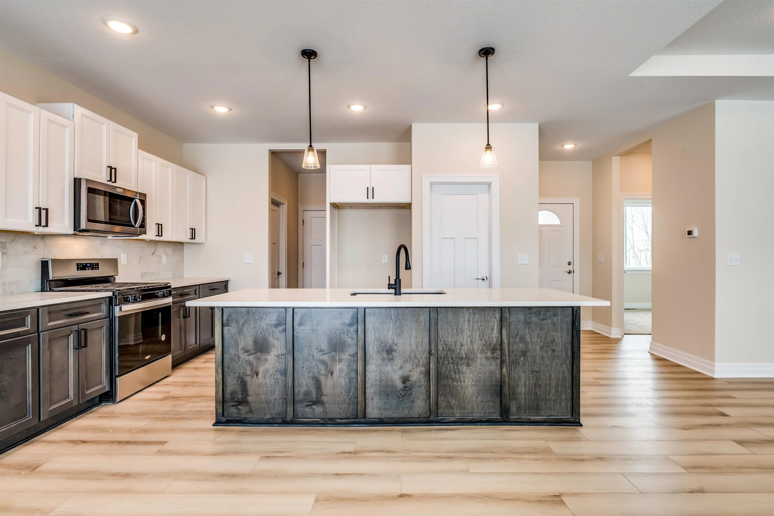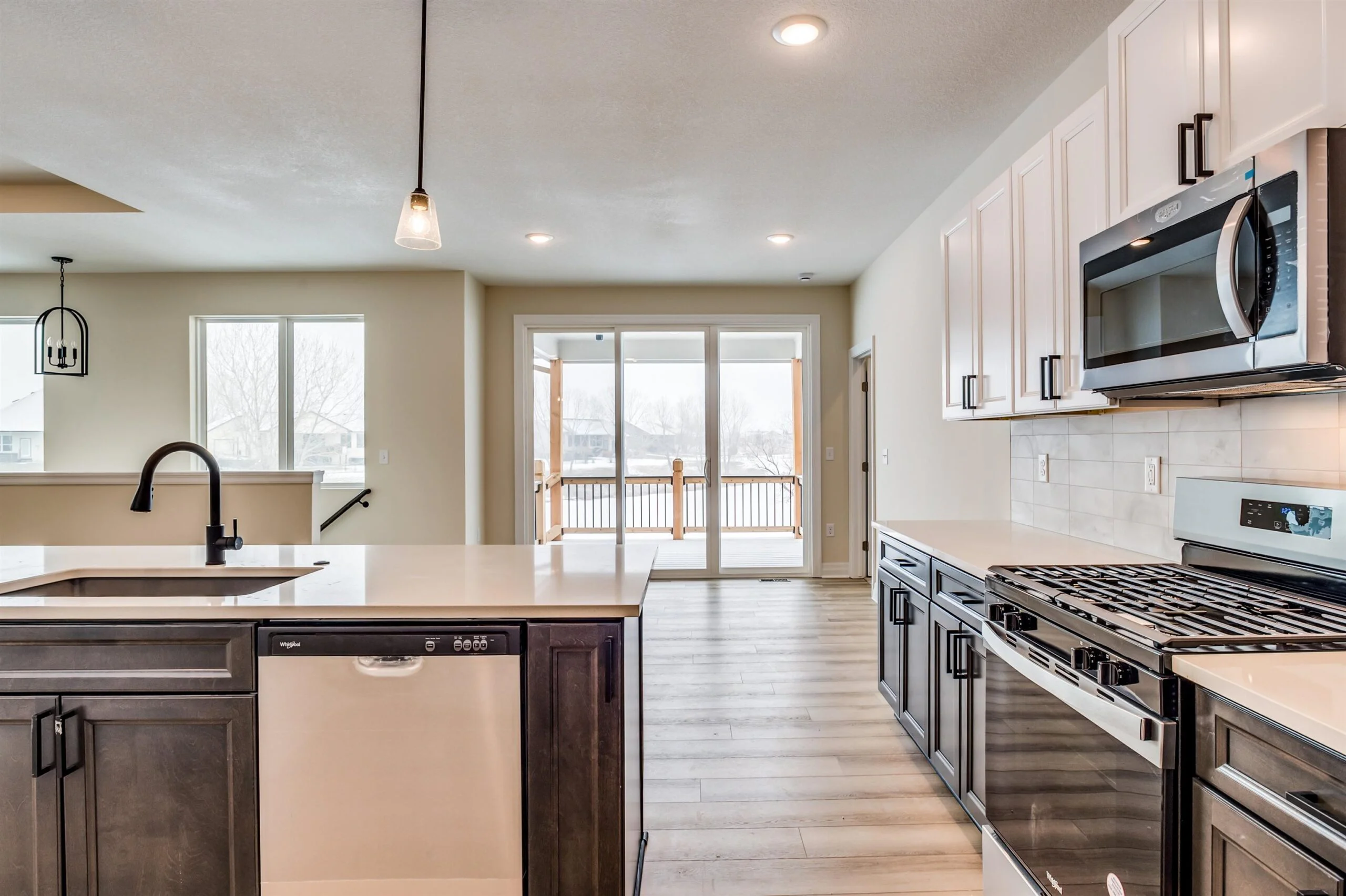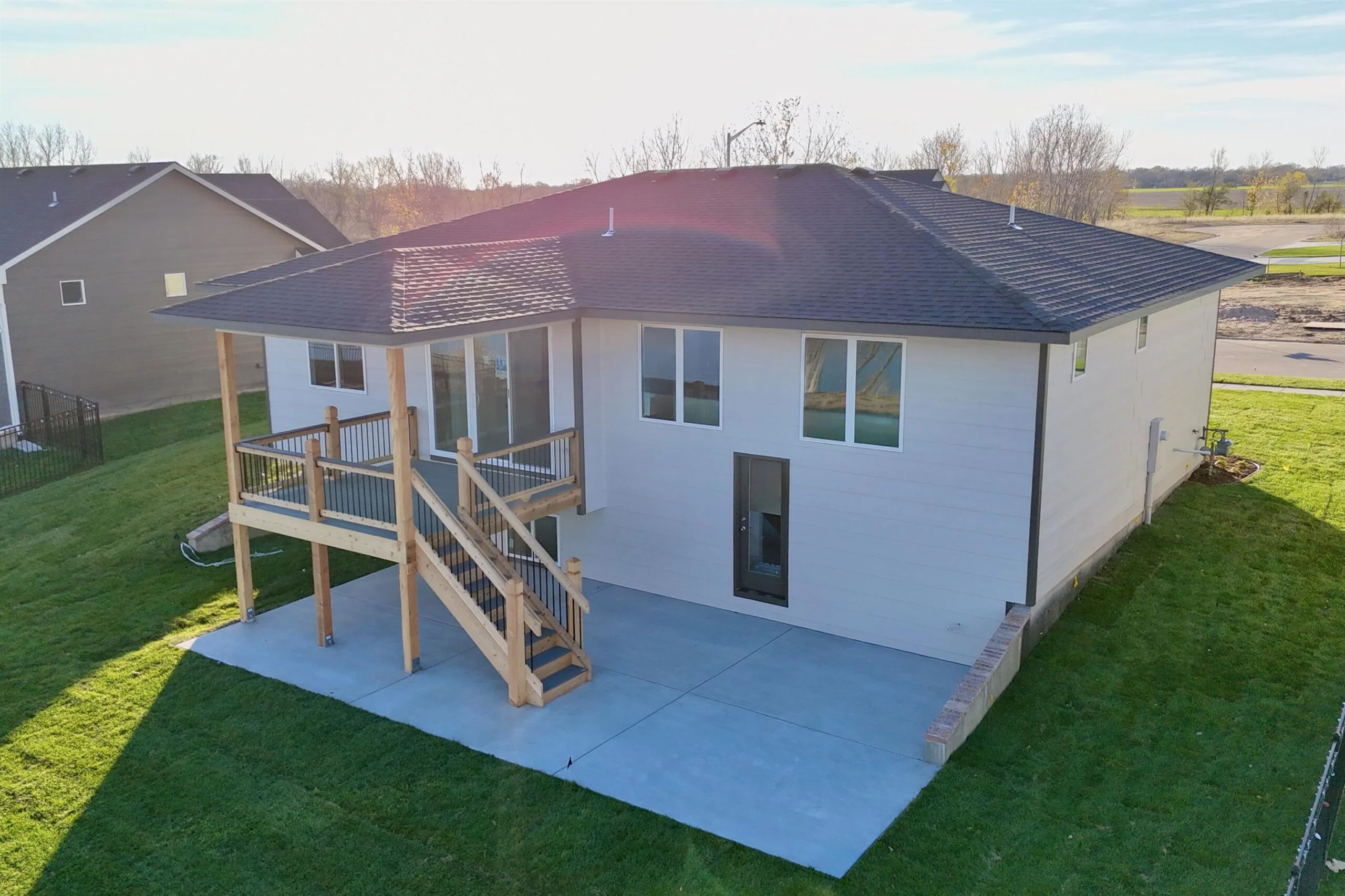 Back by popular demand, this Baby Bella Plan by RJ Castle Custom Homes offers an exceptional opportunity to live on a gorgeous lakefront lot in one of Wichita's premier neighborhoods—Watermarke. This stunning 4-bedroom, 3-bathroom home is designed for both comfort and style, featuring a spacious master suite with a private bath, full tile shower, and an expansive walk-in closet. The heart of the home is the open, light-filled living area, with a rear-facing kitchen complete with sleek quartz countertops, a walk-in pantry, and a seamless flow into the living room for easy entertaining. Step outside to enjoy a large covered deck that leads to a spacious ground-level patio, perfect for outdoor gatherings and enjoying the serene lake views. The fully finished lower level offers even more space to spread out, with a generous family room, a walk-up wet bar, 2 additional bedrooms, and a full bath. For added convenience, the 3-car garage includes an extra rear-facing garage door, offering easy access to the backyard with a concrete slab for parking or additional storage. Don't miss your chance to own this beautiful home in the coveted Watermarke community—where luxury living meets lakeside tranquility! Finished interior pictures are of a finished version of this plan previously built in Watermarke (Exact finishes will vary). Some information may be estimated and is not guaranteed. Please verify schools with USD 262.