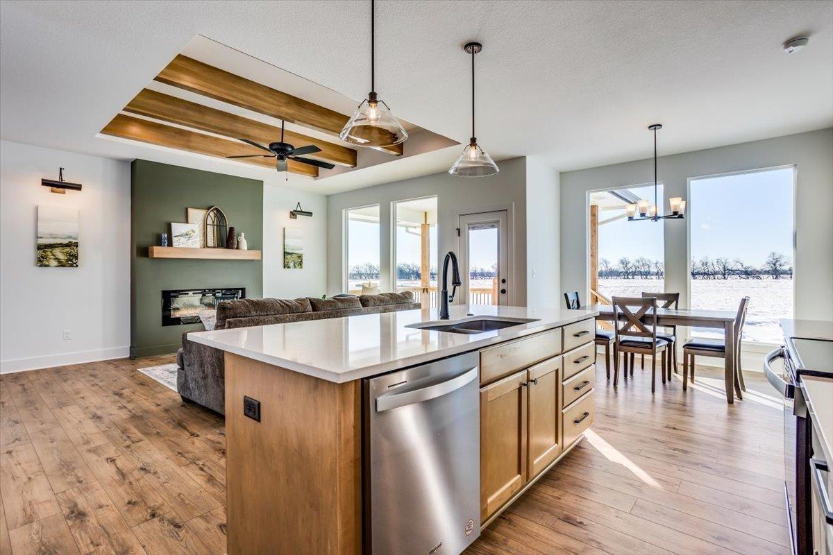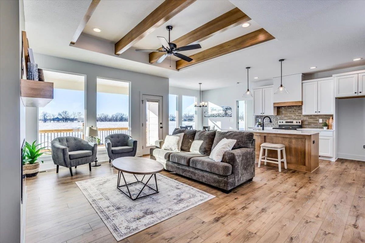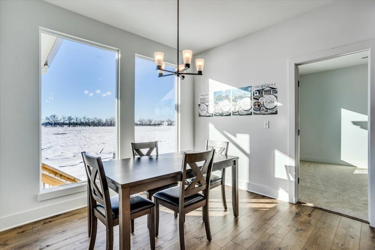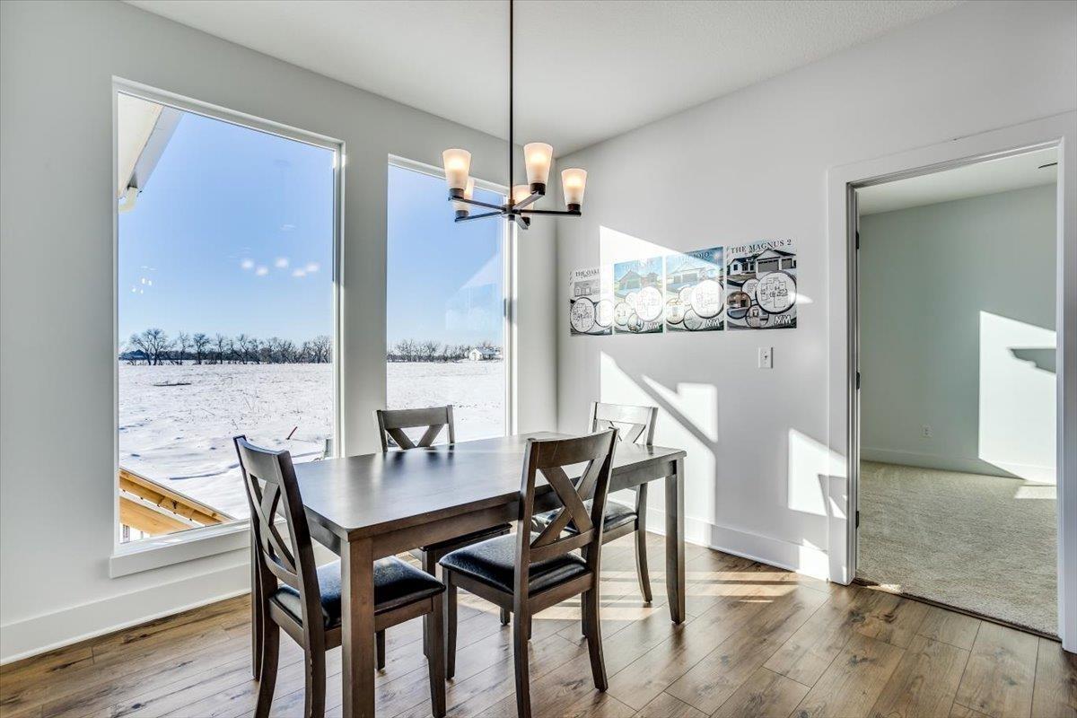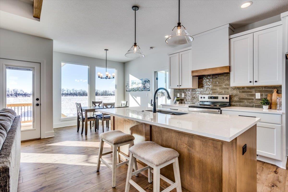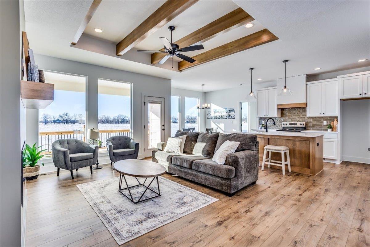 Welcome to the Magnus 2 Plan by M&M Custom Construction, a stunning new home tucked away on a quiet cul-de-sac lot in Watermarke. Showcasing a timeless front elevation with modern architectural flair, this home offers elegant finishes, thoughtful design, and the high-quality craftsmanship M&M Custom Construction is known for. The main floor features a spacious living room with 10-foot ceilings, warm wood beam accents, large picture windows, and an electric fireplace with a wood mantle, flanked by built-in cabinets and shelving. A walk-out door leads to the expansive covered deck, complete with stairs down to a large ground-level patio, creating the perfect setup for relaxing or entertaining. The well-equipped kitchen includes quartz countertops, a custom-built range hood, abundant cabinet space, and a walk-in pantry. The adjoining dining area is filled with natural light from large picture windows. The luxurious primary suite offers a spacious bedroom, private bath with dual vanity, tile shower, soaker tub, and walk-in closet. Two additional bedrooms, a full hall bath, drop zone at the garage entrance, and a separate laundry room complete the main level. The finished basement continues to impress with a massive family room, media wall with custom trim and LED accent lighting, large wet bar, two spacious bedrooms each with walk-in closets, a full hall bath, and plenty of storage. Available now in Watermarke, this beautifully crafted home combines comfort, style, and function in an exceptional setting. Some information may be estimated and is not guaranteed. Please verify schools with USD 262.