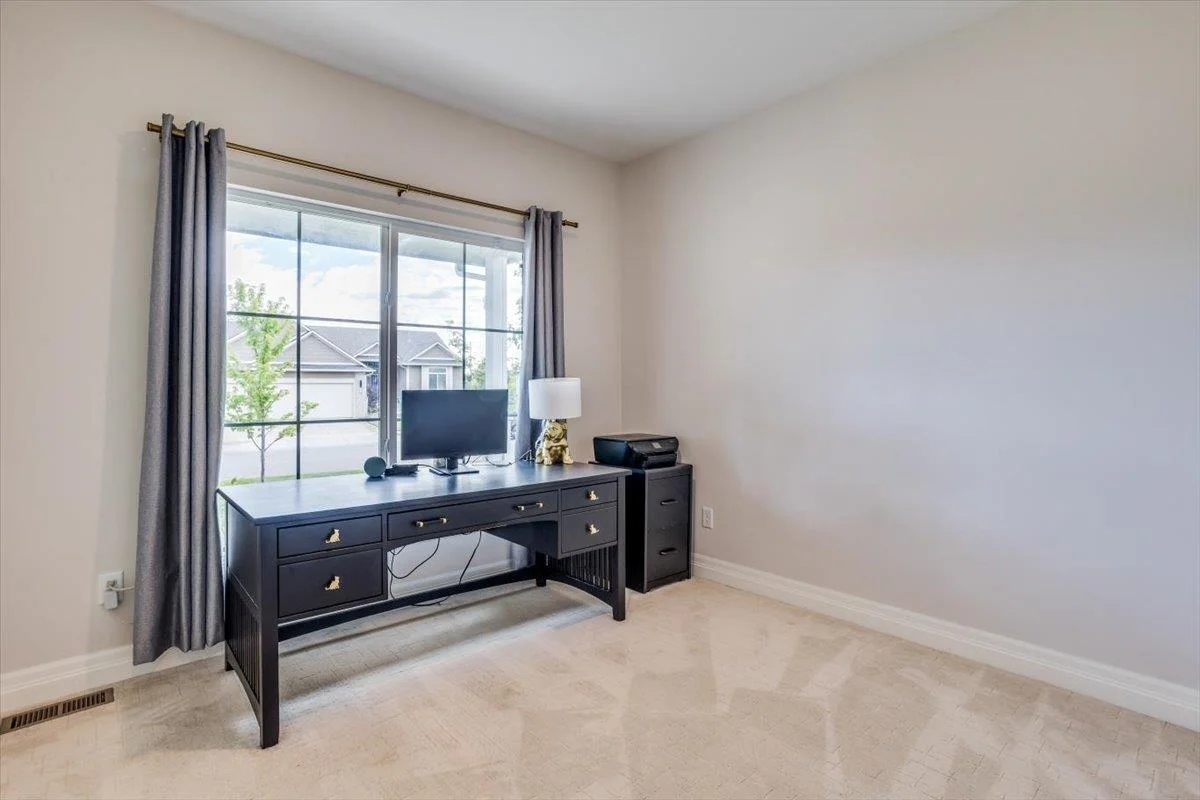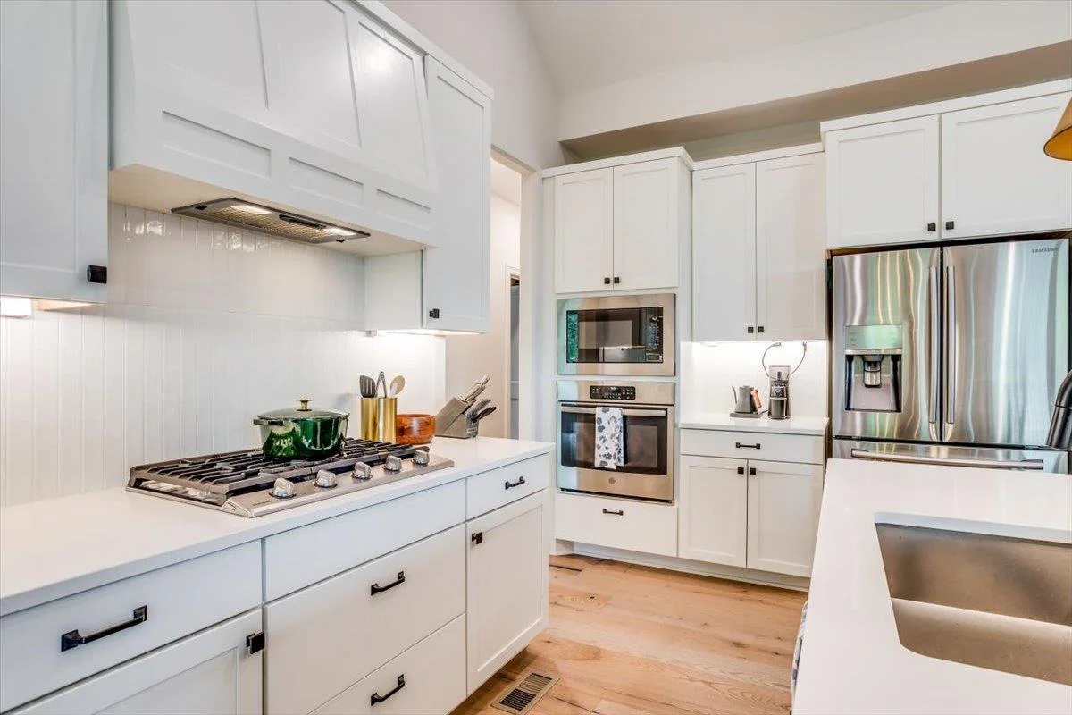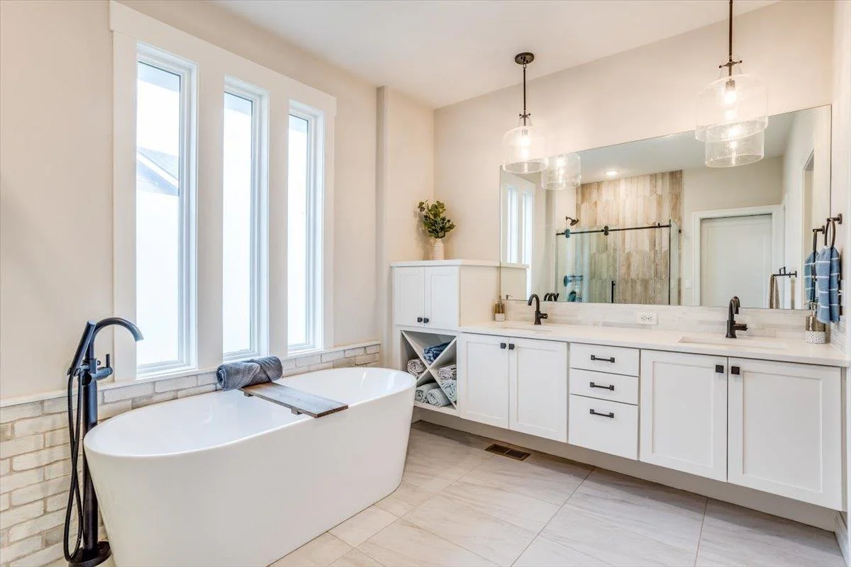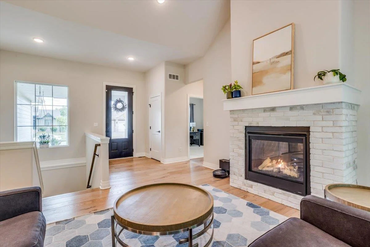 What an inviting front porch complete with porch swing on Aspen former model home by Paul Gray Homes in Edgewater! This split 5 bedroom 4 bath home takes advantage of the gorgeous lake and wooded views with floor to ceiling windows in the living room! The living room ceiling soars to a vault with beams, with long pendant lights hung over the island. The master bath is a spa with slipper tub in front of trio of narrow vertical windows, custom glass wall shower and door, & sliding barn door. The master closet is a storage dream and is just across from the separate laundry room and washer and dryer stay with the home. Kitchen is spotless with wall oven/microwave, custom vented range hood, large walk in pantry with countertops, white quartz, gas range cook top, stainless steel refrigerator, and dark faucet and cabinet pulls for a striking contrast. Upgraded cabinets and drawers are soft close. Come see the custom architecture done on the corners! The hall bath has a European flair with patterned floor. The basement is completely finished with 2 more bedrooms (one of which has a private bath so its an extra primary suite), family room with wetbar and bar fridge that stays, additional 4th bathroom, and large storeroom, with finished areas all having LVP floors. Relax on the large covered composite deck or concrete patio out back in the wooded private back yard! Swing set and umbrella in concrete out back stay with the home. Garage is finished out with insulation, sheetrock, and paint! Information deemed reliable but not guaranteed and may change without notice.