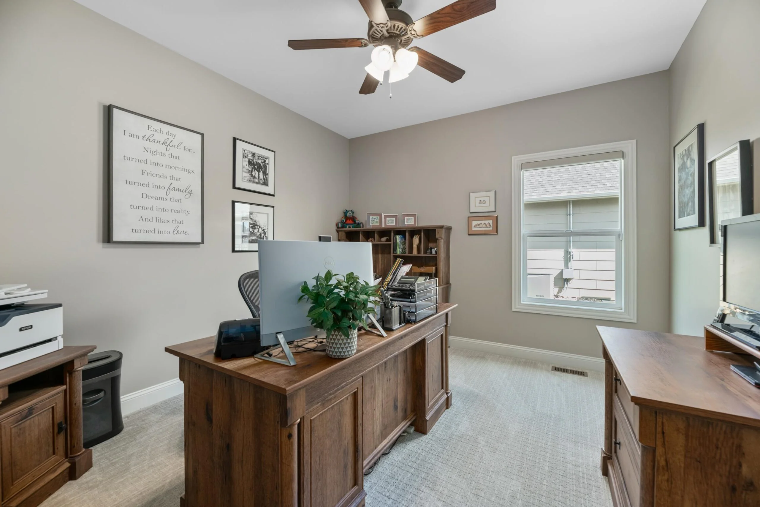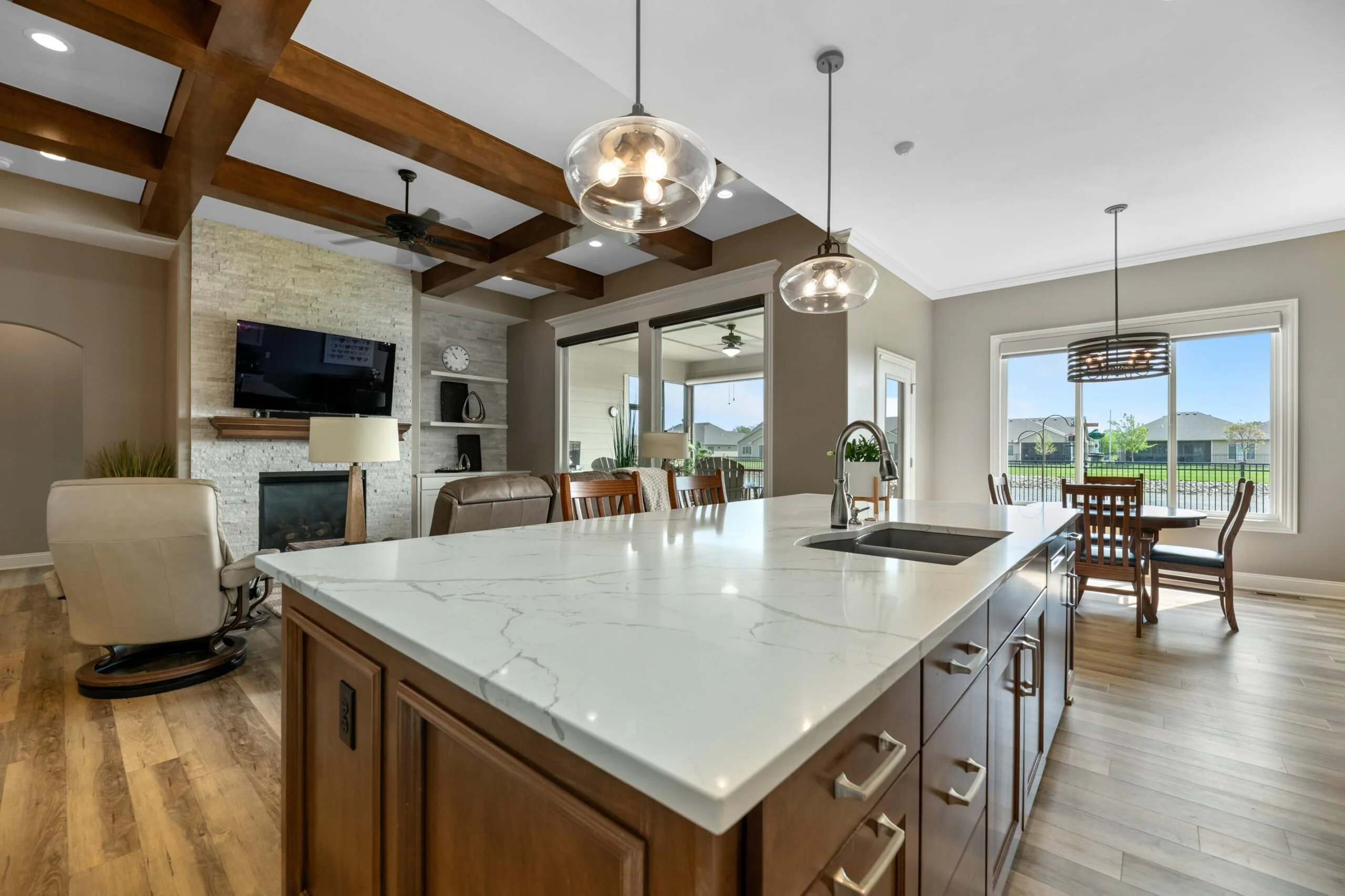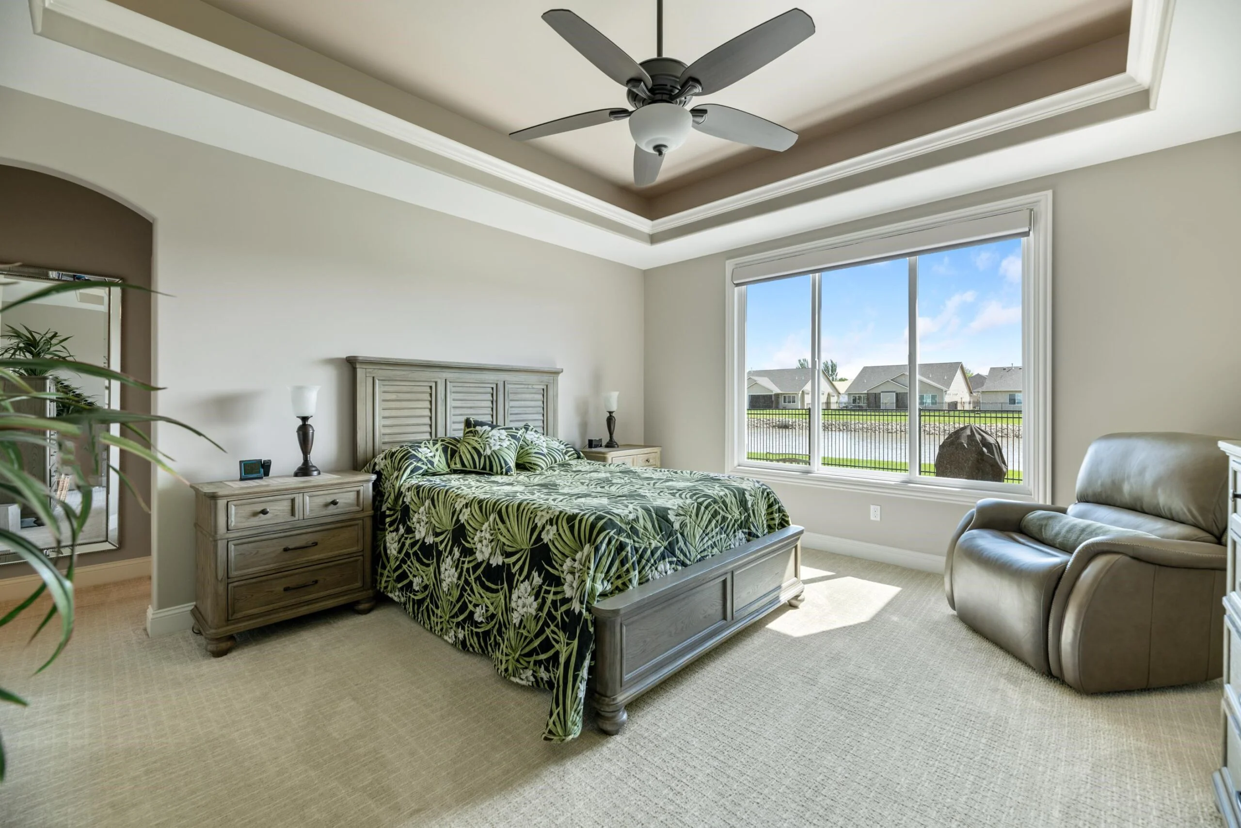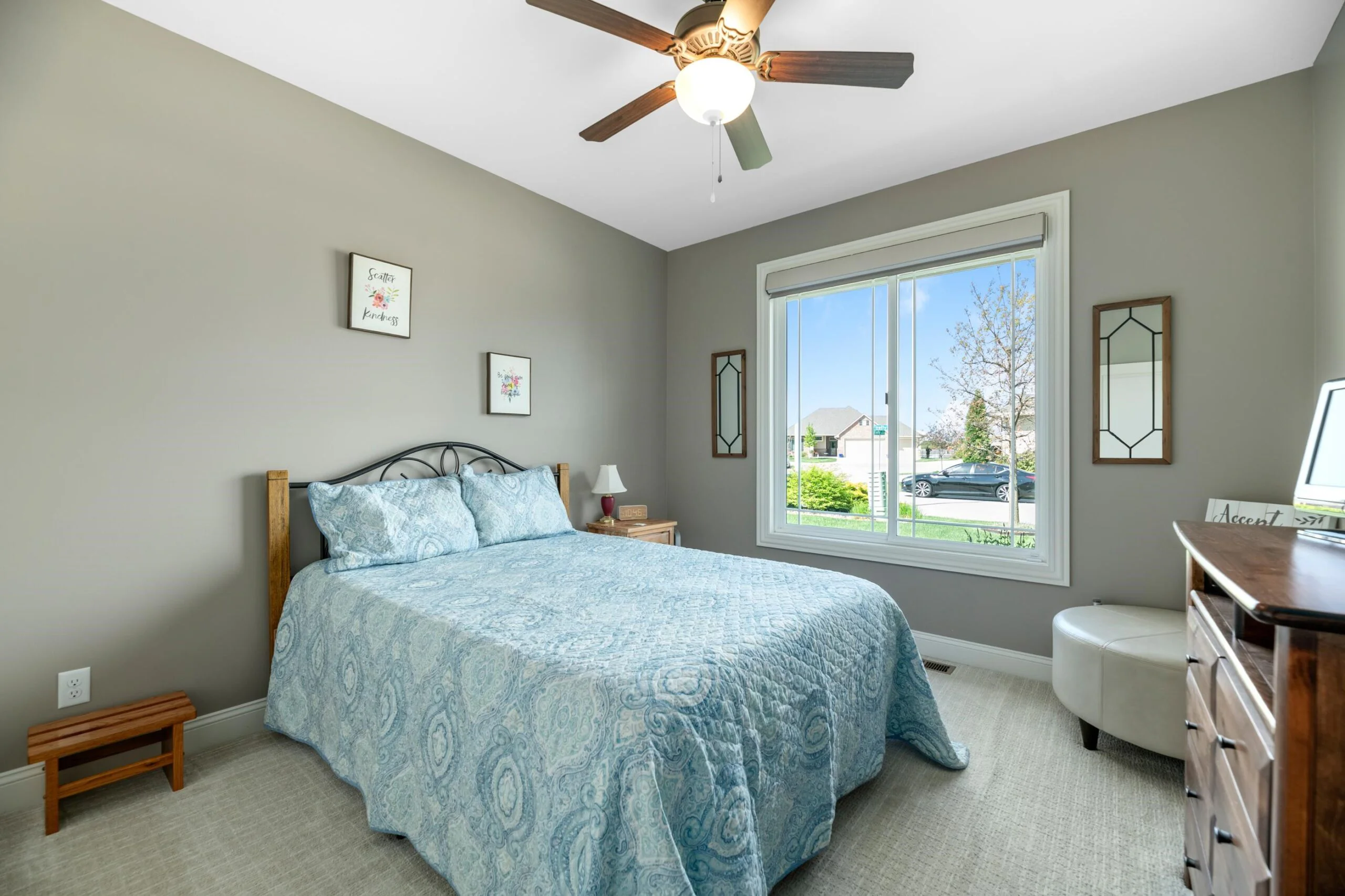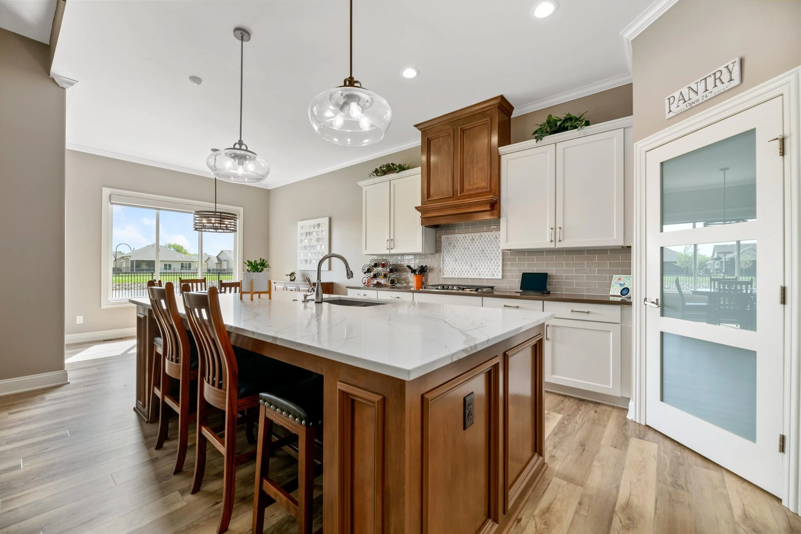 This beautiful custom-built patio home on a lake lot boasts luxury features and designer finishes at every turn. A stunning entry foyer with lighted barrel ceiling welcomes you into a great room with stone fireplace, beamed ceilings and electric window coverings. The kitchen design will bring out your inner chef with large island, gas cooktop, pull out shelves in the kitchen and large pantry with space for all your culinary needs. Retreat to the primary suite complete with lighted coffer ceiling, separate vanities, tiled shower, spacious and access to the laundry room for added convenience. Enjoy your morning coffee or evening cocktail on covered screened patio with shading and peaceful lake views. The additional patio is perfect for grilling. Unfinished basement with 8’ ceiling gives you flexibility to finish more living space and lots of storage. The 3 car garage is insulated and includes a mini split system. HOA dues include lawn care, snow removal, pool, and clubhouse. Schedule your showing today!