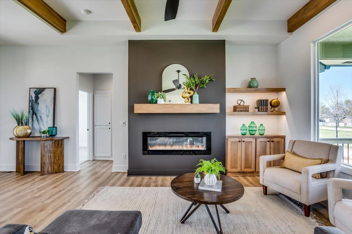 MODEL IS NOW FOR SALE! Welcome to The Oakley by M&M Construction in Henwick! This thoughtfully designed home features an inviting open-concept layout with an 11-foot ceiling in the living room, enhanced by wood beams for an extra touch. The accent-painted wall surrounding the electric fireplace creates a striking focal point, framed by cabinetry and floating shelves with integrated lighting. The kitchen boasts a custom range hood, a spacious walk-in pantry, and a an extra side space perfect for a coffee bar. The primary suite offers a retreat with a 10-foot beamed ceiling and a spa-like ensuite featuring a zero-entry tile shower with dual showerheads and valves. Designed for comfort and efficiency, the home includes an upgraded HVAC system. There is a convenient drop zone just inside the garage entry to the home. Outside to enjoy the 14-by-10 covered deck, perfect for relaxing or entertaining. The front exterior showcases additional brick detailing and striking black-framed windows for enhanced curb appeal. Quartz countertops throughout the home including the pantry. The finished basement expands the living space with a large family room, complete with a wet bar and island—ideal for gatherings. Two additional bedrooms and a full bath complete the lower level, making it a perfect space for guests or family. Information deemed reliable but not guaranteed and may change without notice. Specials and generals may not be entirely spread yet on this lot There is a $250 mailbox fee collected at closing.