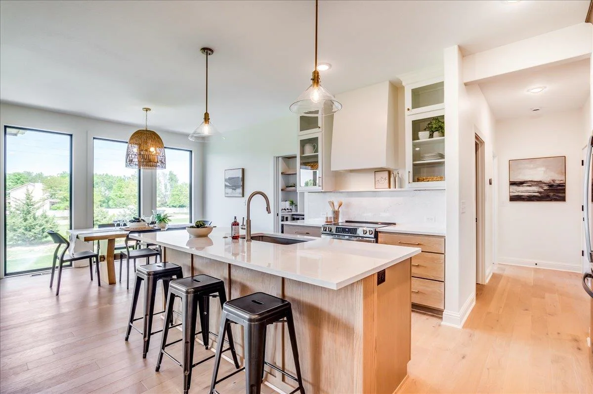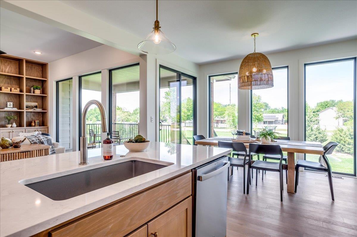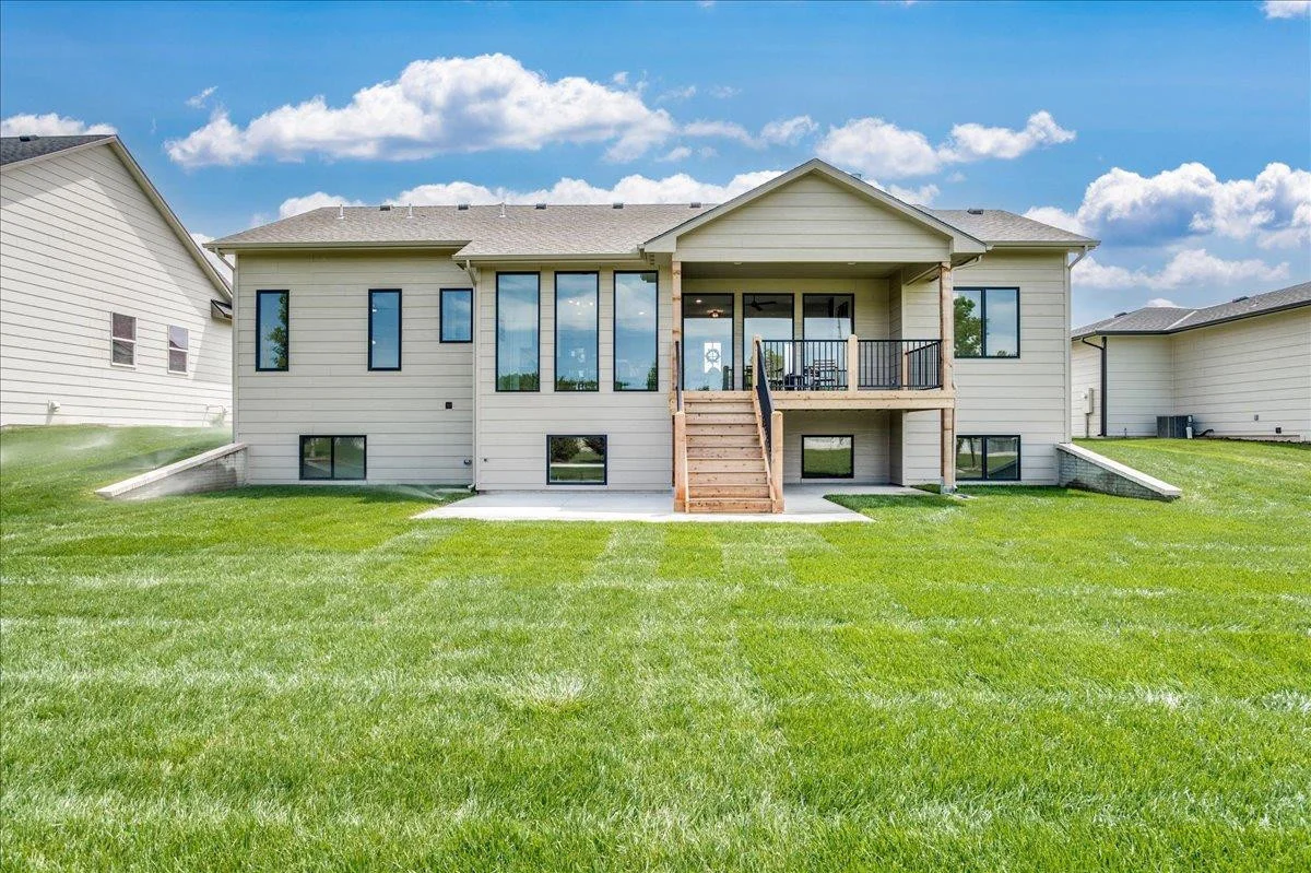 Former model home now for sale in Henwick featuring the popular Dylan plan by Prairie Construction Homes. Inviting front porch and open layout with floor-to-ceiling windows providing abundant natural light. Living room with fireplace, built-in shelving, and cabinetry. Kitchen offers extensive cabinet storage, ample countertop space, and a chef’s pantry with beverage fridge, microwave, built-in drawers, and bottle storage. Separate office with built-ins. Mudroom drop zone with bench off oversized garage and dedicated laundry room. Primary suite includes walk-in closet with built-in dresser, tile shower, and windows for natural light. Finished basement with large family room and wet bar. Lighted stairs to lower level. 5 bedrooms plus office, 3 bathrooms, oversized garage. All this in the much desired Maize School District! Information deemed reliable but not guaranteed and may change without notice. Room sizes may be estimated. Taxes are shown on vacant lot. Specials may not be entirely spread yet and are shown as estimates. There is a $250 mailbox key collected at closing.