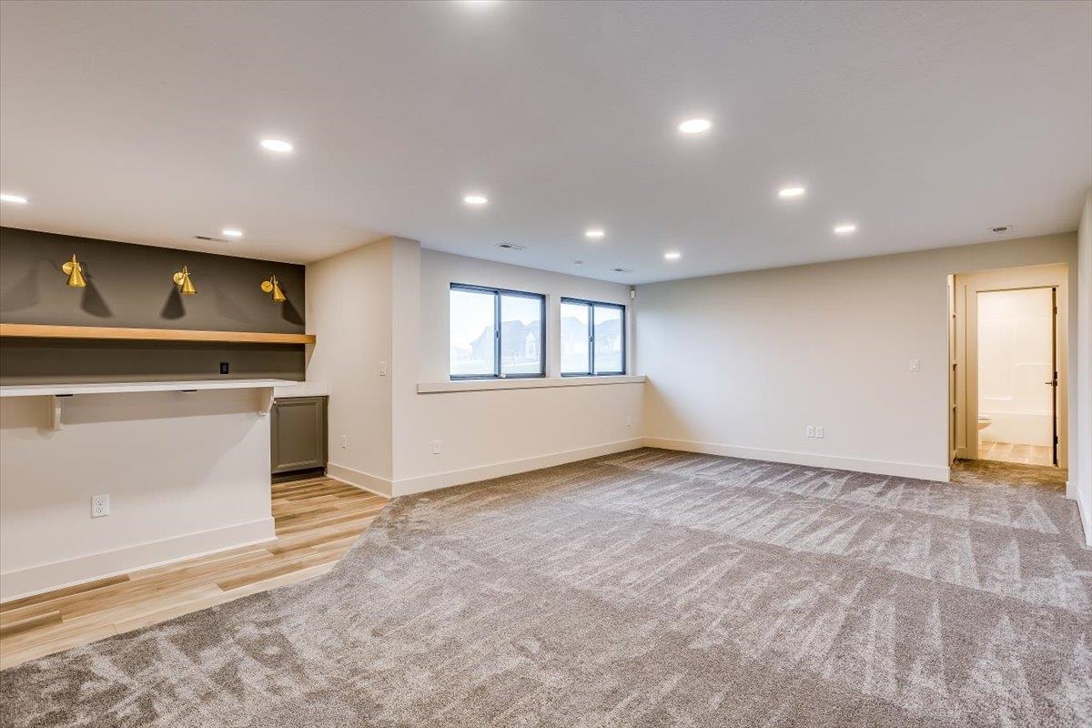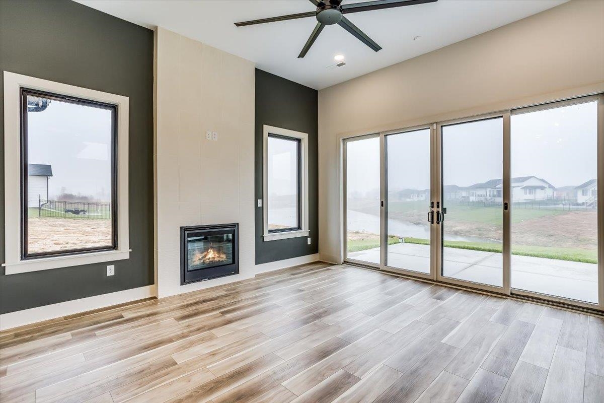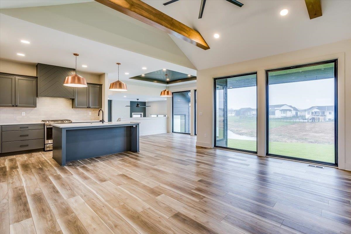- Description: Stunning wood trim on front adds the WOW factor to this 5 bedroom 3 bath "Stewart" flex plan located on the lake in Henwick! Floor to ceiling windows capture all the natural light and let you enjoy the lake views. Vaulted ceiling with beams in living adds to spaciousness. Dark kitchen cabinets tie in to the modern color scheme and add a touch of modern warmth. You'll love the featured ceiling in dining! Large pantry with ample countertop and shelves. Primary suite is located on one entire wing of the home, and gains entry thru double door entry. Tile shower and slipper tub in master bath create a spa like experience. Open shelving for beauty and convenience. Main floor family room/sunroom (flex area) opens to the outdoor living to take advantage of the lake lot. Basement is totally finished with family room and wet bar, bath, and 2 more bedrooms, one of which has large walk in closet. This lot maintained is actually larger than what is shown on Sedgwick County. Information deemed reliable but not guaranteed and may change without notice. Specials are not be entirely spread on this lot so estimates shown. There is a $250mailbox fee collected at closing. Seller is licensed real estate agent in Kansas.